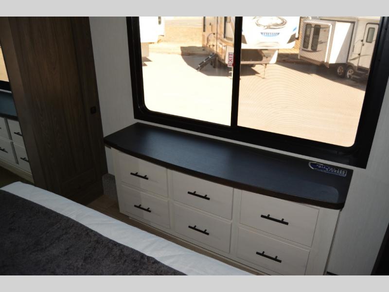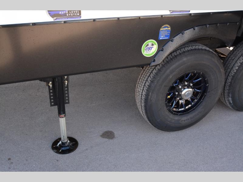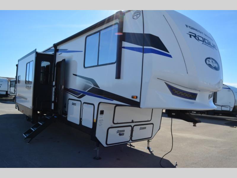 Every one of these Forest River Vengeance Rogue Armored fifth wheel toy haulers come with the features you want most at an affordable price tag! The DuraPoxy gas/oil resistant floor has 5,000 lb. tie downs to ensure your toys will arrive safely without damaging the flooring, plus the 3,000 lb. rated ramp door makes it easy to load them. Two 15,000 BTU A/Cs are "Super H Ducted" to keep you cool even on the hottest summer days, and an Armored underbelly keeps your unit's vitals protected all year long. The Rogue Ready package comes with a six point leveling system, a power MAXX storage system, a TST tire pressure monitoring system, and many more stand-out features. And don't overlook the Rogue Premium Package with an 8' weatherproof ramp door, an exterior TV hookup for the option to add a television, blue accent wheels, and solar reflective safety glass windows to name a few conveniences.