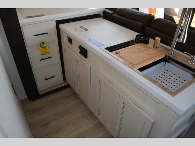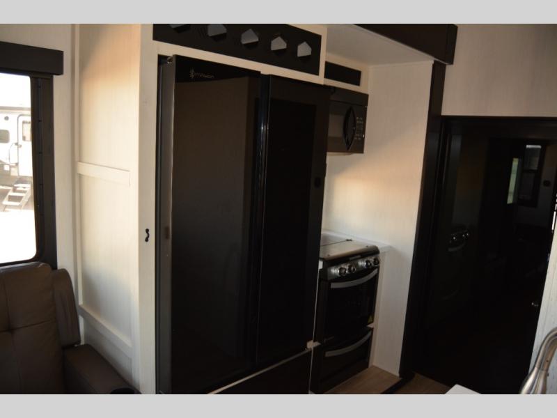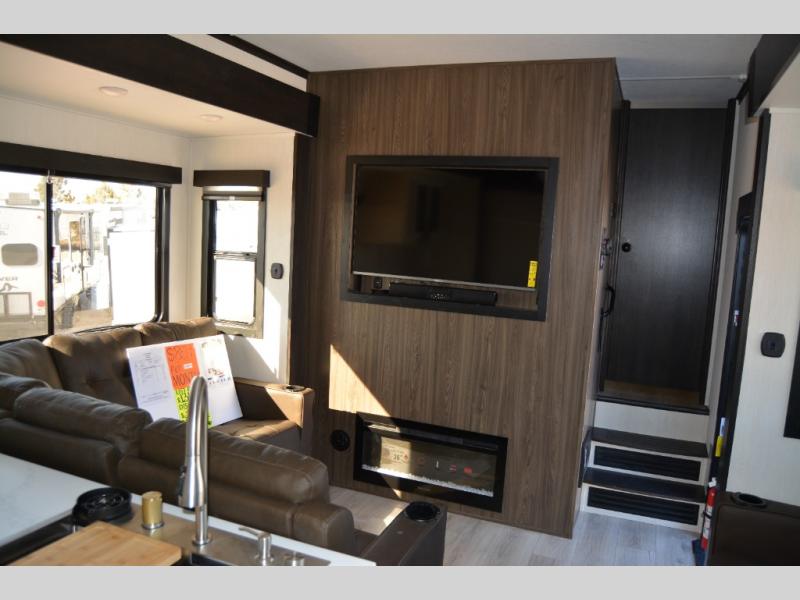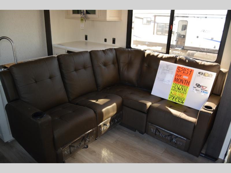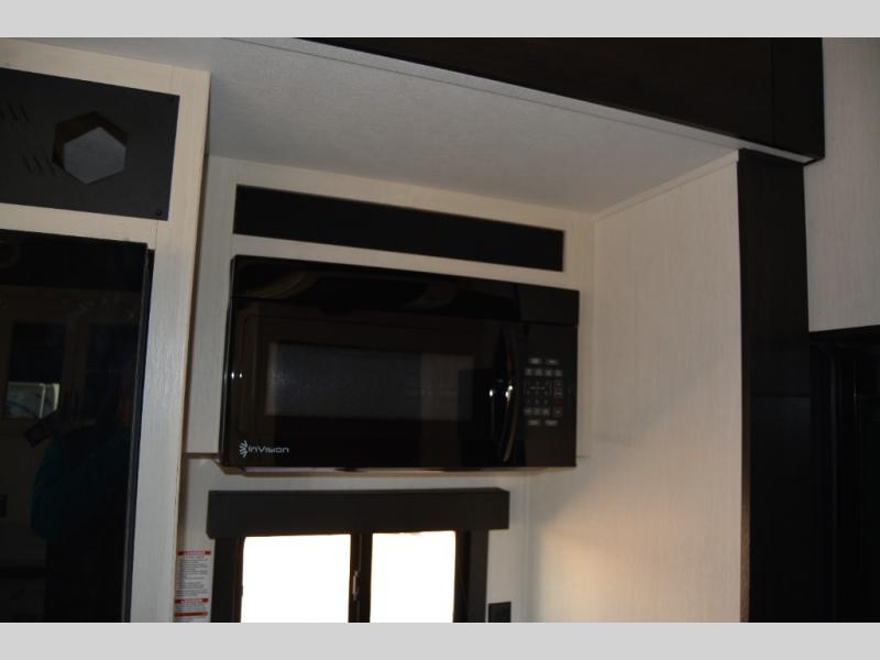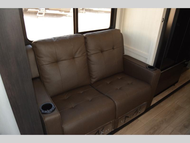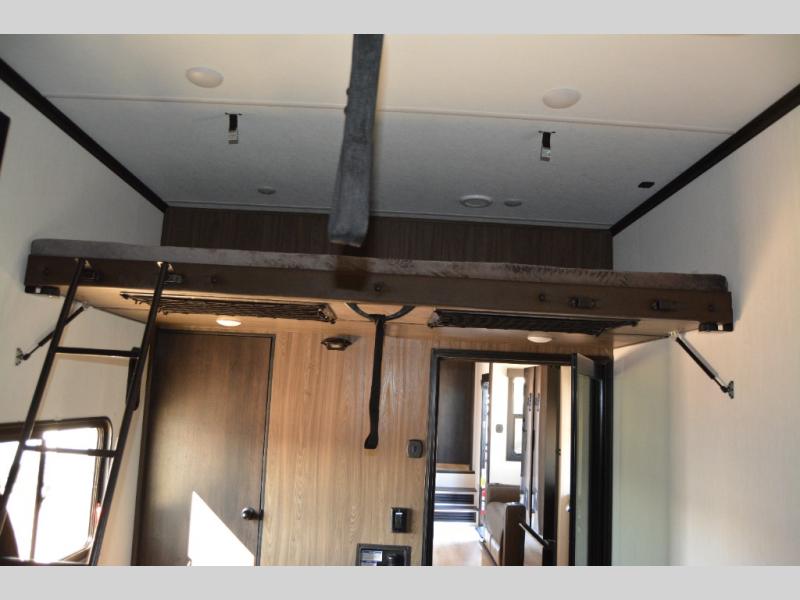 Hit the trails with this triple slide out toy hauler! Once your dirt bikes are unloaded from the 14' 6" garage, you can relax on the dual flip-up sofas with a free-standing table. There is also a raised queen bed above the sofas, a wet bath plus a loft, making this space perfect for guests! The chef of your group will find a counter peninsula to prep meals, a 12V black glass residential style refrigerator, plus a 30" microwave when you need to heat up leftovers. Your crew can get comfortable on the L-shaped sofa or the second sofa, and there is a large flat screen TV for movie night! Head up front to the master bedroom that includes a king bed slide out, a large front wardrobe and a dresser with a TV hookup, plus your own private full bathroom!