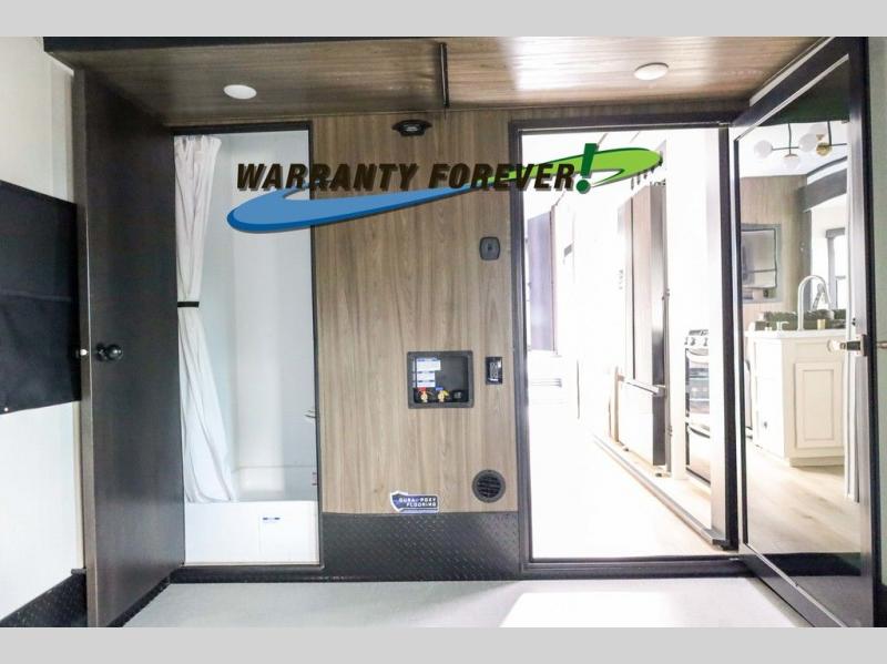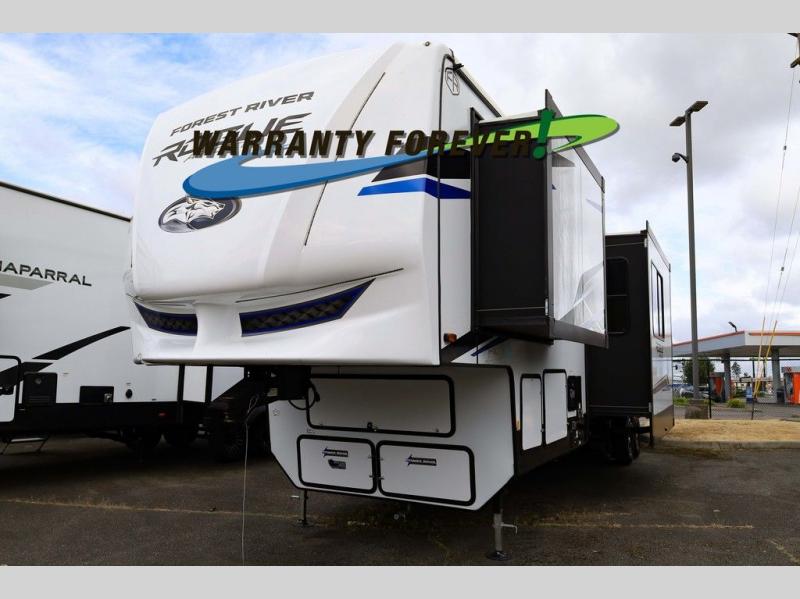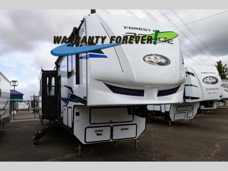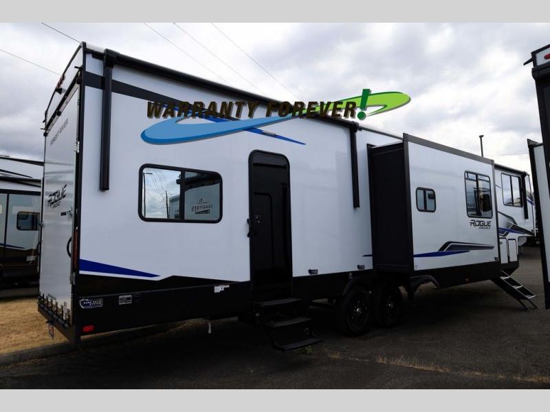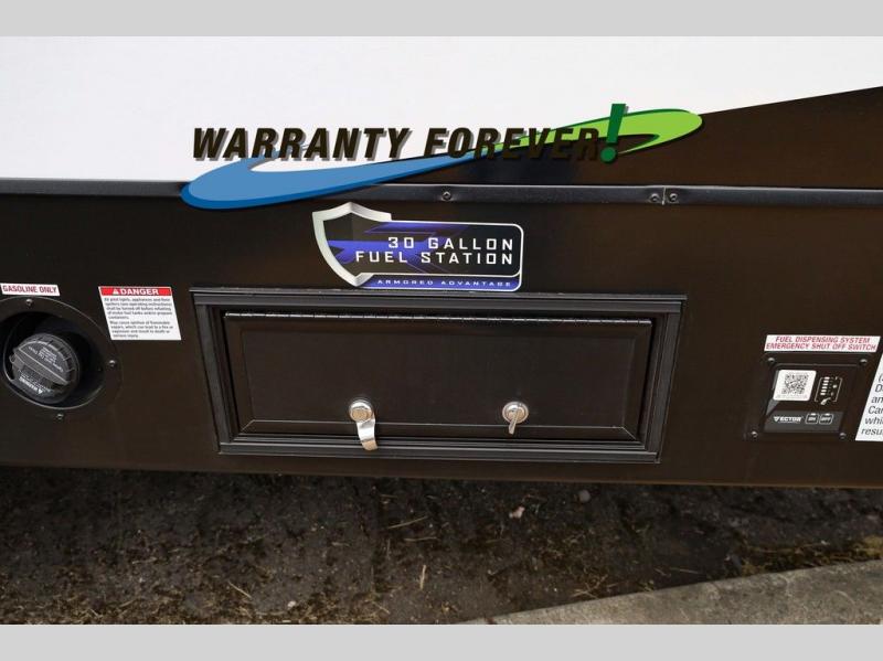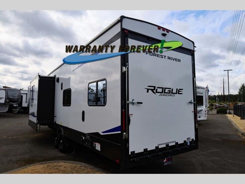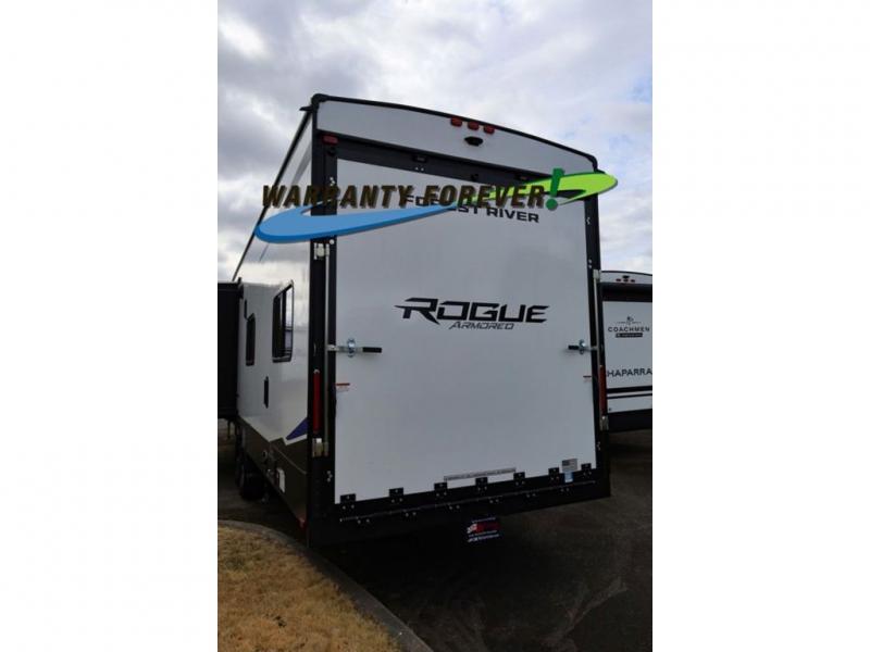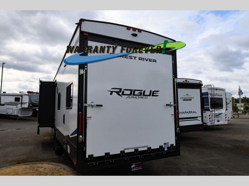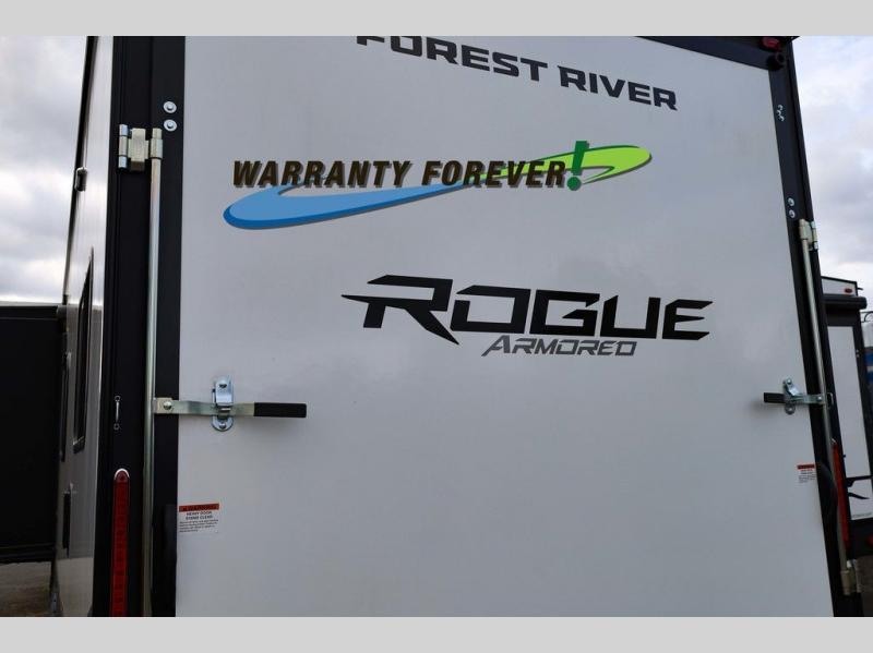 Every one of these Forest River Vengeance Rogue Armored fifth wheel toy haulers come with the features you want most at an affordable price tag! The DuraPoxy gas/oil resistant floor has 5,000 lb. tie downs to ensure your toys will arrive safely without damaging the flooring, plus the 3,000 lb. rated ramp door makes it easy to load them. Two 15,000 BTU A/Cs are "Super H Ducted" to keep you cool even on the hottest summer days, and an Armored underbelly helps keep your unit's vitals protected. The Rogue Ready package comes with a six point leveling system, a power MAXX storage system, a TST tire pressure monitoring system, and many more stand-out features. And don't overlook the Rogue Premium Package with an 8' weatherproof ramp door, an exterior TV hookup for the option to add a television, blue accent wheels, and solar reflective safety glass windows to name a few conveniences.