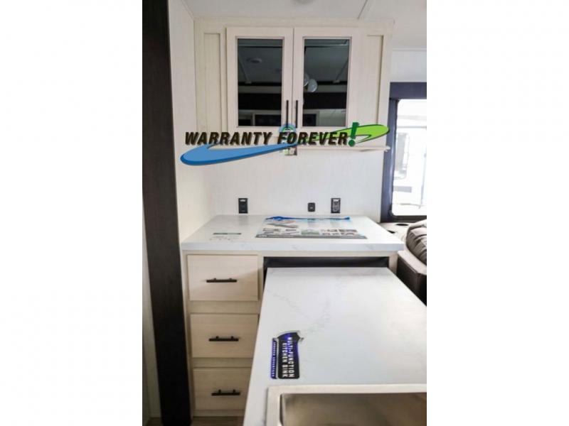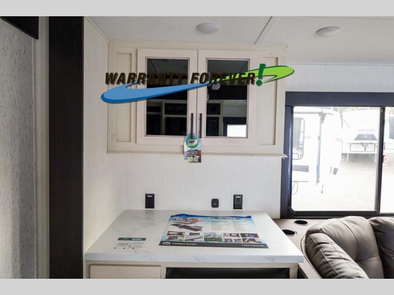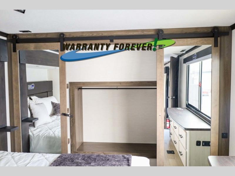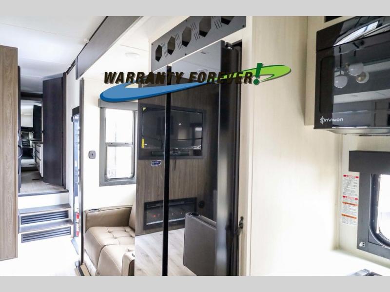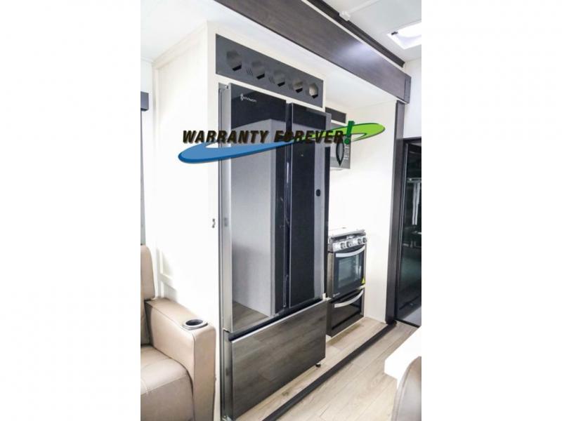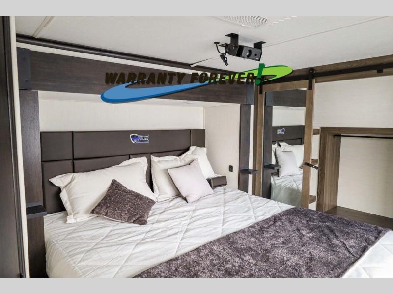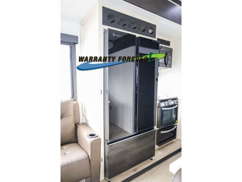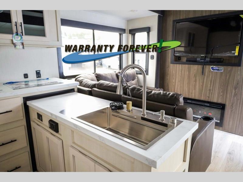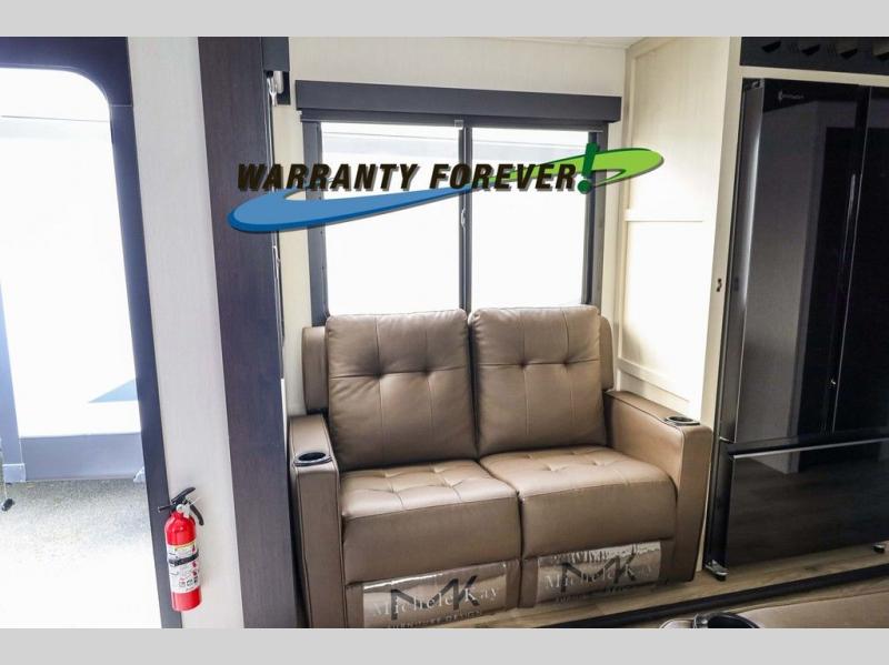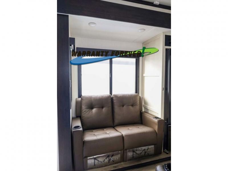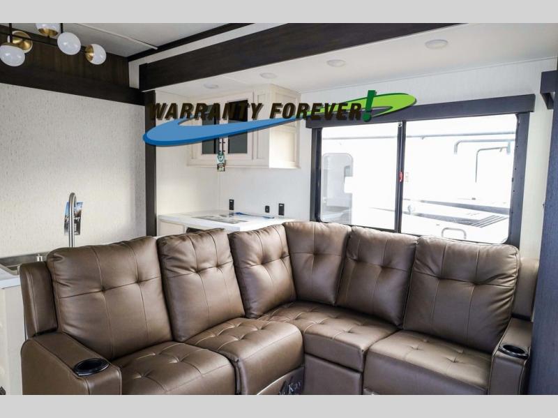 Hit the trails with this triple slide out toy hauler! Once your dirt bikes are unloaded from the 14' 6" garage, you can relax on the dual flip-up sofas with a free-standing table. There is also a raised queen bed above the sofas, a wet bath plus a loft, making this space perfect for guests! The chef of your group will find a counter peninsula to prep meals, a 12V black glass residential style refrigerator, plus a 30" microwave when you need to heat up leftovers. Your crew can get comfortable on the L-shaped sofa or the second sofa, and there is a large flat screen TV for movie night! Head up front to the master bedroom that includes a king bed slide out, a large front wardrobe and a dresser with a TV hookup, plus your own private full bathroom!