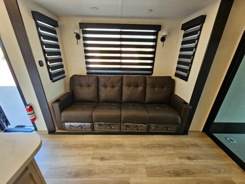Everyone will stay clean with a bath and a half in this fifth wheel toy hauler! The front private bedroom has a 72" x 80" king bed slide to lay your head on at night, a front wall wardrobe, a dresser to keep your clothes looking nice, plus an entrance into the bathroom. The kitchen has a counter peninsula to prepare your meals, and a 16 cu. ft. 12V black glass residential-style refrigerator to store any leftovers. The garage area has a loft, opposing flip-up sofas with a table in between and a raised queen bed above them, as well as a second entry door and an area prepped to add an optional washer and dryer!