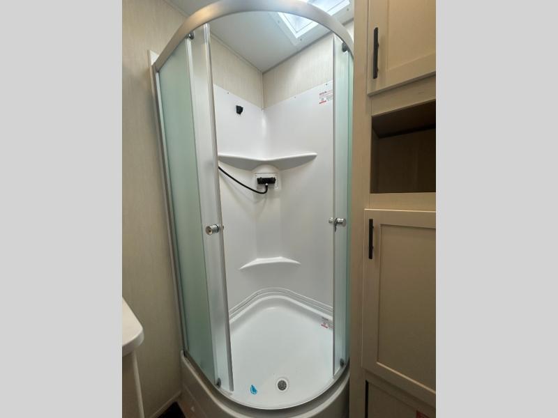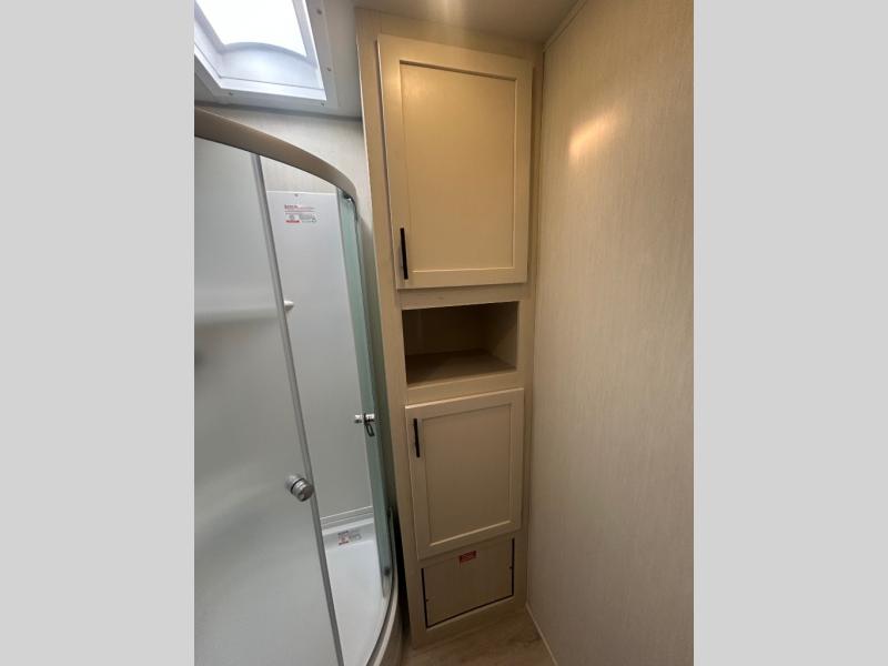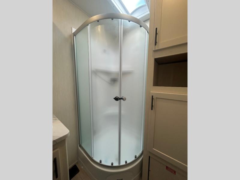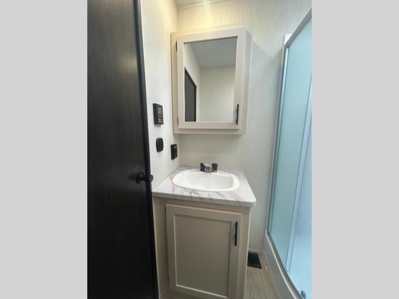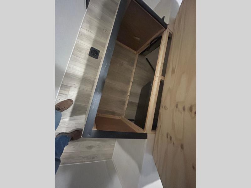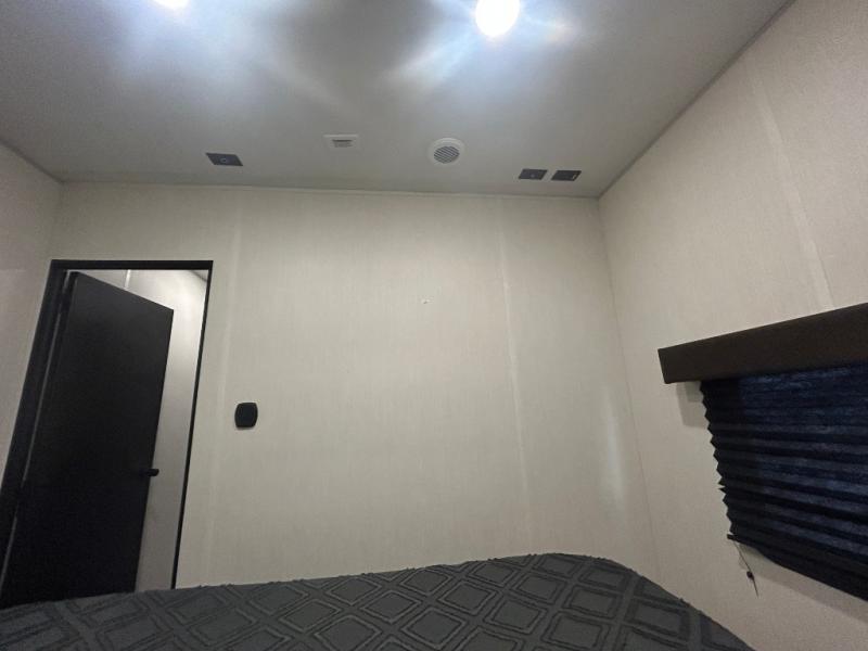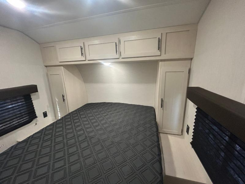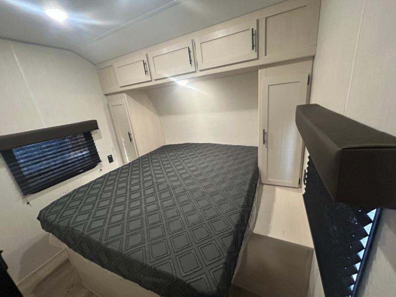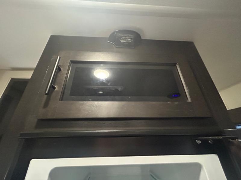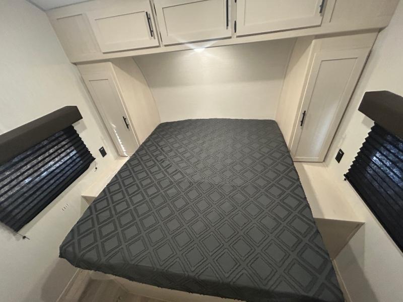 You'll love camping in this toy hauler with 14' 1" total garage space when you use the space in the kitchen. There are two roll-over sofas with a quick set queen bed system above where you can relax during the day and let guests stay overnight. A three burner range with an oven and a 1000 watt microwave will let you prepare lunch after a trail ride, and the full bath with a radius shower will be waiting for you to clean up. Head up to the front to enjoy the private bedroom with a king bed, dual wardrobes, and overhead storage for all your gear.
