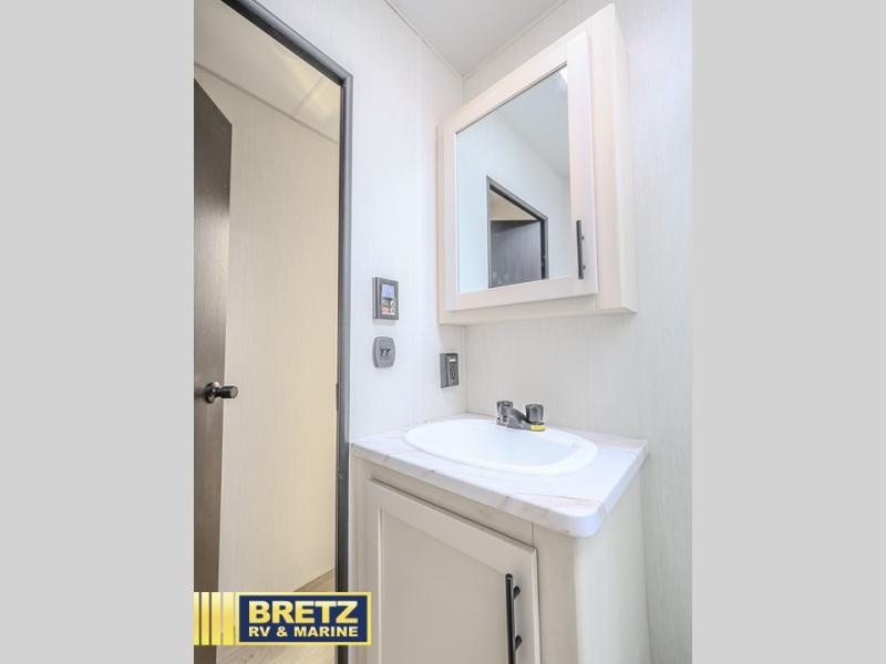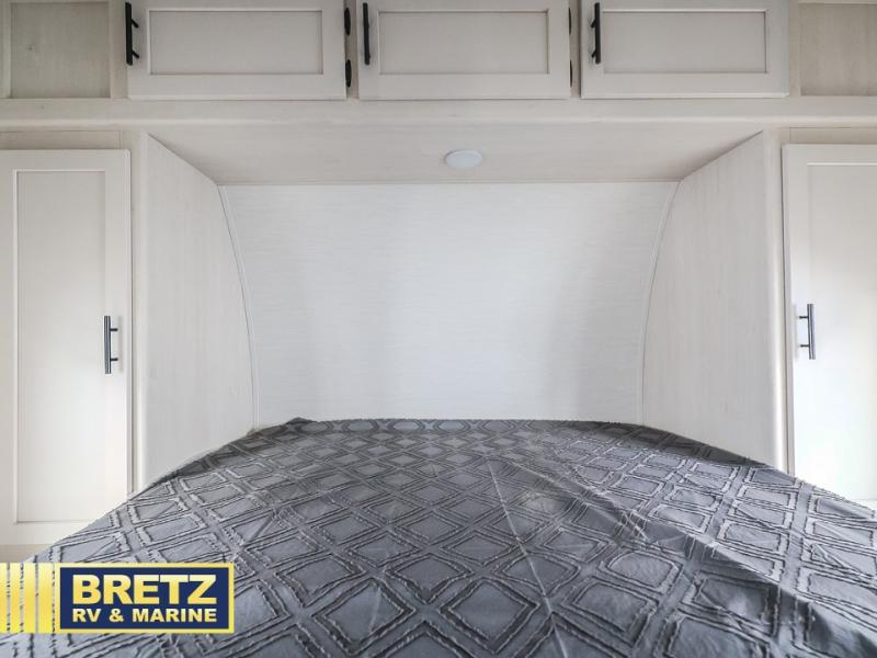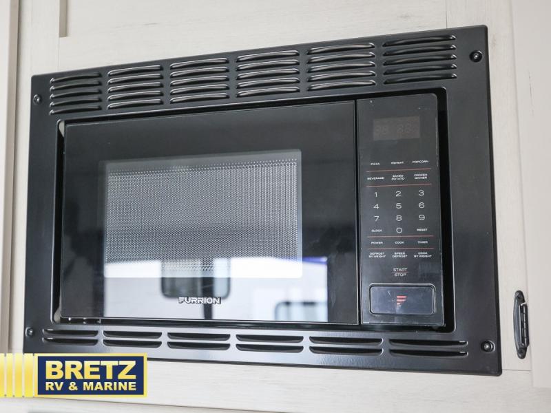 You'll love camping in this toy hauler with 14' 1" total garage space when you use the space in the kitchen. There are two roll-over sofas with a quick set queen bed system above where you can relax during the day and let guests stay overnight. A three burner range with an oven and a 1000 watt microwave will let you prepare lunch after a trail ride, and the full bath with a radius shower will be waiting for you to clean up. Head up to the front to enjoy the private bedroom with a king bed, dual wardrobes, and overhead storage for all your gear.