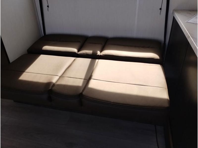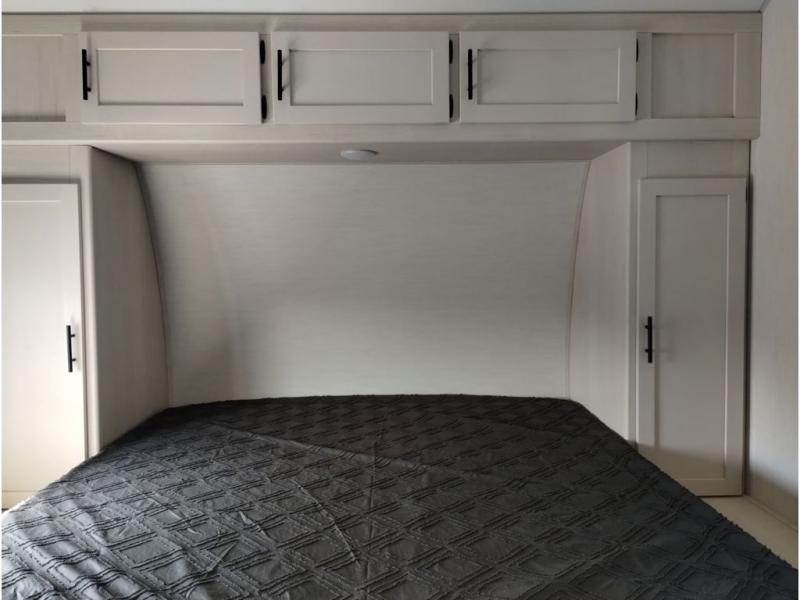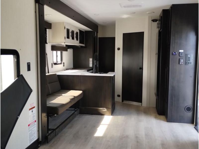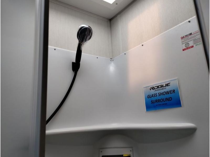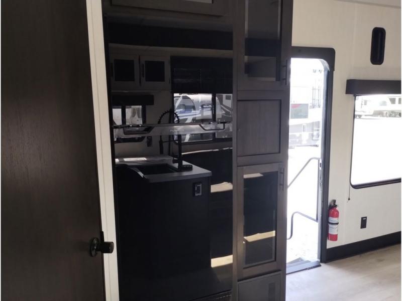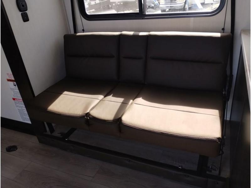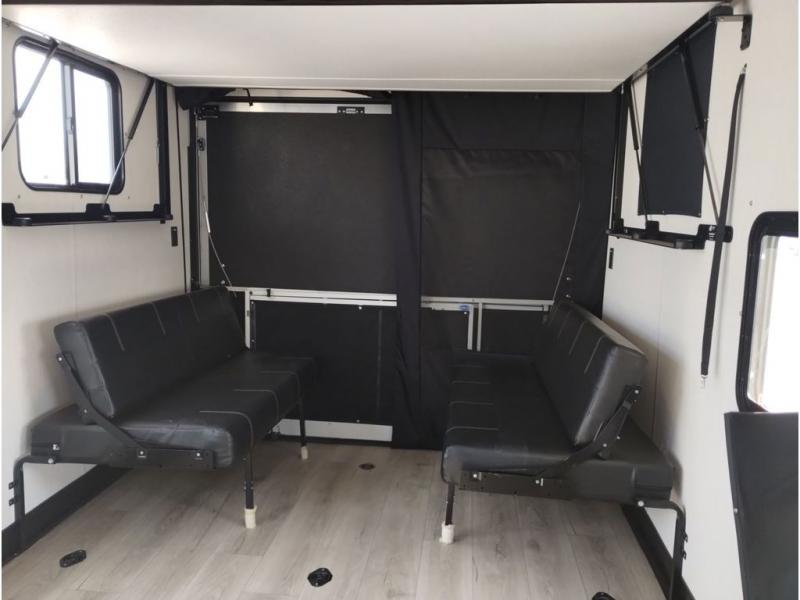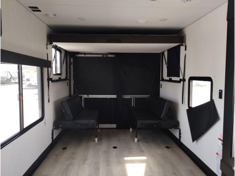 You're going to love this spacious toy hauler with a kitchen slide out! There is a 10' 6" garage with 15' 10" total garage space if you include the main living area where the flip-up sofa and optional lounge chairs are. Once your toys are unloaded, your crew can relax on the roll-over sofas, and at night they can sleep on the quick set queen bed system. You will enjoy the front master bedroom with a Rogue king bed, dual wardrobes, and a private entrance into the dual entry bath!