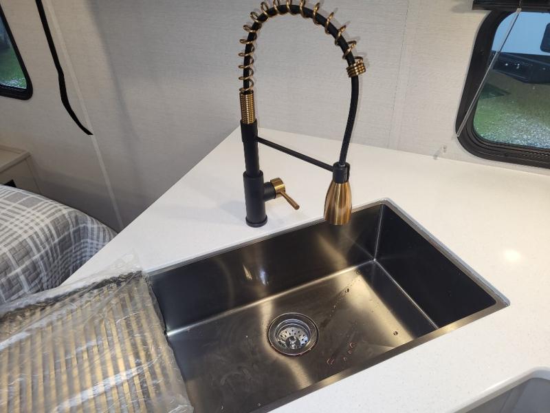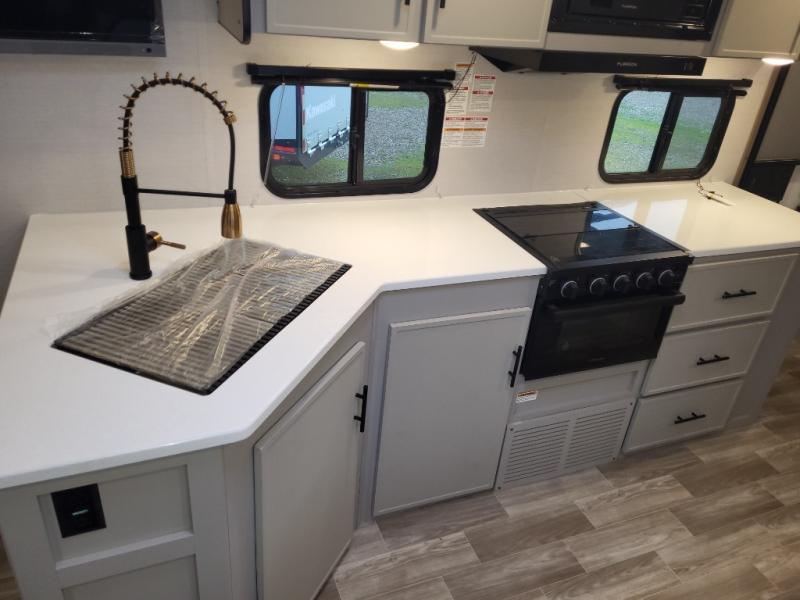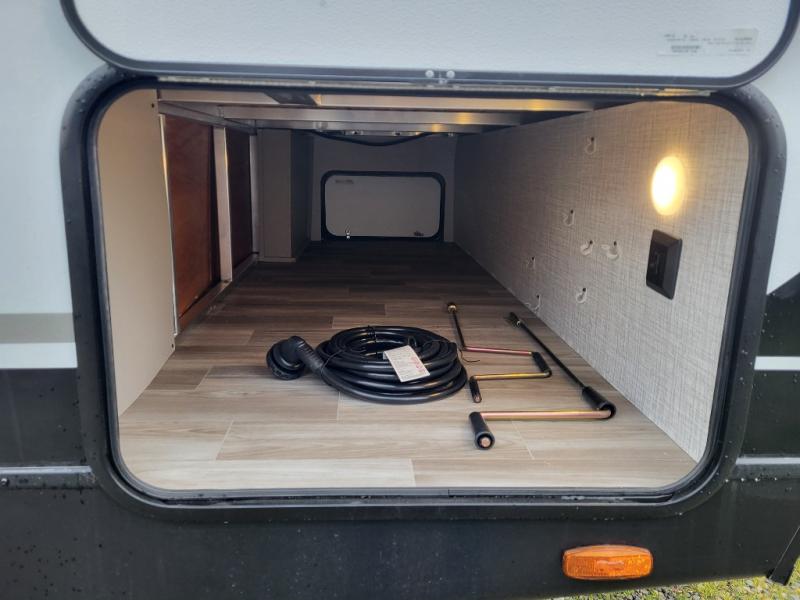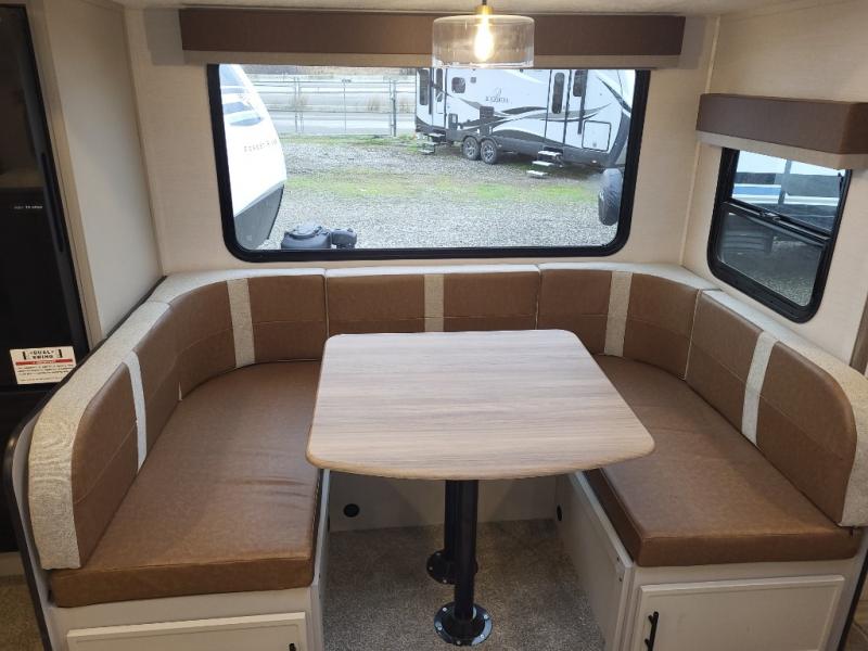 You and your spouse will love camping in this dual axle travel trailer. There is a queen bed up front for a great night's rest each night, and if the grandkids tag along, they can sleep on the U-shaped dinette. The chef of your group will appreciate ample counter space to prepare breakfast and a large stainless steel sink for easy clean up. The 10 cu. ft. gas/electric refrigerator can store your milk and eggs, plus there is a pantry for dry goods and snacks! Head outside to sit under the 16' electric awning with LED lights, or grab the lawn games from the large pass-through storage!