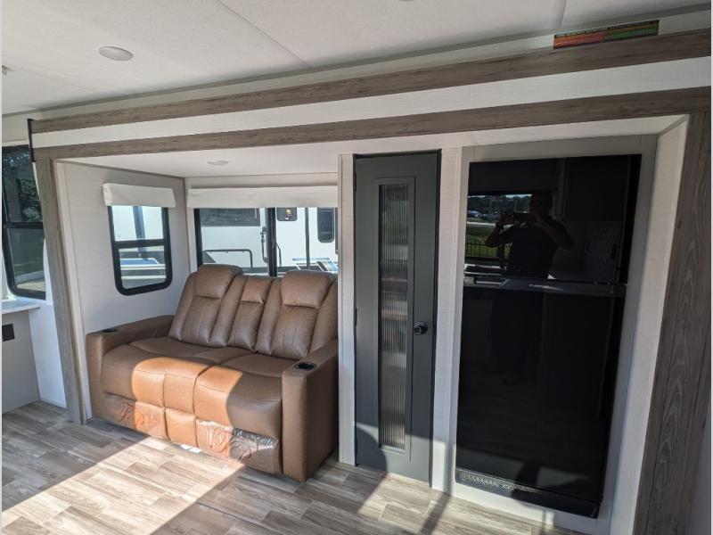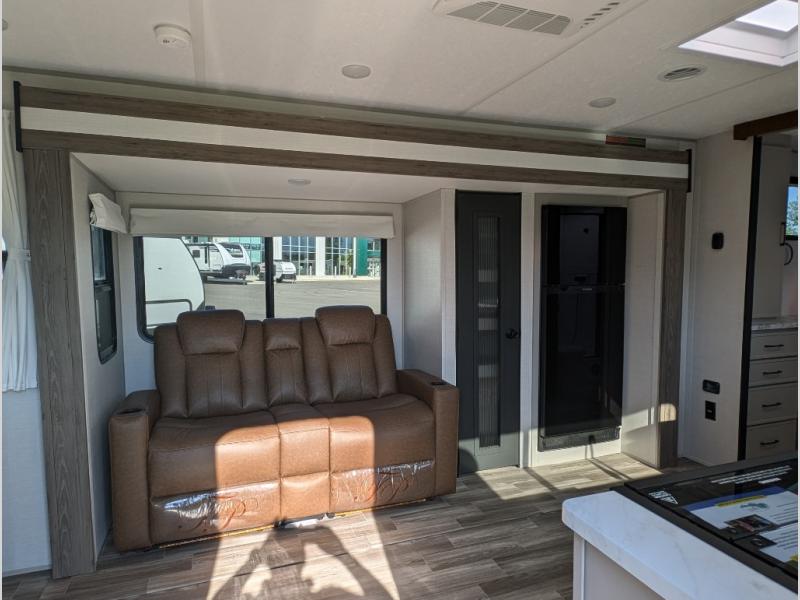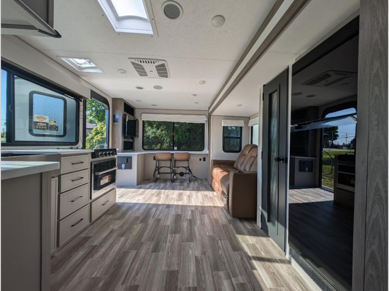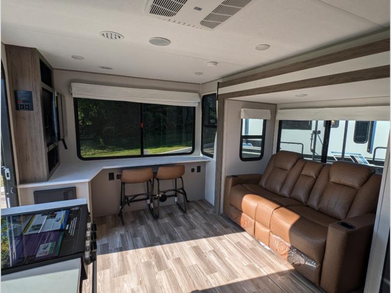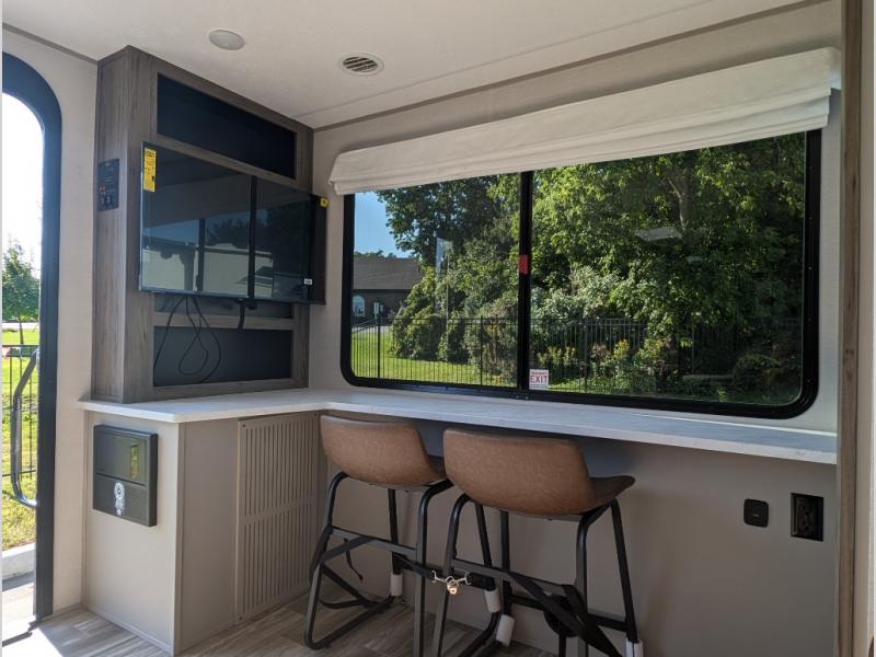 You'll love camping trips in this couple's trailer! The rear of this unit includes a full-width bar top with two stools, and in the corner there is a 40" TV with shelves for movies or books. You can relax comfortably on the theater seating that is close by the pantry and 12V residential refrigerator to grab a snack. A walk-through bath is spacious so you can easily clean up each day, and the front master bedroom is sure to bring comfort. Here, you'll find a custom king bed with underbed storage, dual bedside closets, plus one of the two entry doors for added convenience!