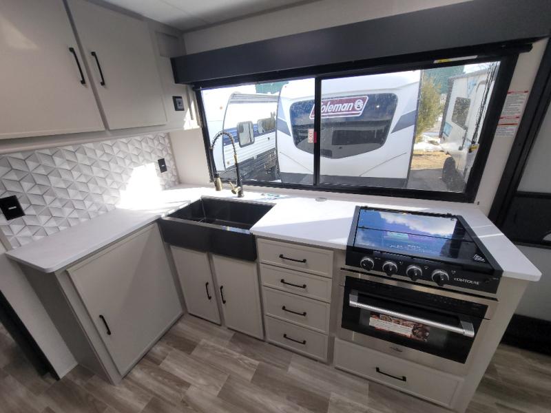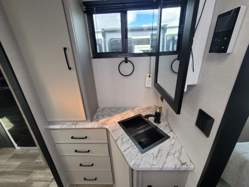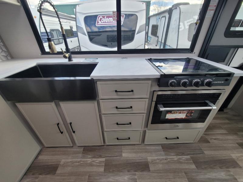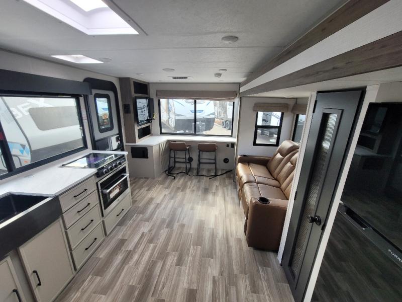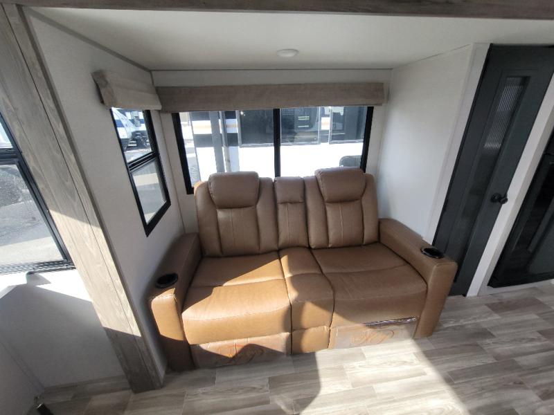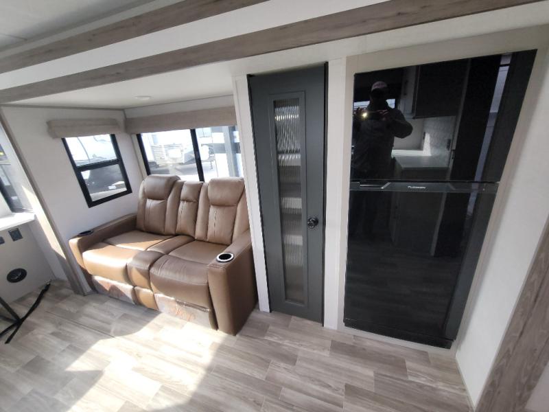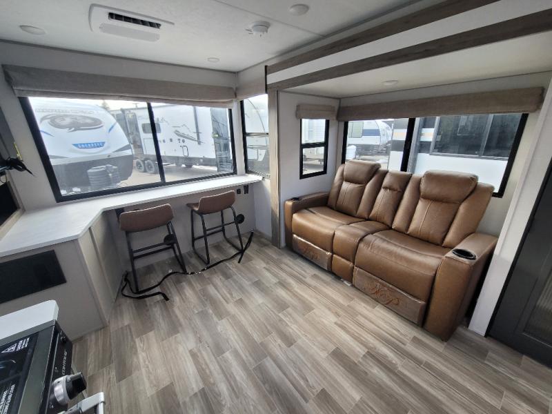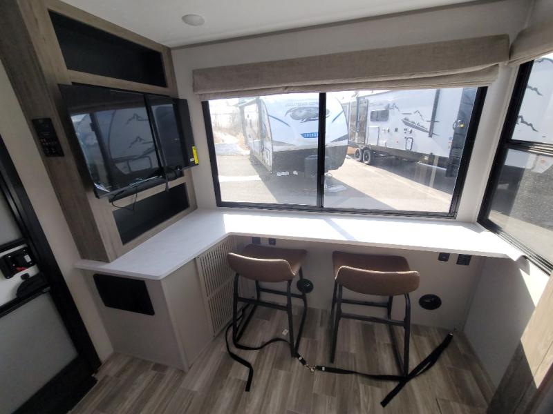 You'll love camping trips in this couple's trailer! The rear of this unit includes a full-width bar top with two stools, and in the corner there is a 42" TV with shelves for movies or books. You can relax comfortably on the theater seating that is close by the pantry and 12V residential refrigerator to grab a snack. A walk-through bath is spacious so you can easily clean up each day, and the front master bedroom is sure to bring comfort. Here, you'll find a custom king bed with underbed storage, dual bedside closets, plus one of the two entry doors for added convenience!