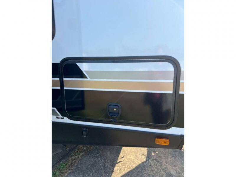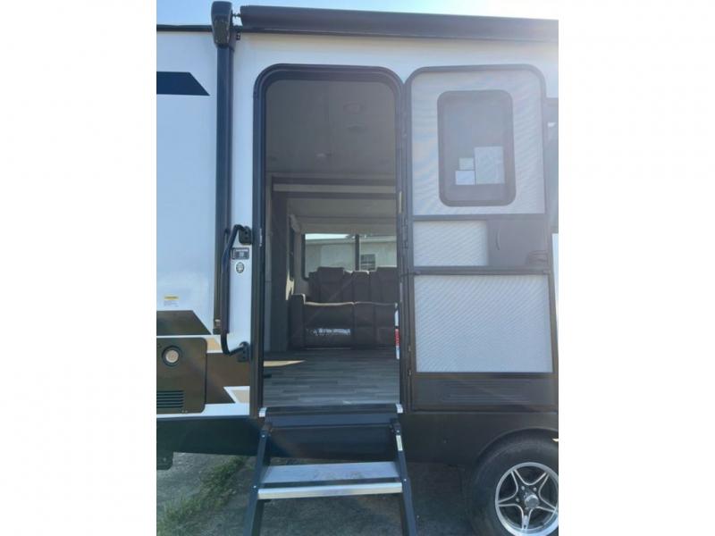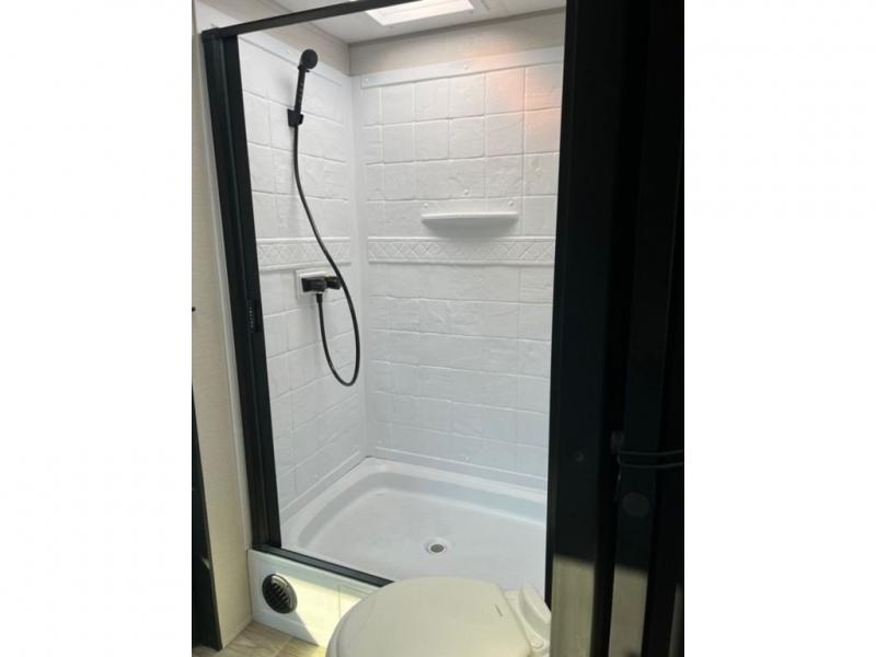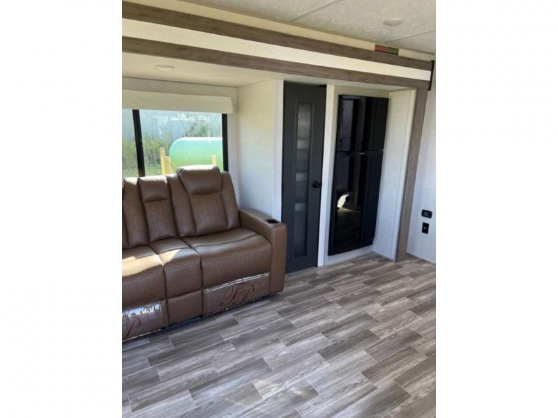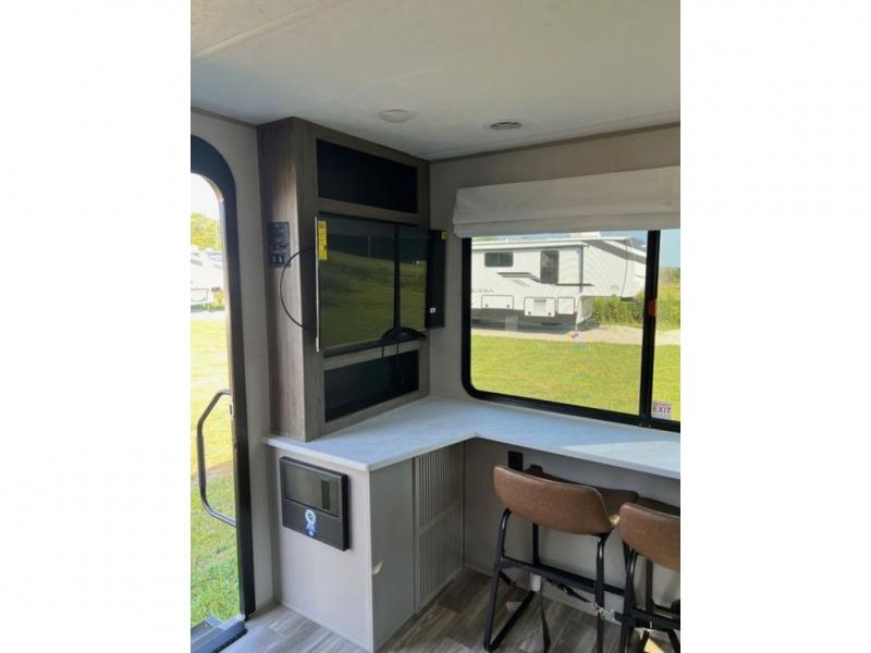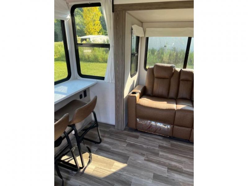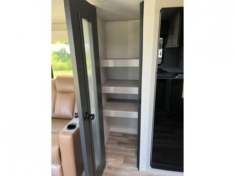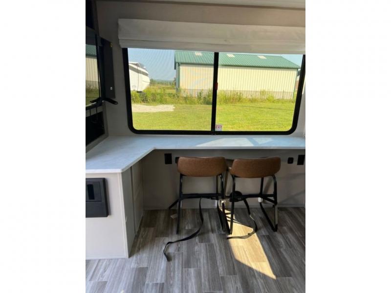 You'll love camping trips in this couple's trailer! The rear of this unit includes a full-width bar top with two stools, and in the corner there is a 40" TV with shelves for movies or books. You can relax comfortably on the theater seating that is close by the pantry and 12V residential refrigerator to grab a snack. A walk-through bath is spacious so you can easily clean up each day, and the front master bedroom is sure to bring comfort. Here, you'll find a custom king bed with underbed storage, dual bedside closets, plus one of the two entry doors for added convenience!