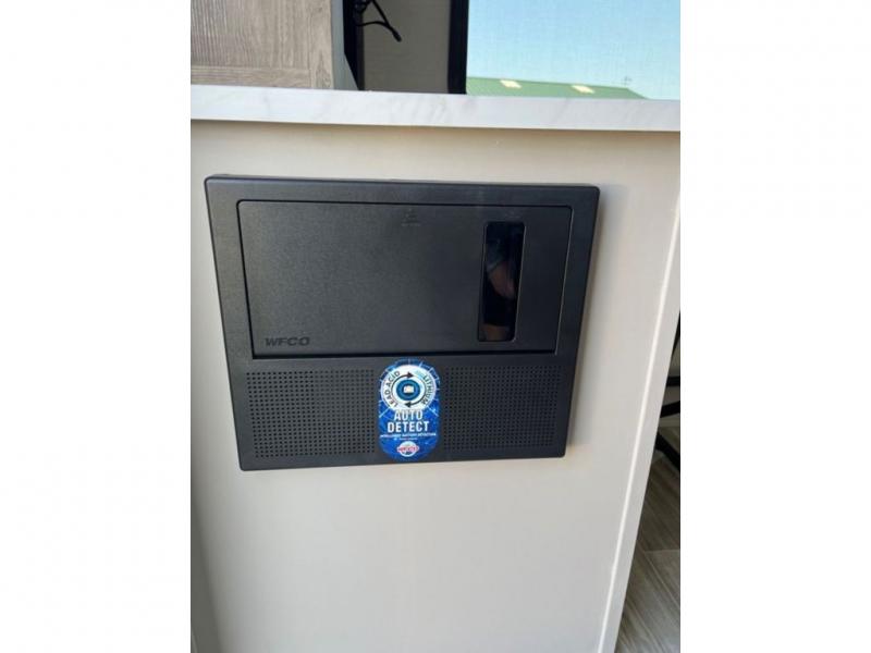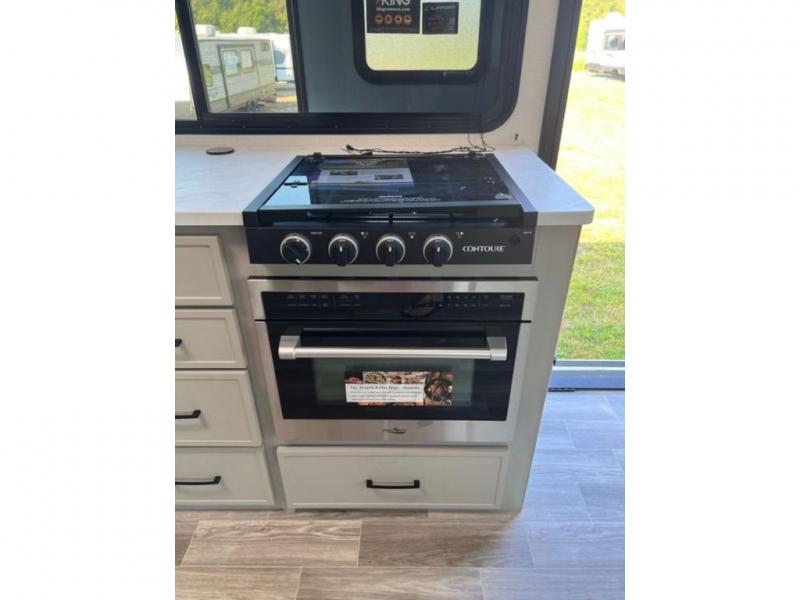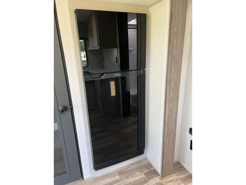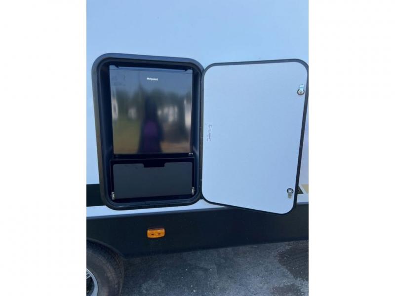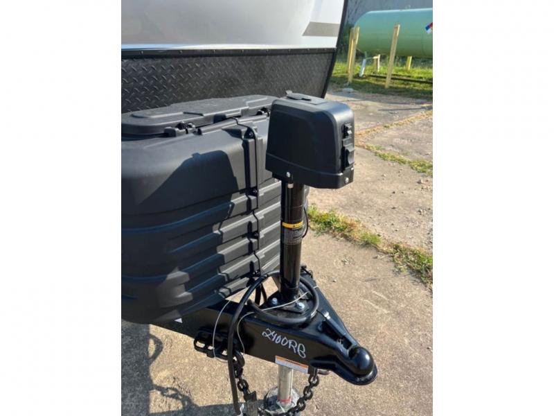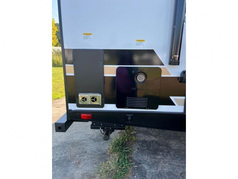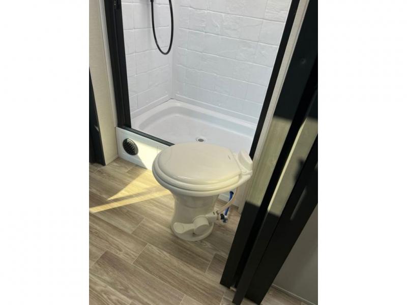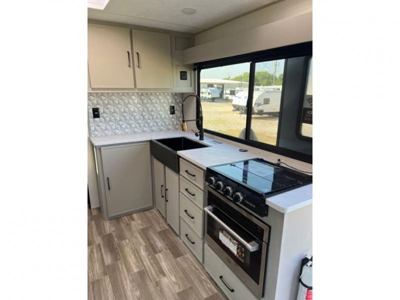 You'll love camping trips in this couple's trailer! The rear of this unit includes a full-width bar top with two stools, and in the corner there is a 40" TV with shelves for movies or books. You can relax comfortably on the theater seating that is close by the pantry and 12V residential refrigerator to grab a snack. A walk-through bath is spacious so you can easily clean up each day, and the front master bedroom is sure to bring comfort. Here, you'll find a custom king bed with underbed storage, dual bedside closets, plus one of the two entry doors for added convenience!
