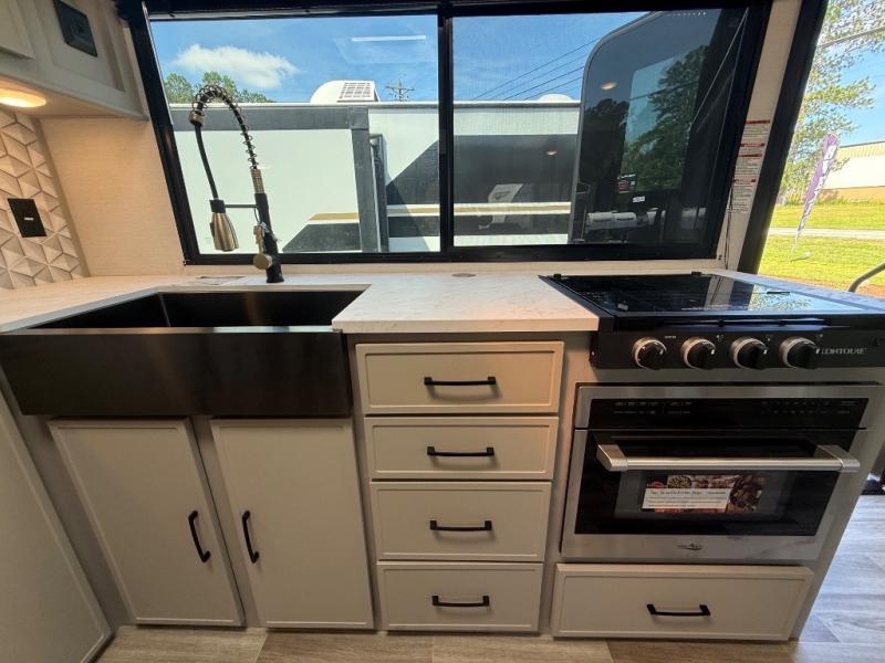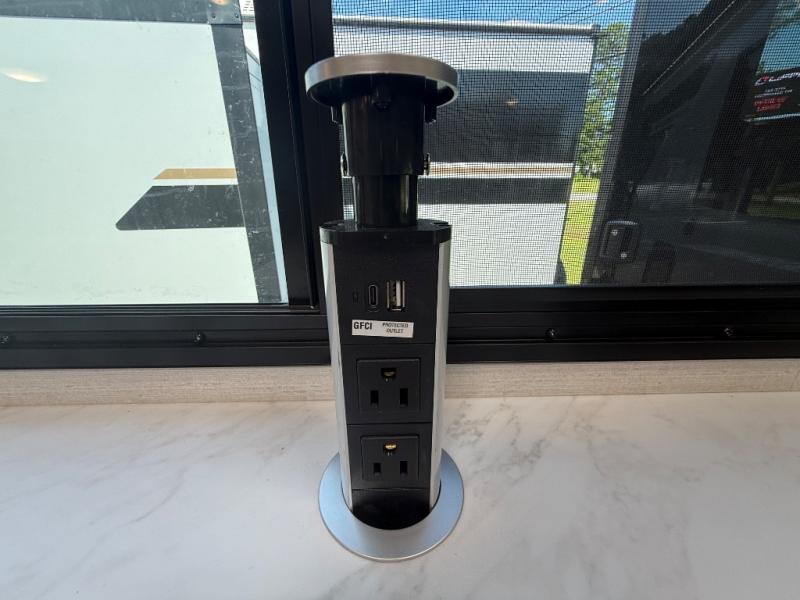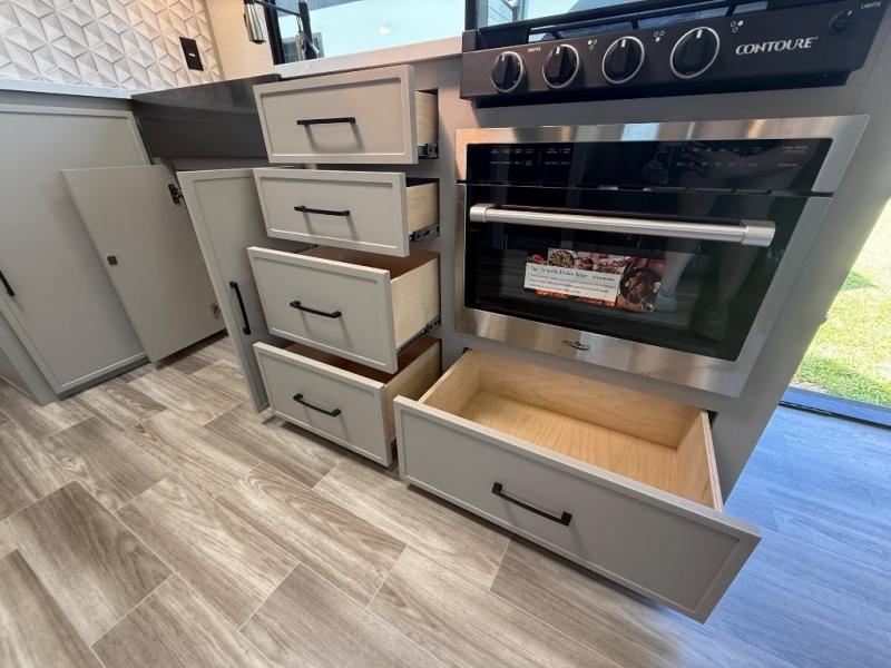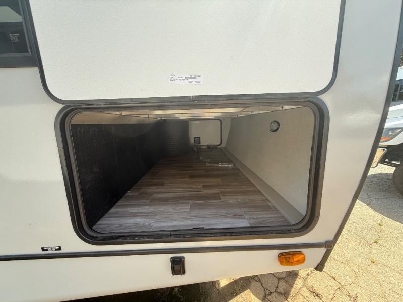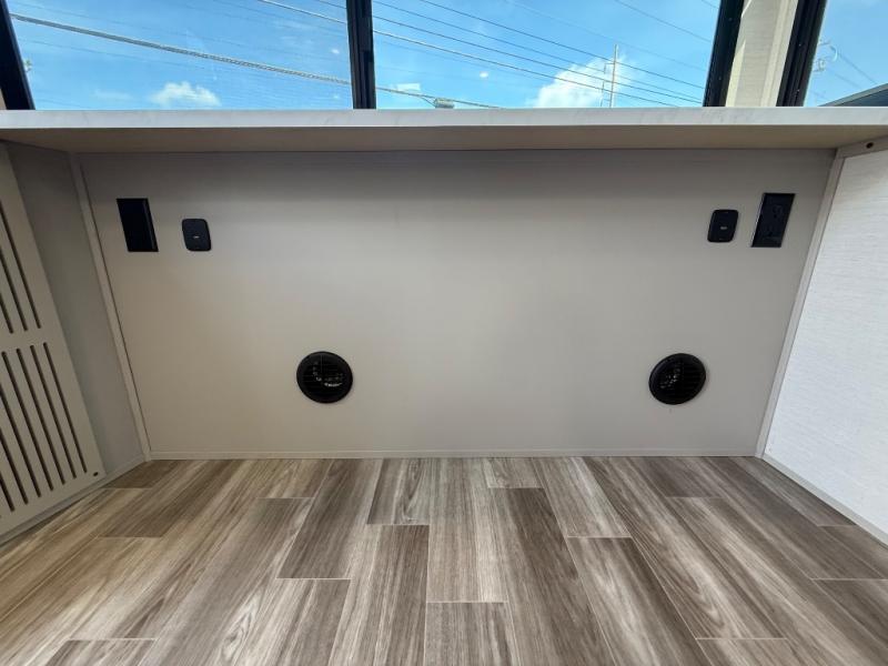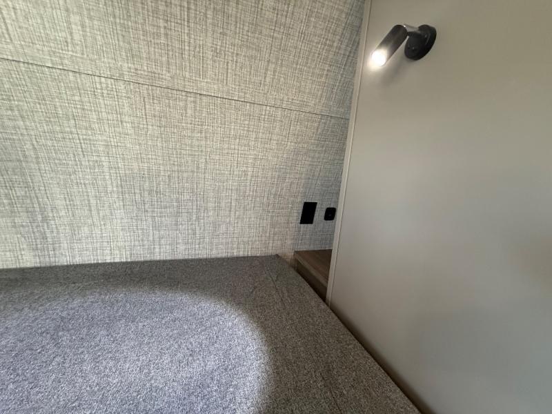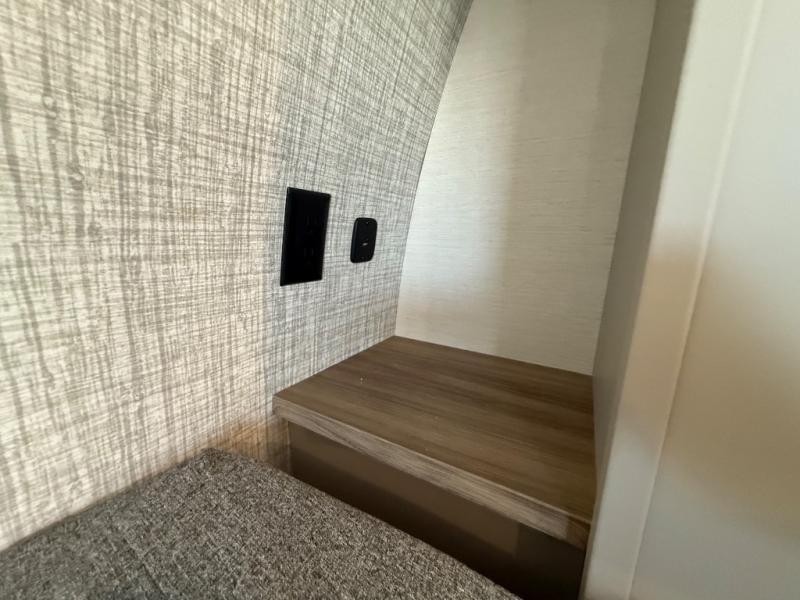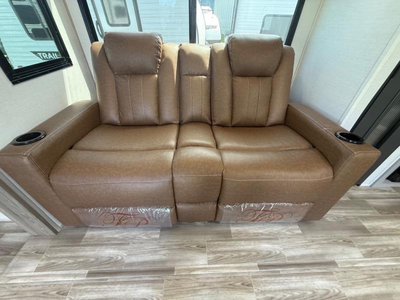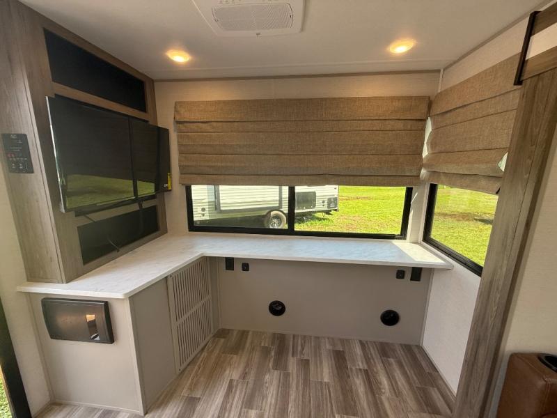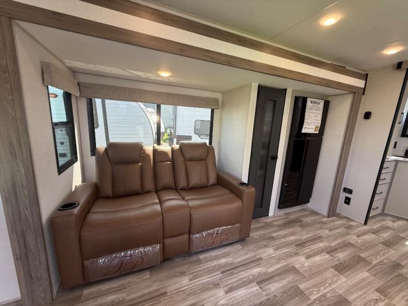 You'll love camping trips in this couple's trailer! The rear of this unit includes a full-width bar top with two stools, and in the corner there is a 40" TV with shelves for movies or books. You can relax comfortably on the theater seating that is close by the pantry and 12V residential refrigerator to grab a snack. A walk-through bath is spacious so you can easily clean up each day, and the front master bedroom is sure to bring comfort. Here, you'll find a custom king bed with underbed storage, dual bedside closets, plus one of the two entry doors for added convenience!
