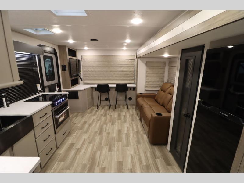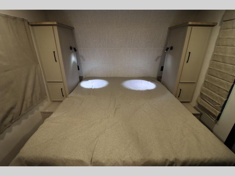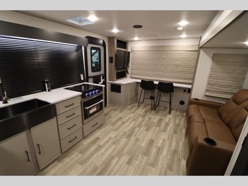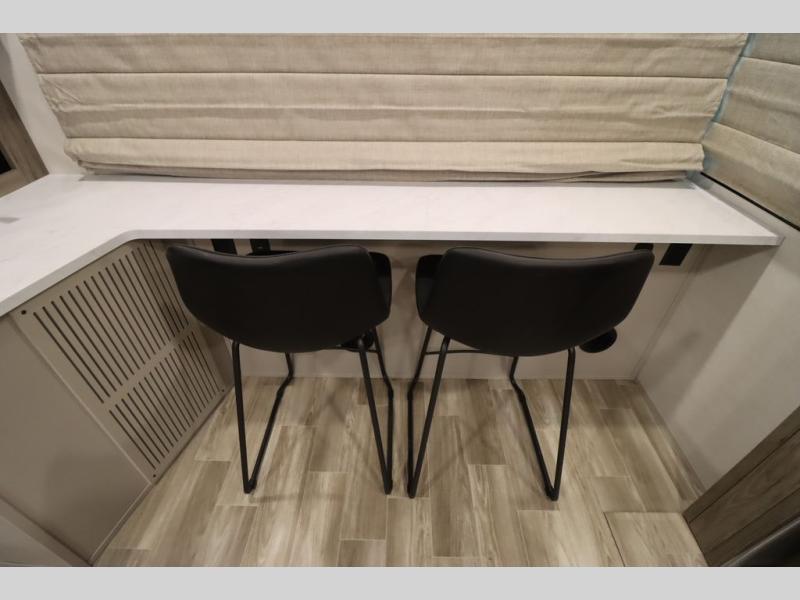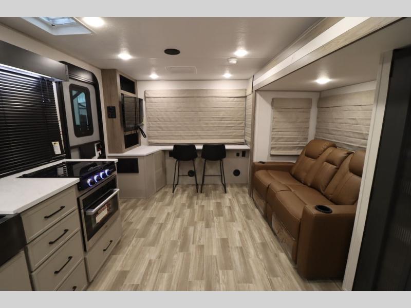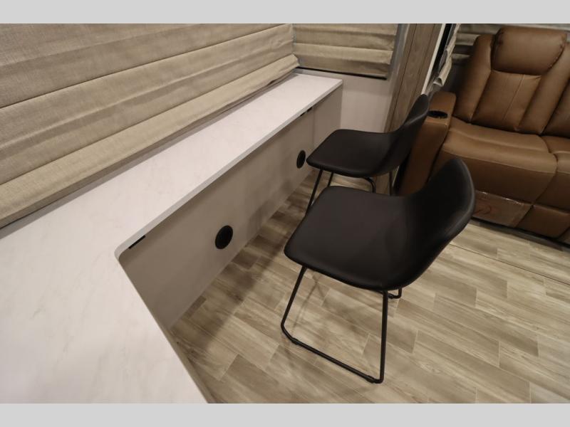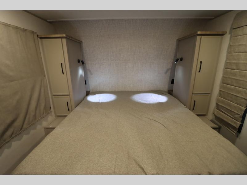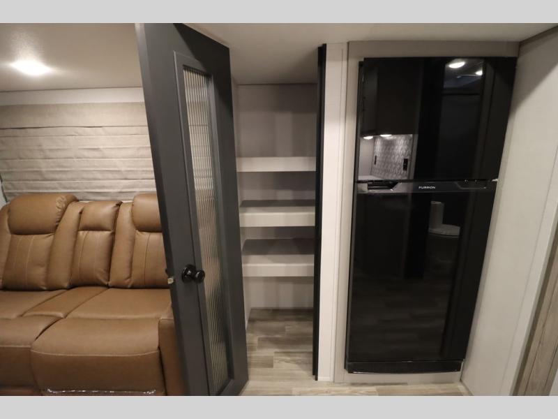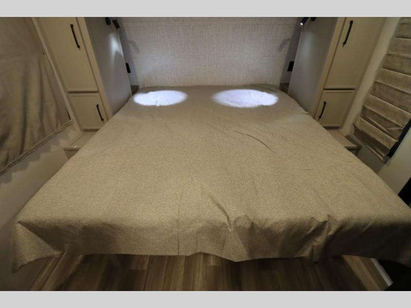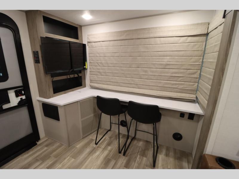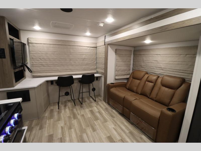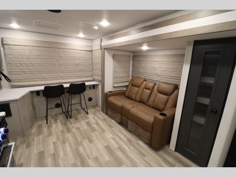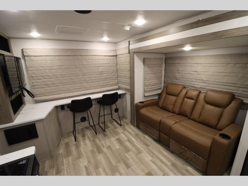 You'll love camping trips in this couple's trailer! The rear of this unit includes a full-width bar top with two stools, and in the corner there is a 40" TV with shelves for movies or books. You can relax comfortably on the theater seating that is close by the pantry and 12V residential refrigerator to grab a snack. A walk-through bath is spacious so you can easily clean up each day, and the front master bedroom is sure to bring comfort. Here, you'll find a custom king bed with underbed storage, dual bedside closets, plus one of the two entry doors for added convenience!