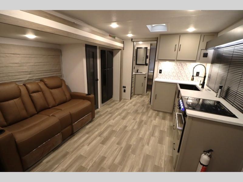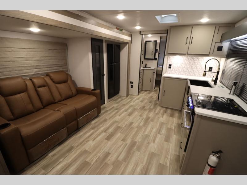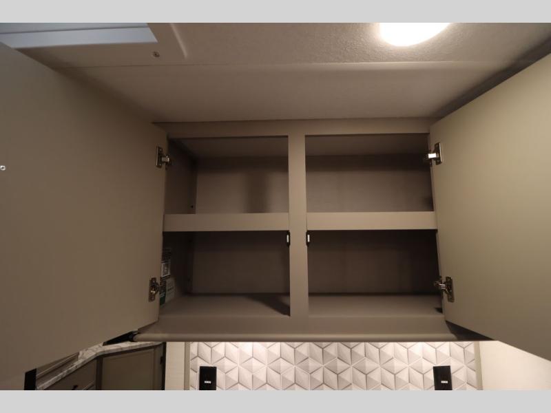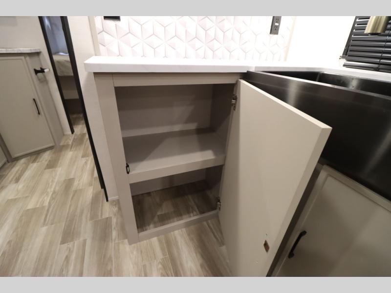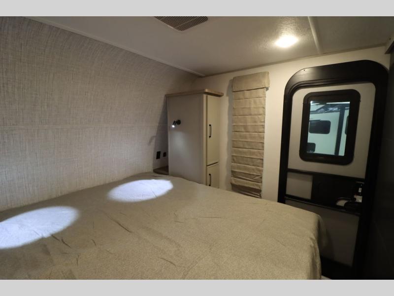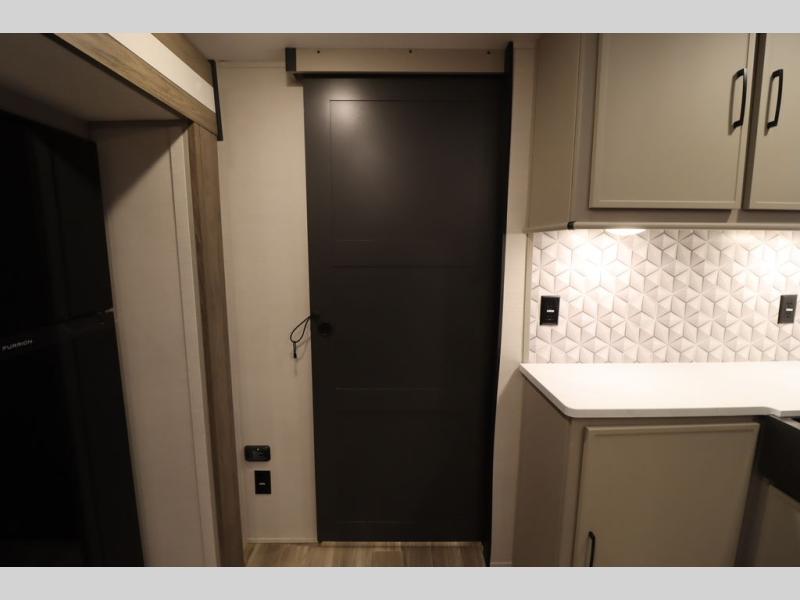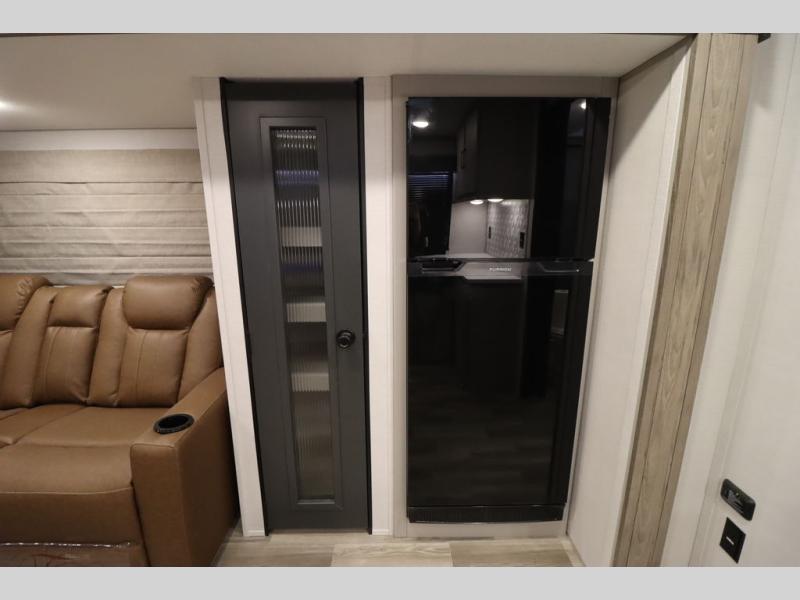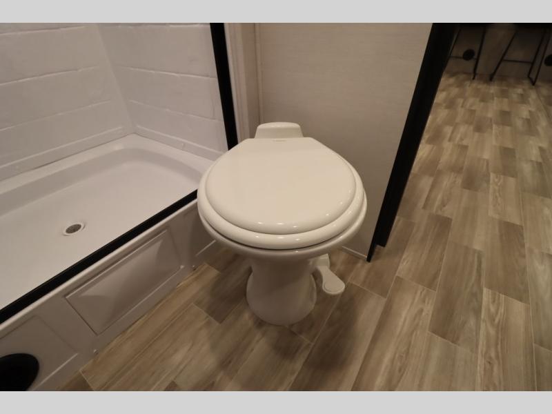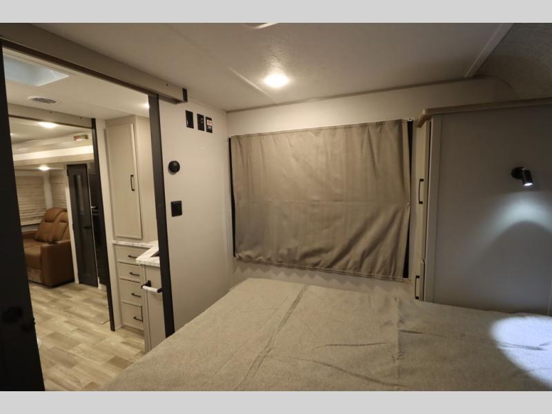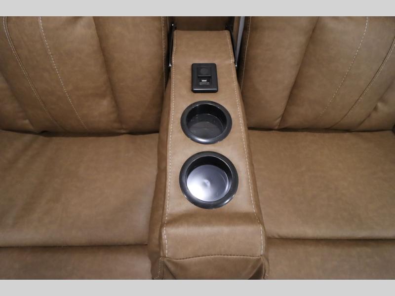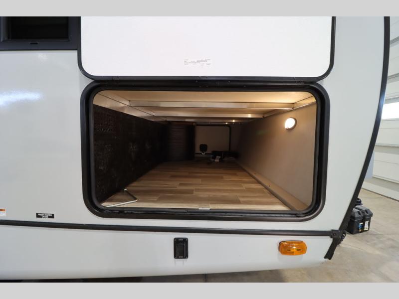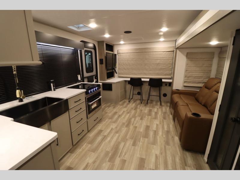 You'll love camping trips in this couple's trailer! The rear of this unit includes a full-width bar top with two stools, and in the corner there is a 40" TV with shelves for movies or books. You can relax comfortably on the theater seating that is close by the pantry and 12V residential refrigerator to grab a snack. A walk-through bath is spacious so you can easily clean up each day, and the front master bedroom is sure to bring comfort. Here, you'll find a custom king bed with underbed storage, dual bedside closets, plus one of the two entry doors for added convenience!