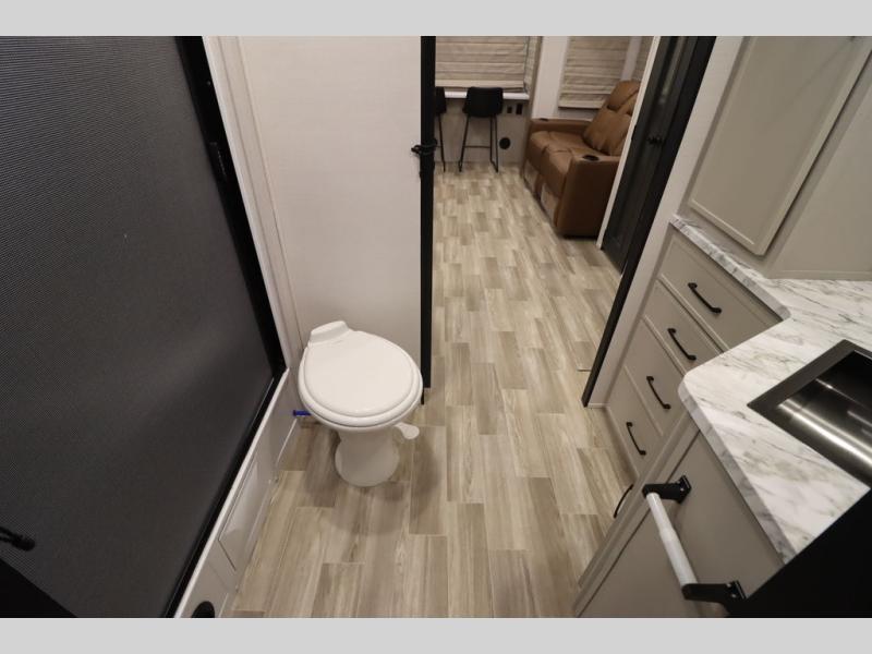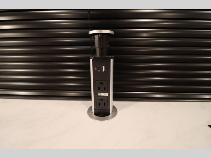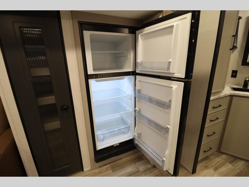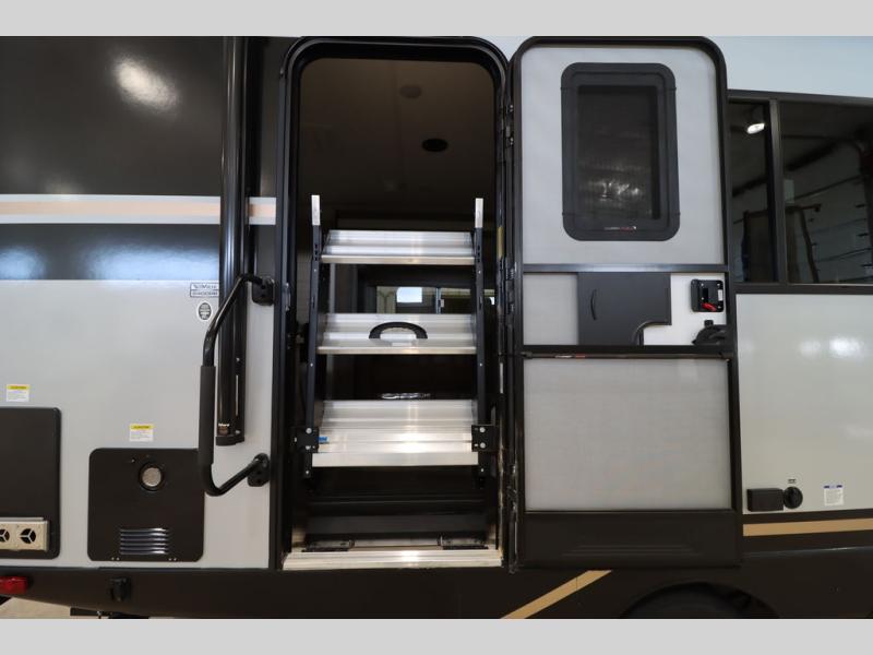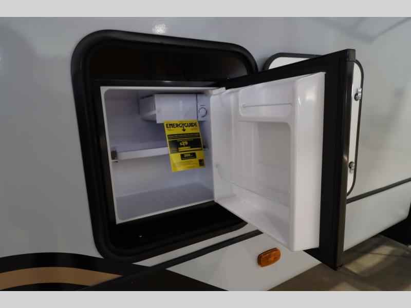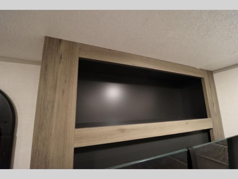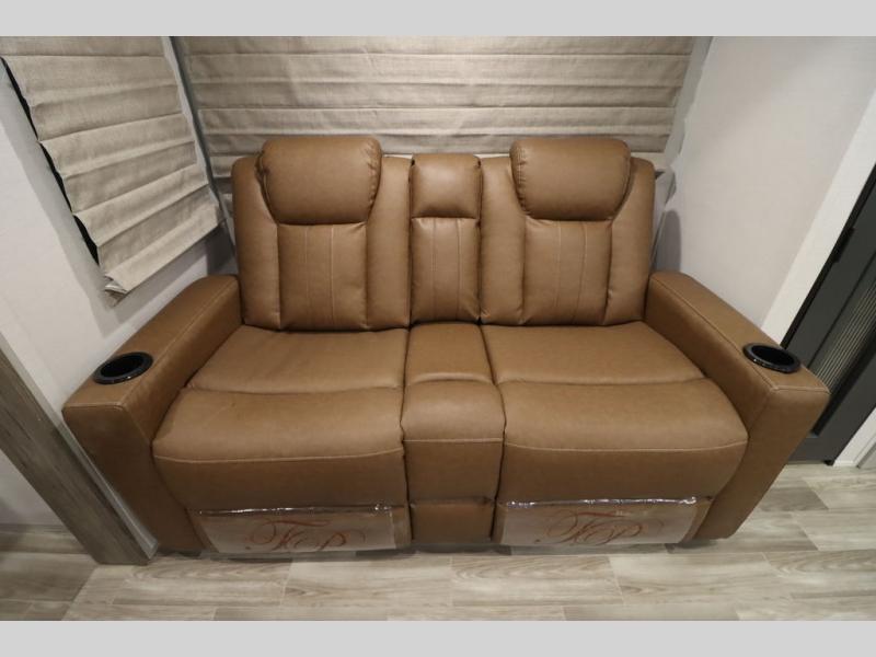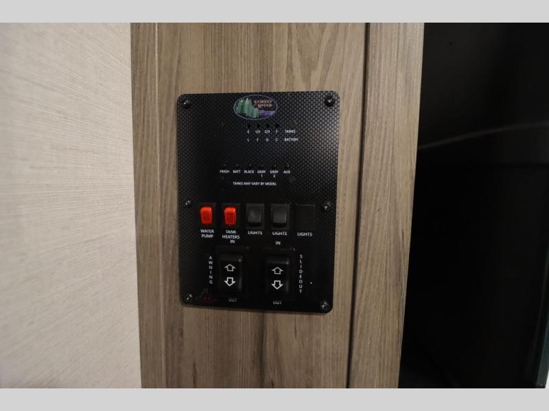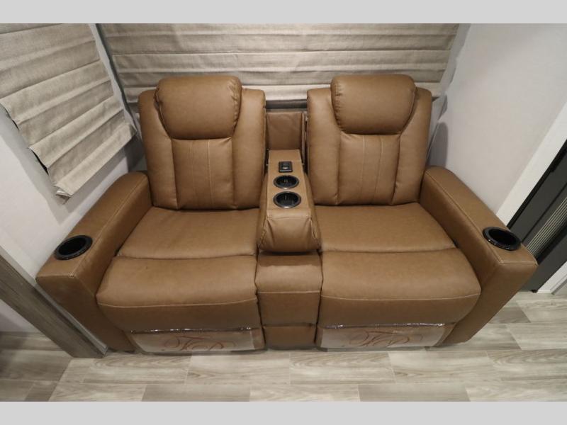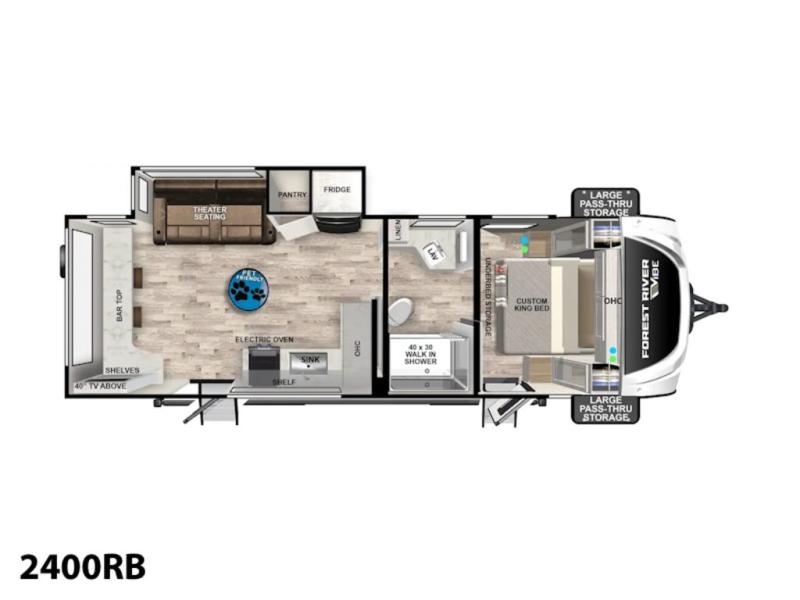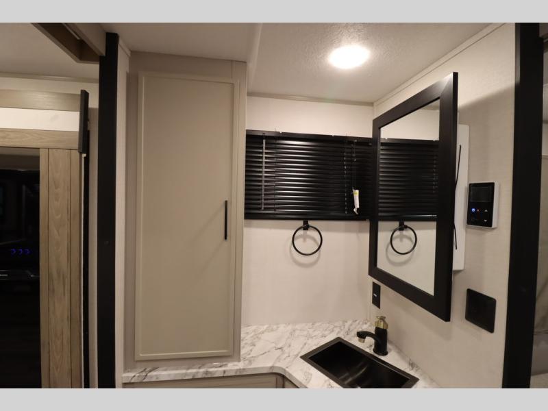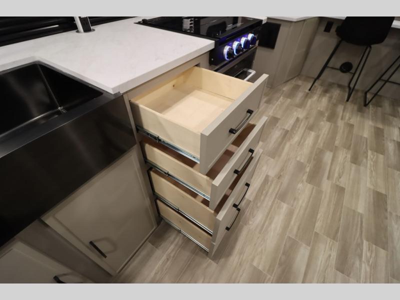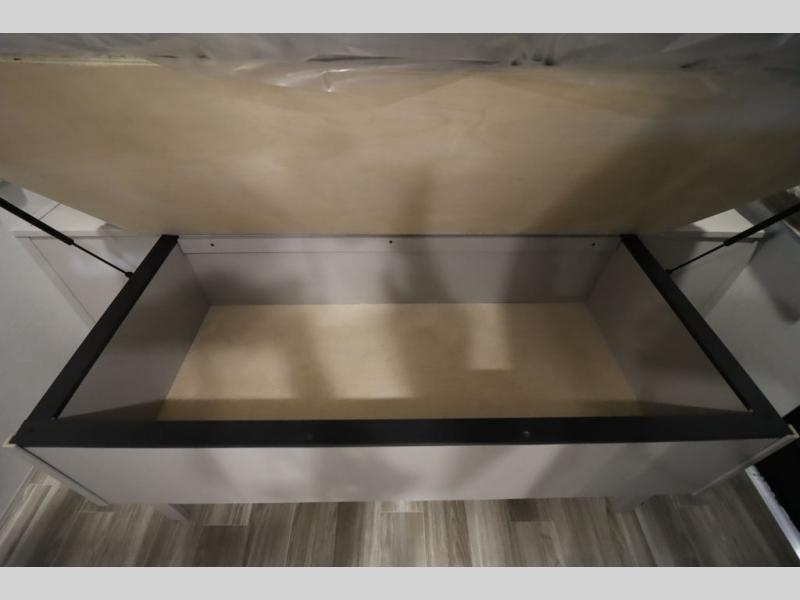 You'll love camping trips in this couple's trailer! The rear of this unit includes a full-width bar top with two stools, and in the corner there is a 40" TV with shelves for movies or books. You can relax comfortably on the theater seating that is close by the pantry and 12V residential refrigerator to grab a snack. A walk-through bath is spacious so you can easily clean up each day, and the front master bedroom is sure to bring comfort. Here, you'll find a custom king bed with underbed storage, dual bedside closets, plus one of the two entry doors for added convenience!