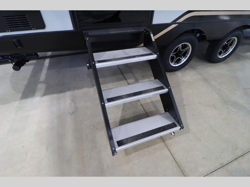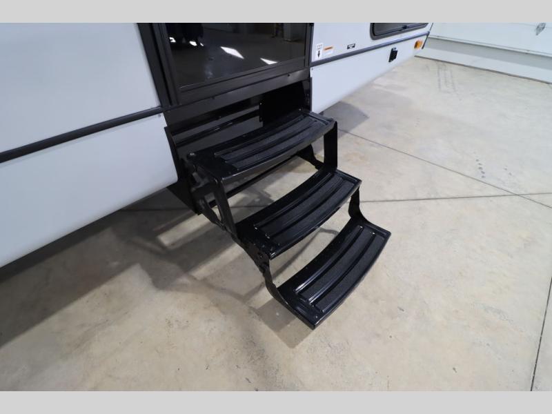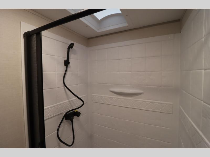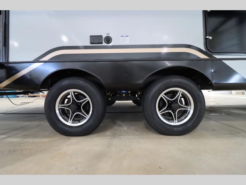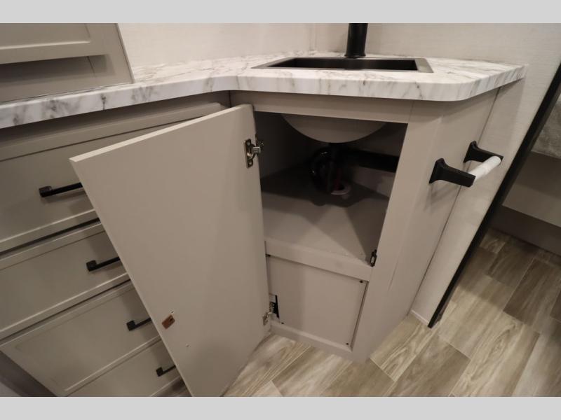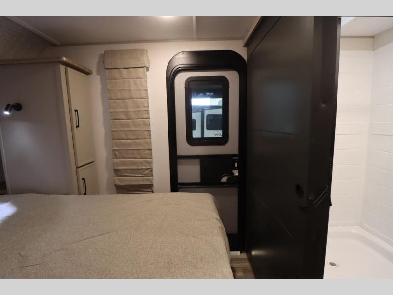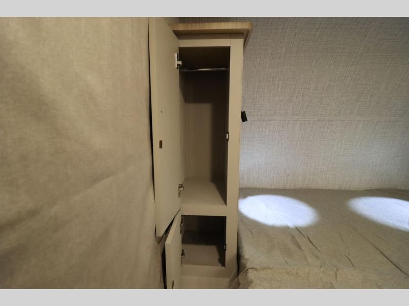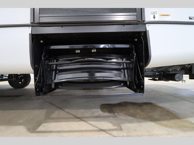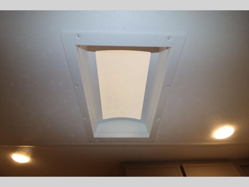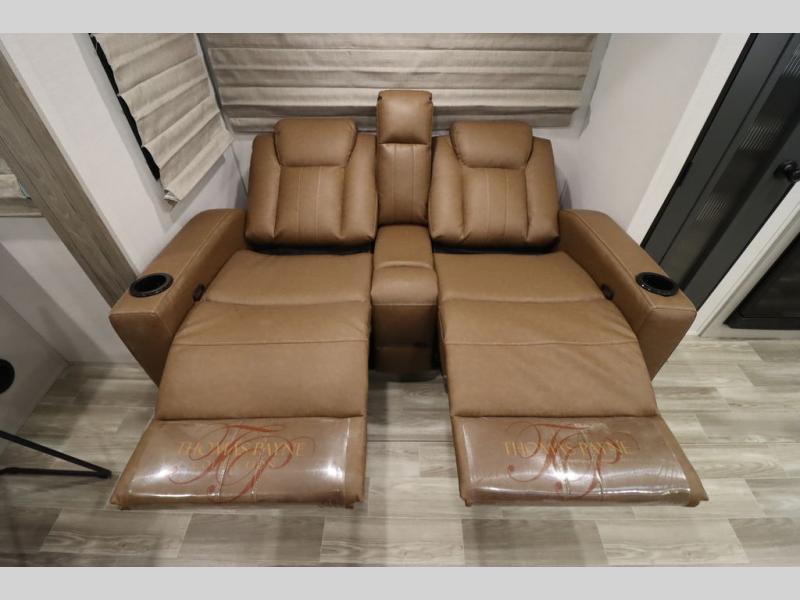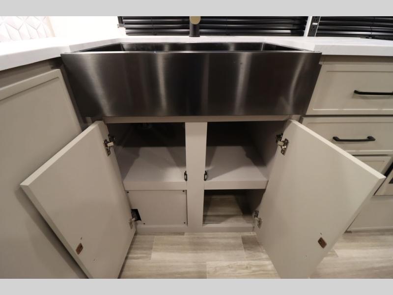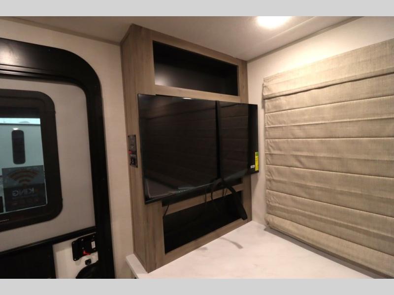 You'll love camping trips in this couple's trailer! The rear of this unit includes a full-width bar top with two stools, and in the corner there is a 40" TV with shelves for movies or books. You can relax comfortably on the theater seating that is close by the pantry and 12V residential refrigerator to grab a snack. A walk-through bath is spacious so you can easily clean up each day, and the front master bedroom is sure to bring comfort. Here, you'll find a custom king bed with underbed storage, dual bedside closets, plus one of the two entry doors for added convenience!