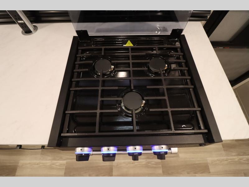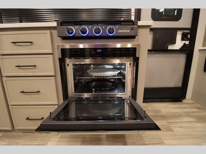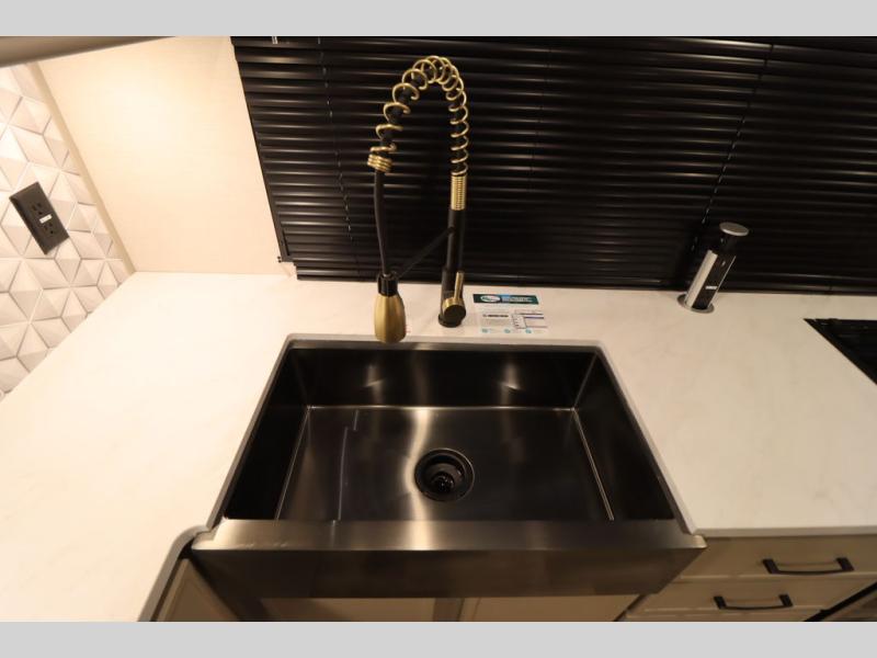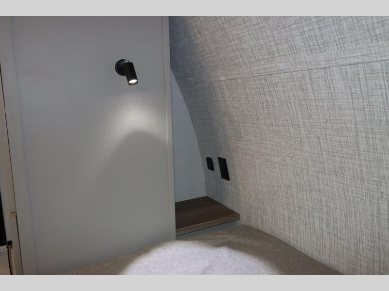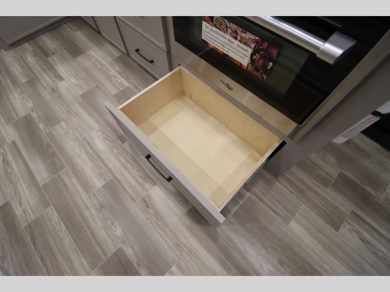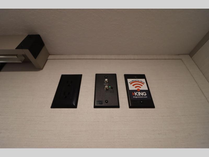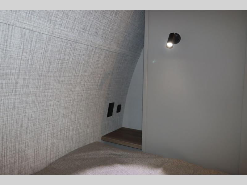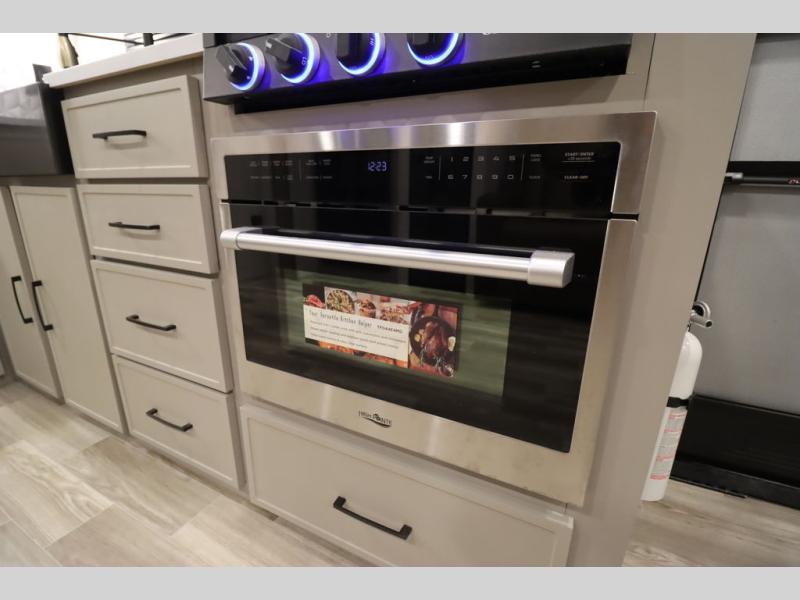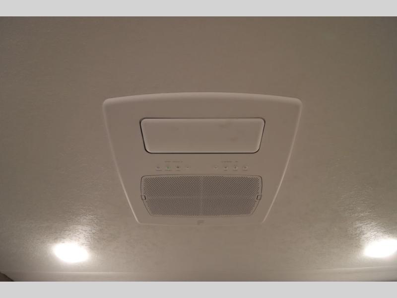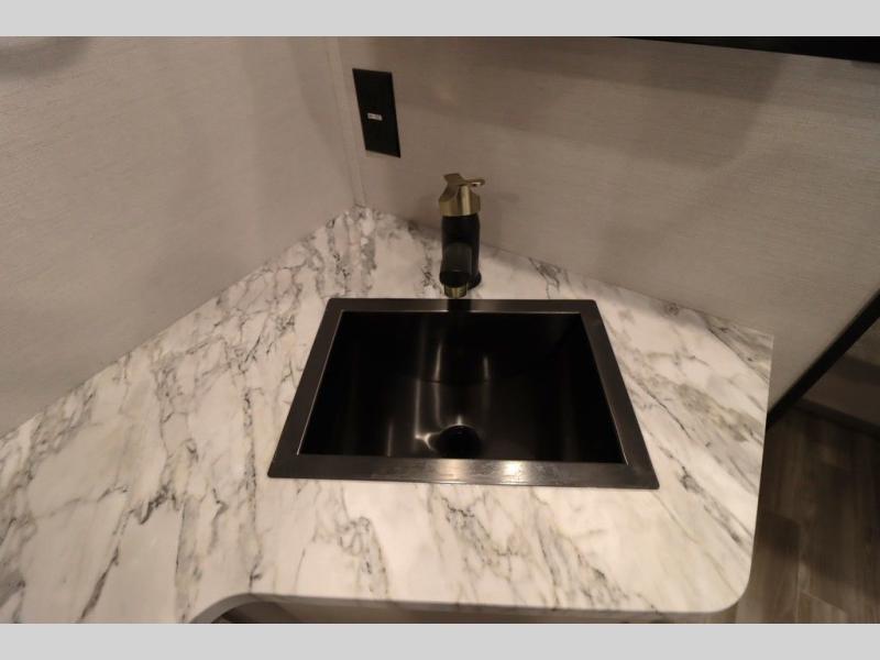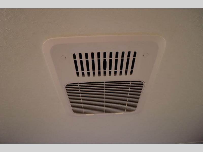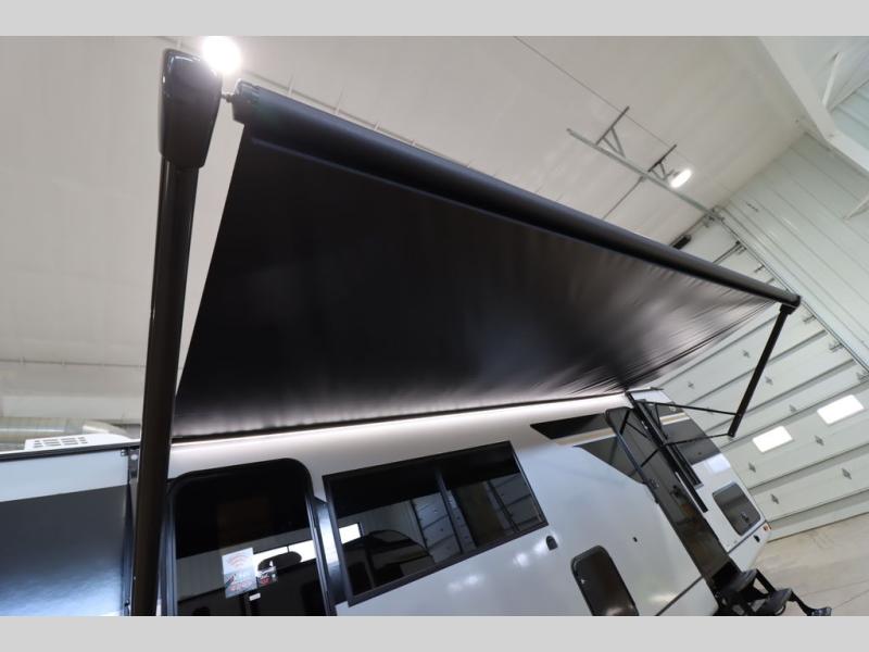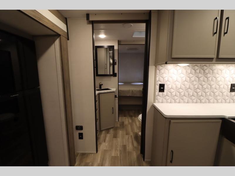You'll love camping trips in this couple's trailer! The rear of this unit includes a full-width bar top with two stools, and in the corner there is a 40" TV with shelves for movies or books. You can relax comfortably on the theater seating that is close by the pantry and 12V residential refrigerator to grab a snack. A walk-through bath is spacious so you can easily clean up each day, and the front master bedroom is sure to bring comfort. Here, you'll find a custom king bed with underbed storage, dual bedside closets, plus one of the two entry doors for added convenience!