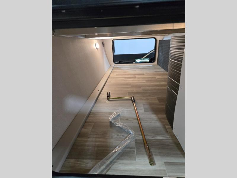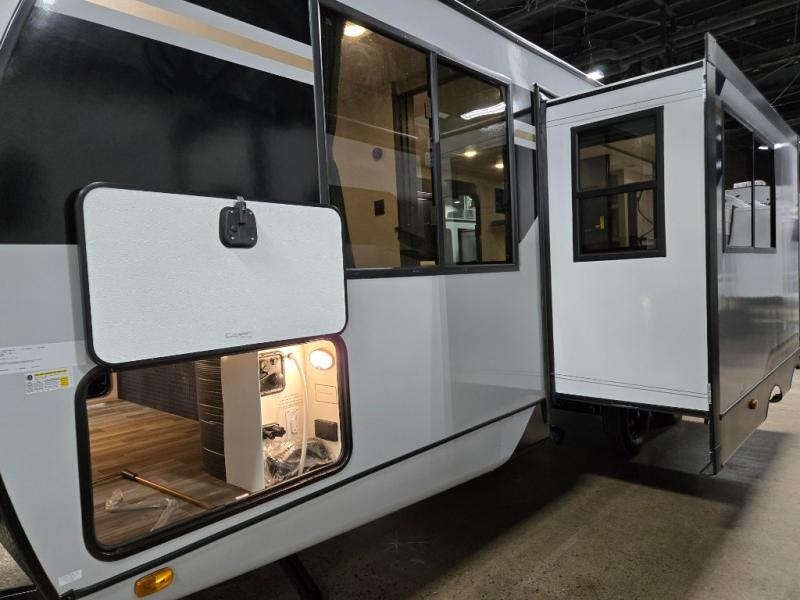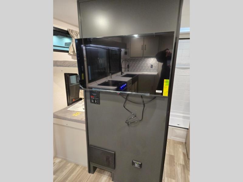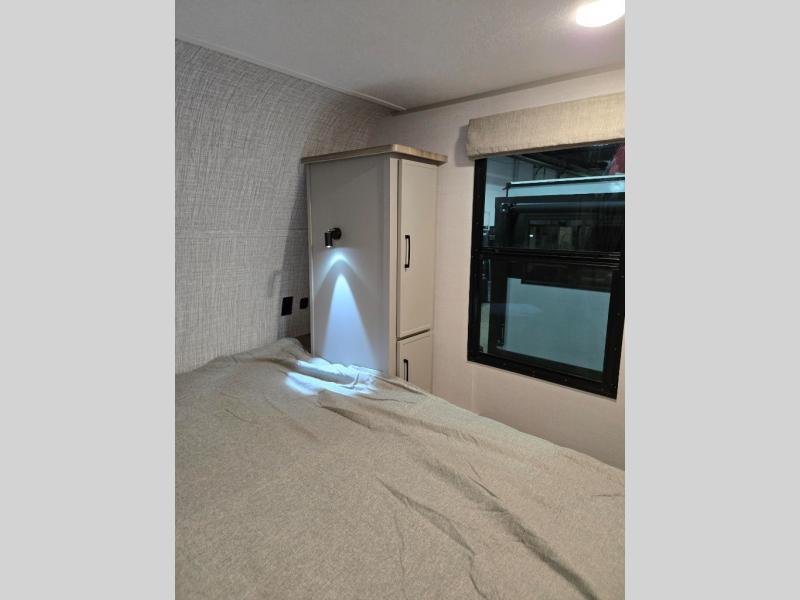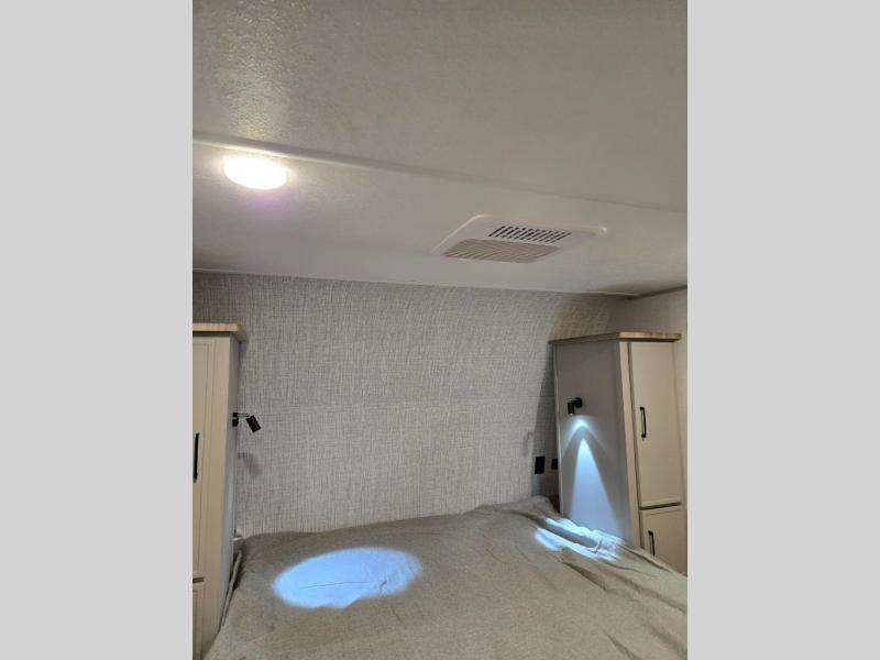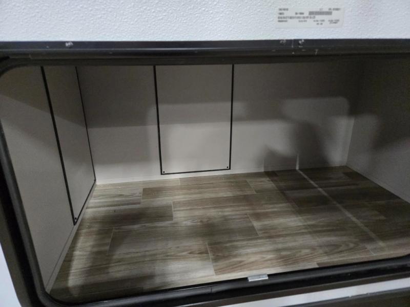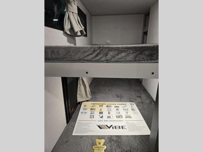 This Vibe trailer has tons of space and great features! Kids will love the bunkroom with its oversized 40" x 74" bunk beds. Adults will prefer the front bedroom with its custom king bed, wardrobe, and nightstand with USB and CPAP prep. Underbed storage and prep for another TV complete the picture. The kitchen has an efficient layout with a 5-person dinette plus ottoman, sink, electric oven, and pantry. A 40" TV in the living room is perfect for rainy days or quiet nights. Outside you will appreciate the large pass-through storage and the roof-mounted solar panel.