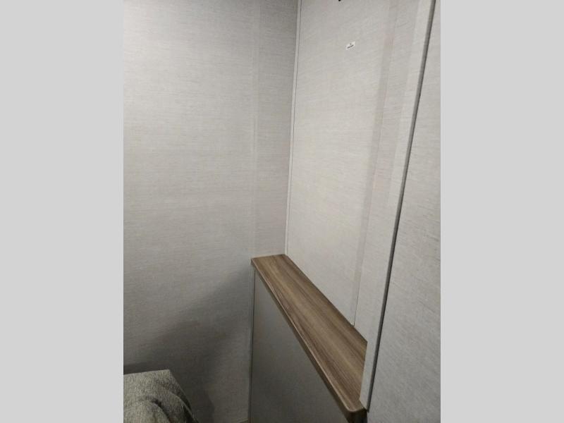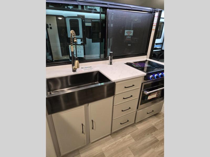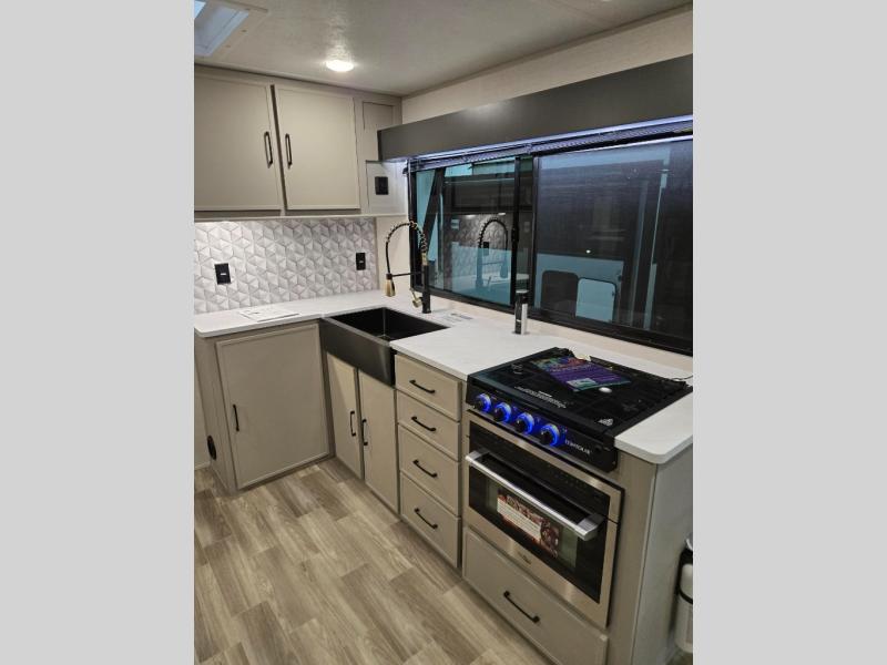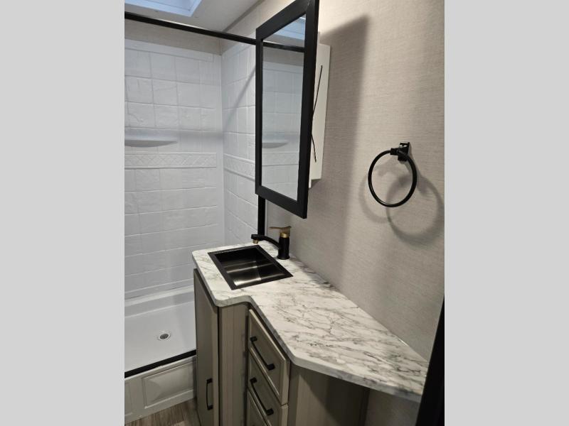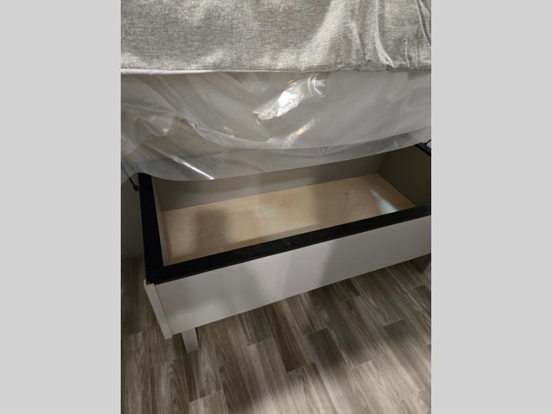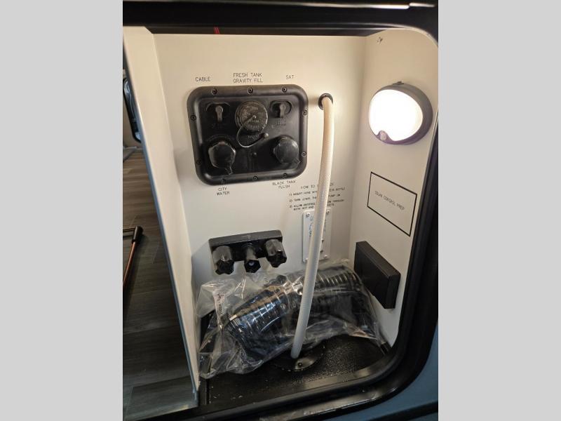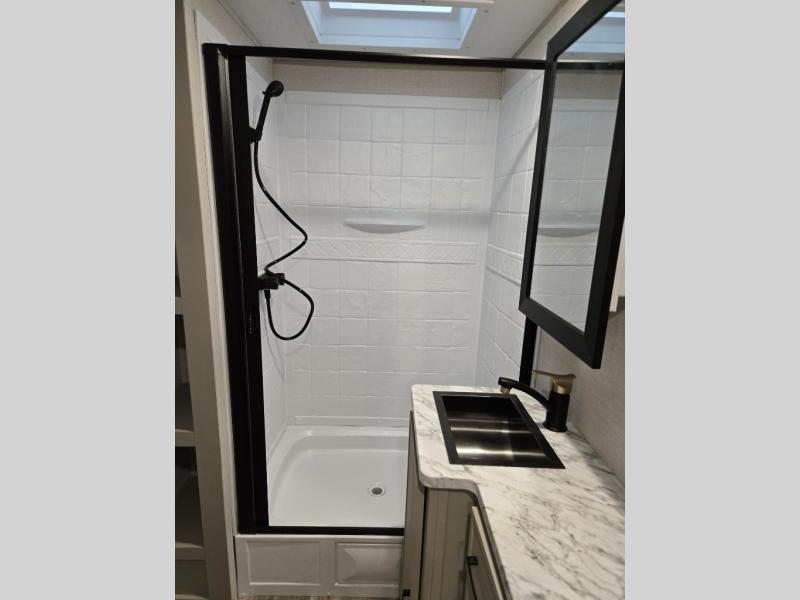 This Vibe trailer has tons of space and great features! Kids will love the bunkroom with its oversized 40" x 74" bunk beds. Adults will prefer the front bedroom with its custom king bed, wardrobe, and nightstand with USB and CPAP prep. Underbed storage and prep for another TV complete the picture. The kitchen has an efficient layout with a 5-person dinette plus ottoman, sink, electric oven, and pantry. A 40" TV in the living room is perfect for rainy days or quiet nights. Outside you will appreciate the large pass-through storage and the roof-mounted solar panel.