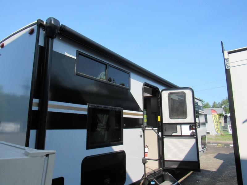 This Vibe trailer has tons of space and great features! Kids will love the bunkroom with its oversized 40" x 74" bunk beds. Adults will prefer the front bedroom with its custom king bed, wardrobe, and nightstand with USB and CPAP prep. Underbed storage and prep for another TV complete the picture. The kitchen has an efficient layout with a 5-person dinette plus ottoman, sink, electric oven, and pantry. A 40" TV in the living room is perfect for rainy days or quiet nights. Outside you will appreciate the large pass-through storage and the roof-mounted solar panel.