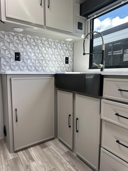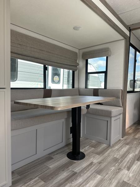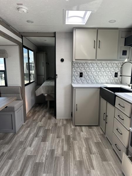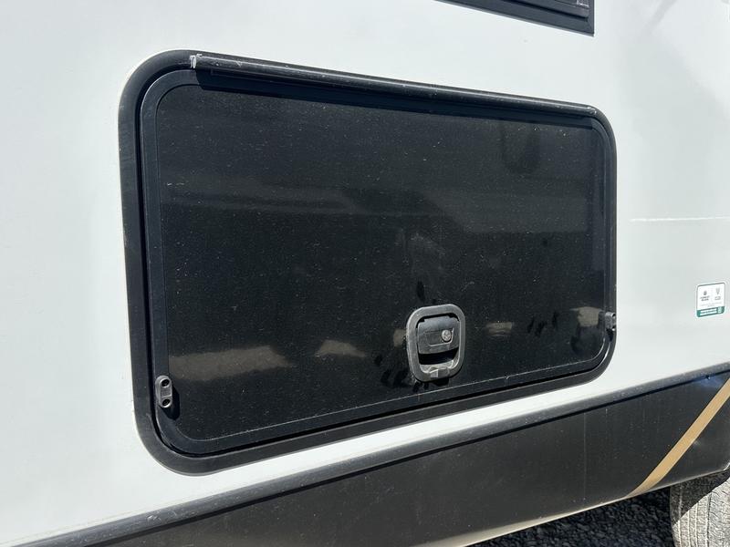This Vibe trailer has tons of space and great features! Kids will love the bunkroom with its oversized 40" x 74" bunk beds. Adults will prefer the front bedroom with its custom king bed, wardrobe, and nightstand with USB and CPAP prep. Underbed storage and prep for another TV complete the picture. The kitchen has an efficient layout with a 5-person dinette, sink, electric oven, and pantry. A 40" TV in the living room is perfect for rainy days or quiet nights. Outside you will appreciate the large pass-through storage.