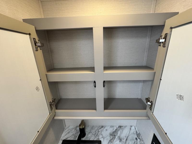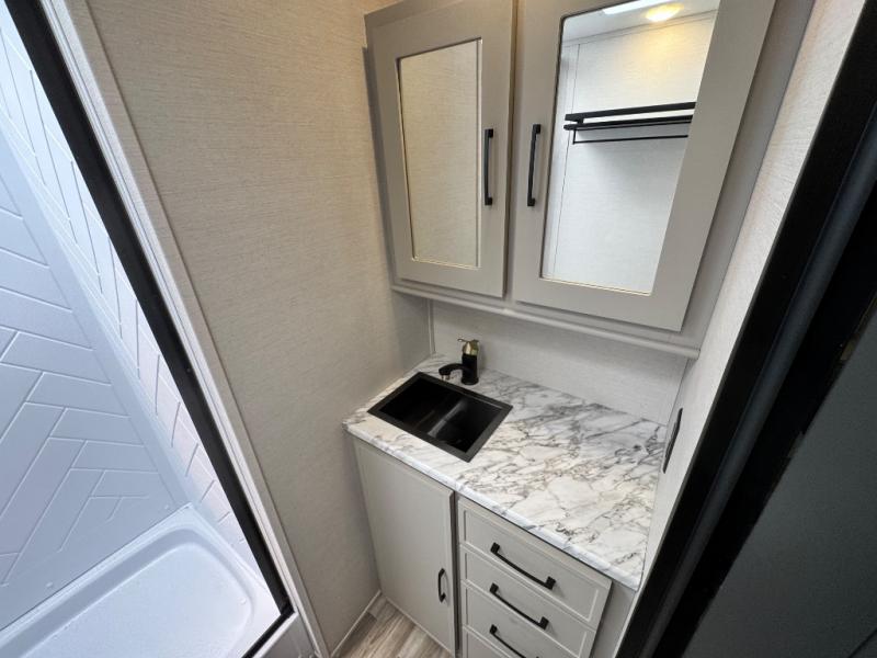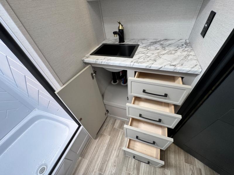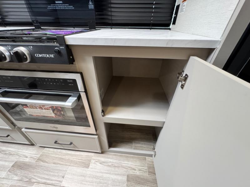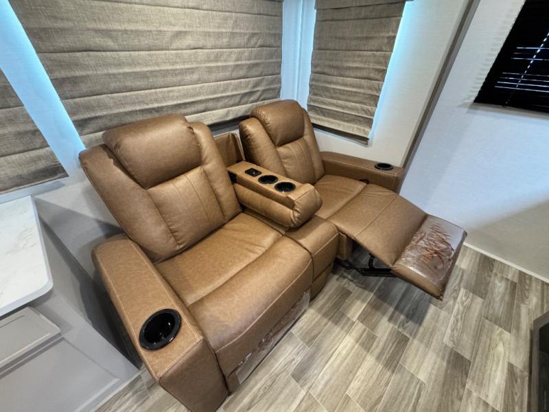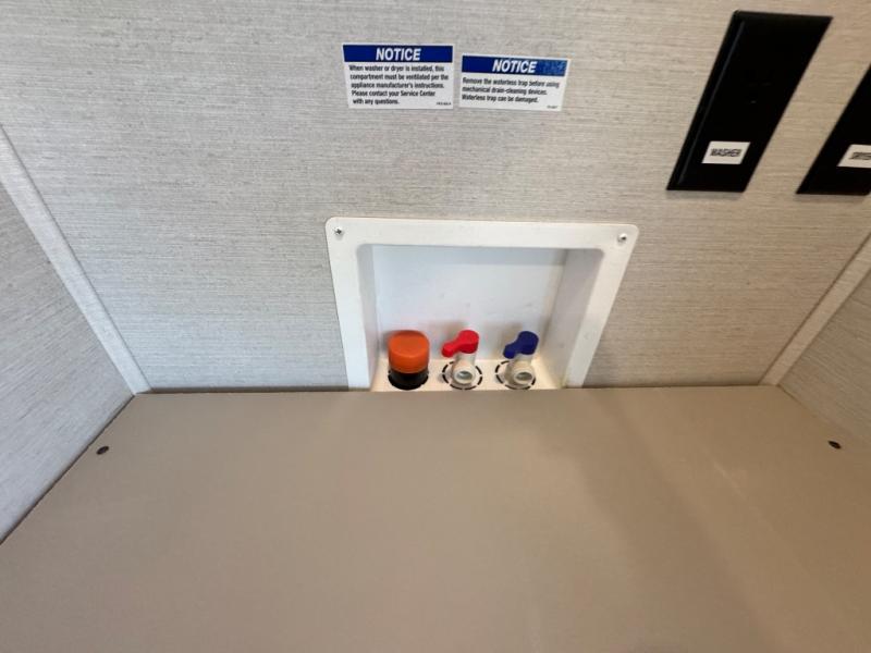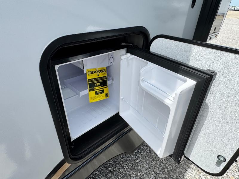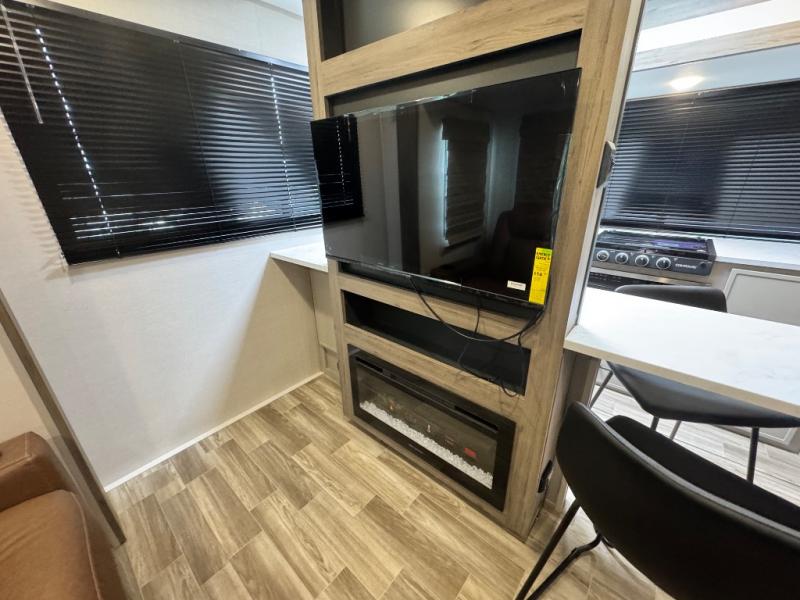 This Vibe travel trailer is perfect for your next getaway! Relax on the theater seating opposite the entertainment center with fireplace. A bar top counter provides plenty of space in the kitchen, where you will also love the fridge, electric oven, and spacious pantry. A desk area even allows you to work if you have to! At night retire to the front bedroom with its custom king bed. The full bath features a spacious 36" x 30" shower, linen closet, and even prep for an optional washer/dryer. Outside you will find dual awnings and an outside fridge so you can grab drinks on the go.