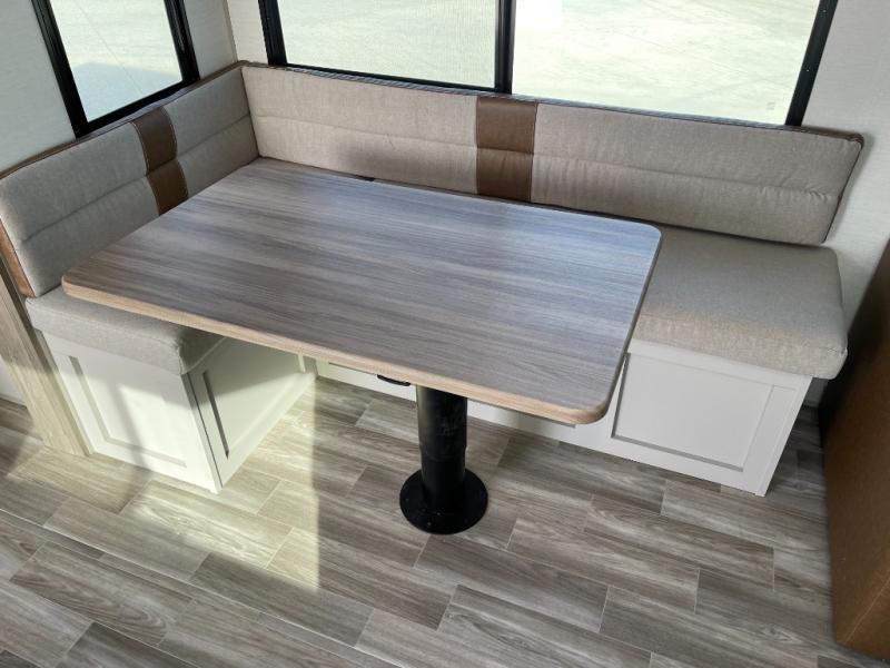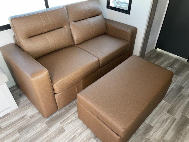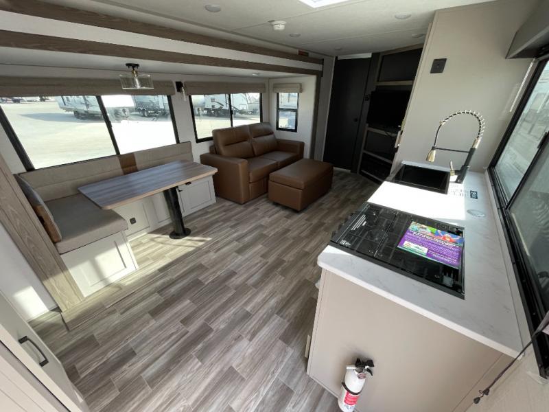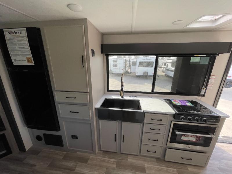 Are you looking to upgrade your RV to a trailer with more space and more features? Look no further than this Vibe! The kids are sure to claim the double-size bunks to themselves, while the adults take the front private bedroom with the queen bed. You will find even more sleeping space on the dinette and sleeper sofa within the large slide out. After a day outdoors at the lake, get cleaned up in the full bath that includes a 40" x 30" shower. There is so much more to love about this model, like the entertainment center, the oversized panoramic windows, and the large pass-through storage for all your gear!