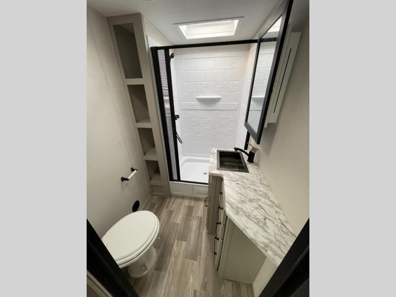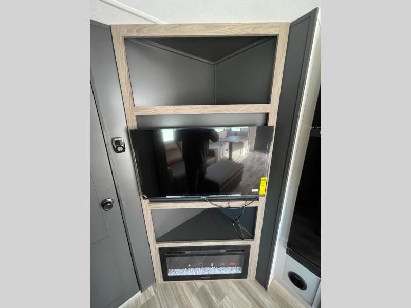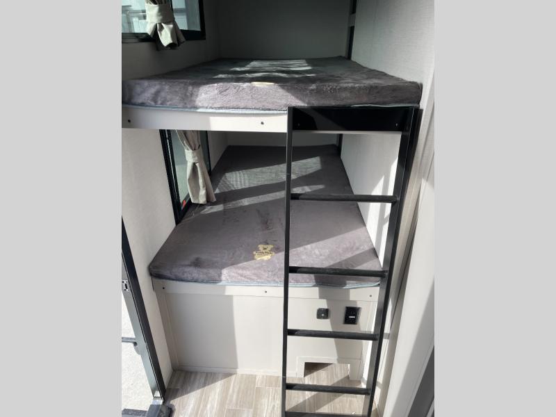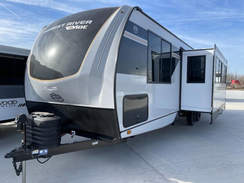 Are you looking to upgrade your RV to a trailer with more space and more features? Look no further than this Vibe! The kids are sure to claim the double-size bunks to themselves, while the adults take the front private bedroom with the queen bed. You will find even more sleeping space on the dinette and sleeper sofa within the large slide out. After a day outdoors at the lake, get cleaned up in the full bath that includes a 40" x 30" shower. There is so much more to love about this model, like the entertainment center, the oversized panoramic windows, and the large pass-through storage for all your gear!
