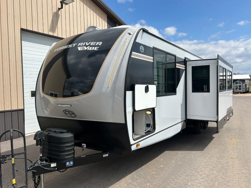 Are you looking to upgrade your RV to a trailer with more space and more features? Look no further than this Vibe! The kids are sure to claim the double-size bunks to themselves, while the adults take the front private bedroom with the queen bed. You will find even more sleeping space on the dinette and sleeper sofa within the large slide out. After a day outdoors at the lake, get cleaned up in the full bath that includes a 40" x 30" shower. There is so much more to love about this model, like the entertainment center, the oversized panoramic windows, and the large pass-through storage for all your gear!