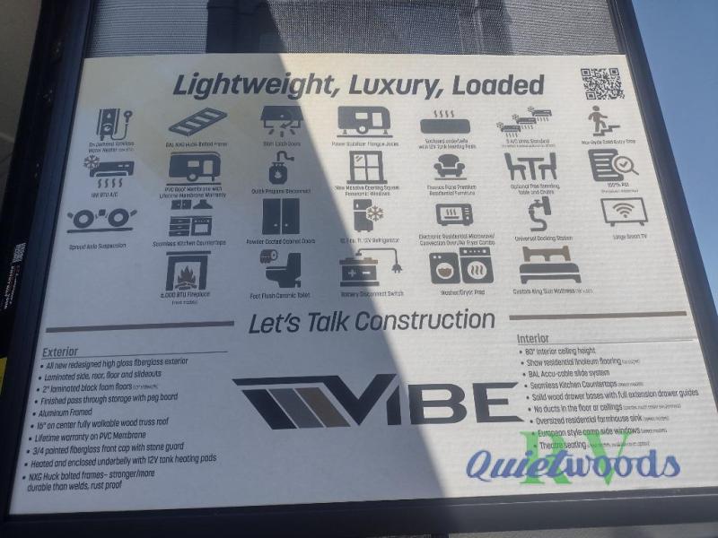 With any Vibe travel trailer by Forest River, you will enjoy comfort at every turn! There is a Norco huck-bolted steel frame, an enclosed underbelly with 12V heating pads, and a PVC roof membrane for added durability. You will also find a universal docking station outside, along with slam latch doors, European style square windows, and an automotive painted front cap. Head inside to enjoy the premium residential-style furniture, decorative window treatments, privacy shades in the living room and bedroom, and many more comforts!