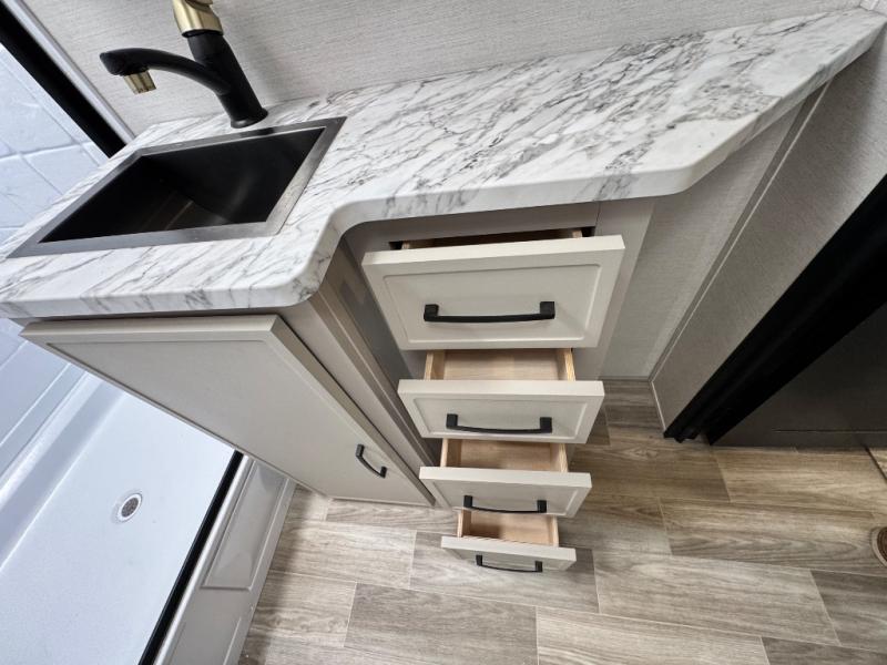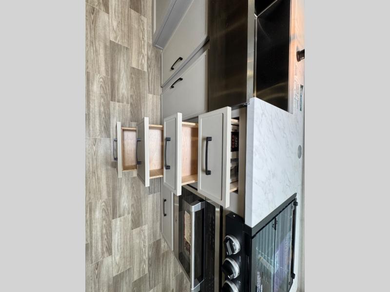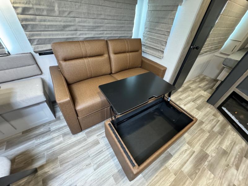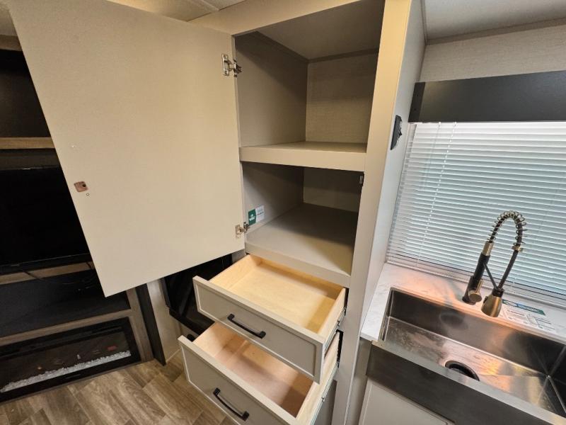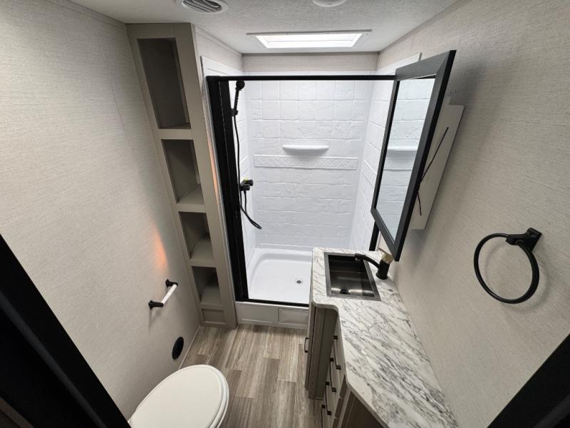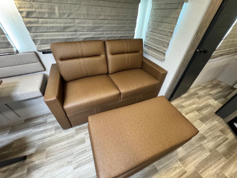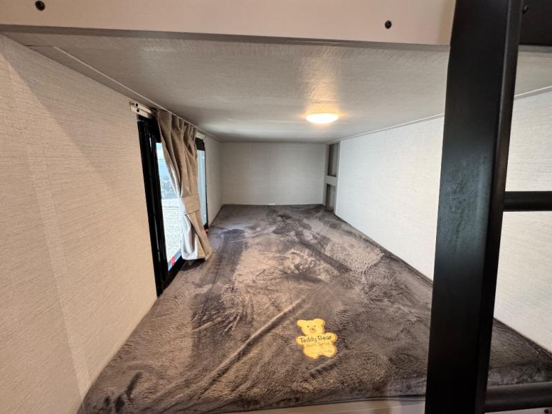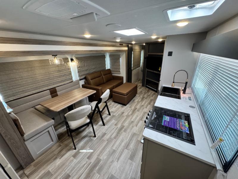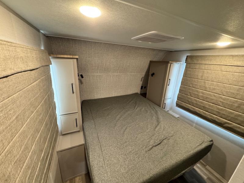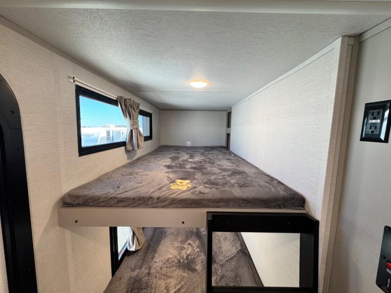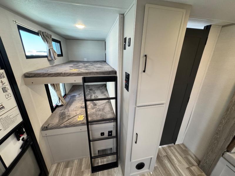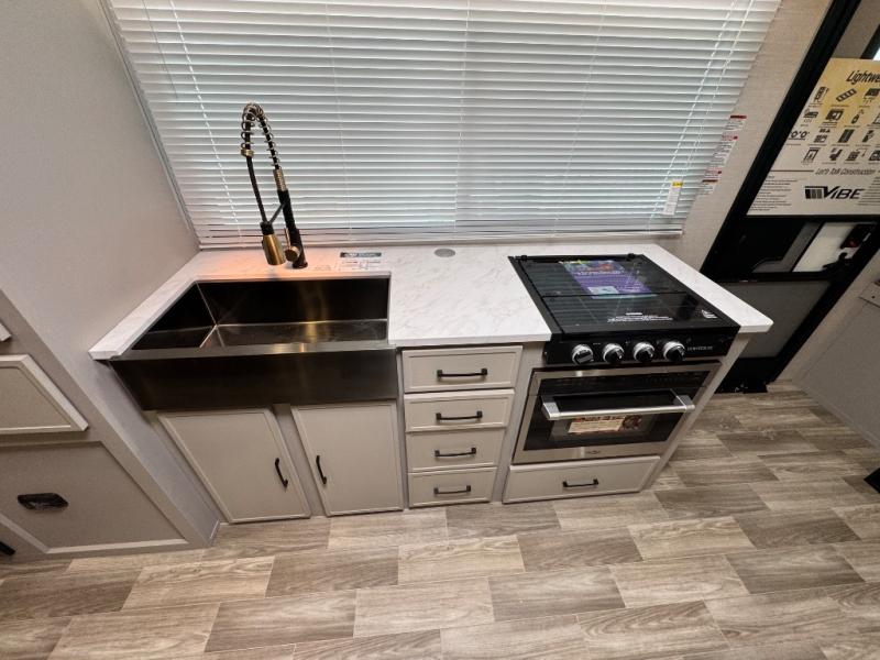 Are you looking to upgrade your RV to a trailer with more space and more features? Look no further than this Vibe! The kids are sure to claim the double-size bunks to themselves, while the adults take the front private bedroom with the queen bed. You will find even more sleeping space on the dinette and sleeper sofa within the large slide out. After a day outdoors at the lake, get cleaned up in the full bath that includes a 40" x 30" shower. There is so much more to love about this model, like the entertainment center, the oversized panoramic windows, and the large pass-through storage for all your gear!