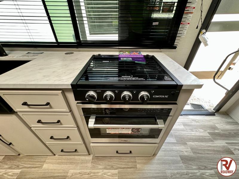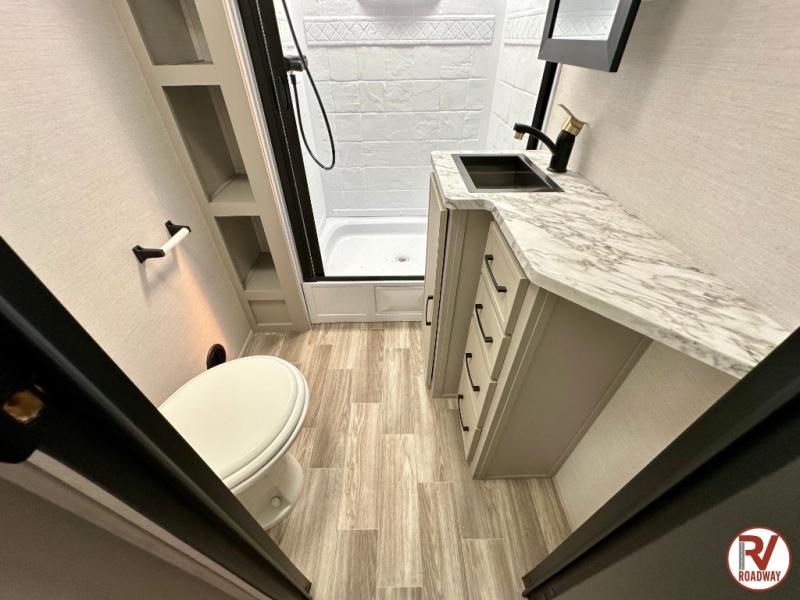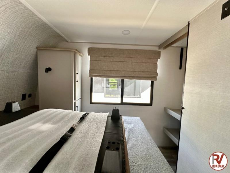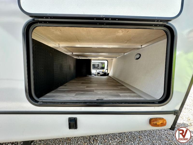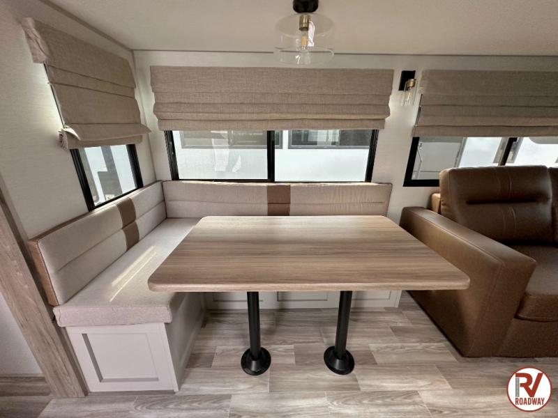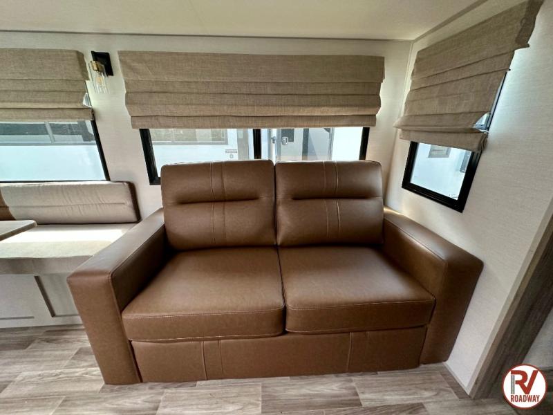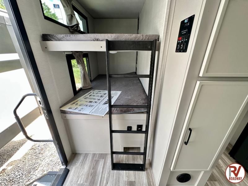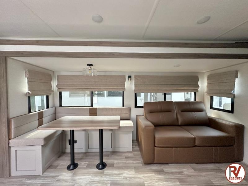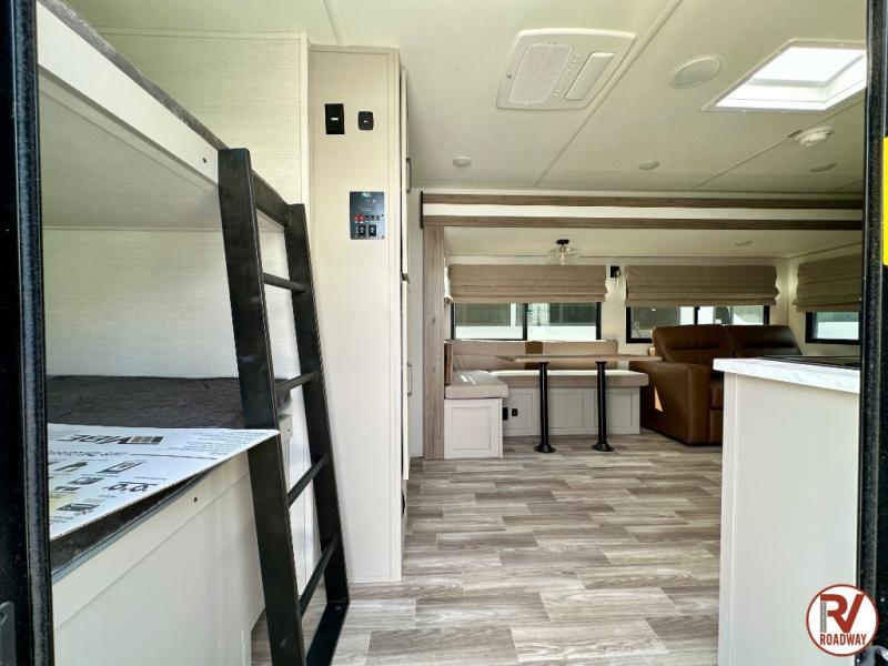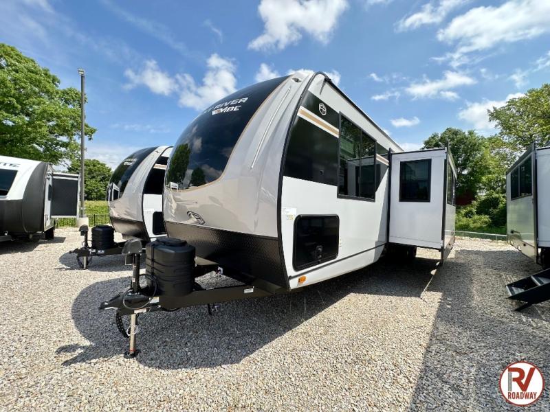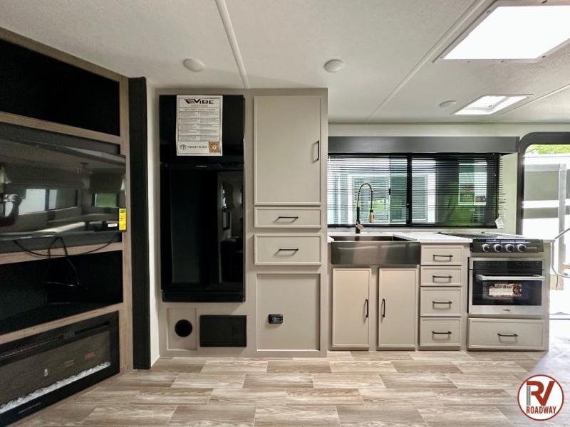 Are you looking to upgrade your RV to a trailer with more space and more features? Look no further than this Vibe! The kids are sure to claim the double-size bunks to themselves, while the adults take the front private bedroom with the queen bed. You will find even more sleeping space on the dinette and sleeper sofa within the large slide out. After a day outdoors at the lake, get cleaned up in the full bath that includes a 40" x 30" shower. There is so much more to love about this model, like the entertainment center, the oversized panoramic windows, and the large pass-through storage for all your gear!