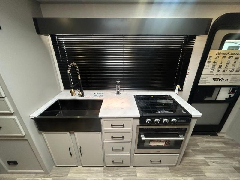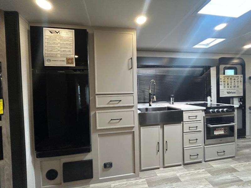 With any Vibe travel trailer by Forest River, you will enjoy comfort at every turn! There is a Norco huck-bolted steel frame, an enclosed underbelly with 12V heating pads, and a PVC roof membrane for added durability. You will also find a universal docking station outside, along with slam latch doors, European style square windows, and an automotive painted front cap. Head inside to enjoy the premium residential-style furniture, decorative window treatments, privacy shades in the living room and bedroom, and many more comforts!
