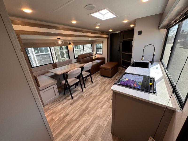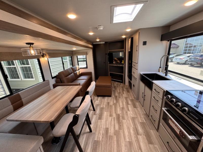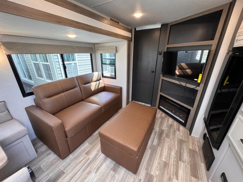 You will love camping every other weekend in this spacious travel trailer. There is a full rear bath with a spacious shower and linen closet for towels and toiletries. Your crew can get comfortable on the theater seating across from the entertainment center, and it even swings open to reveal hidden pantry storage. Easily prepare your meals in the kitchen on the three burner cooktop, or in the oven. There is also a residential refrigerator, plus a microwave for meals on the go. When you're ready to call it a night, the front private bedroom is sure to provide comfort with its custom king bed, wardrobe, and underbed storage. This model also includes an outside sink and refrigerator, an 18' power awning, plus a roof mounted solar panel!