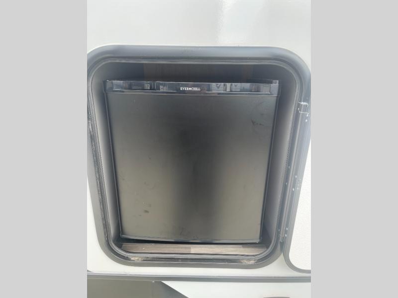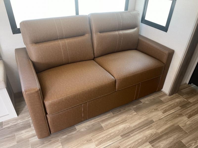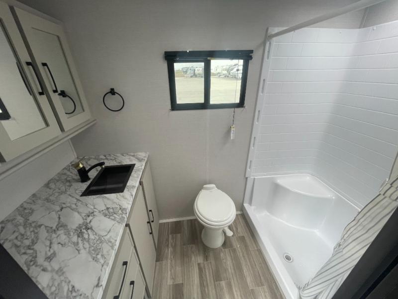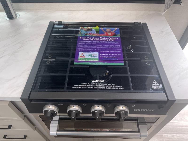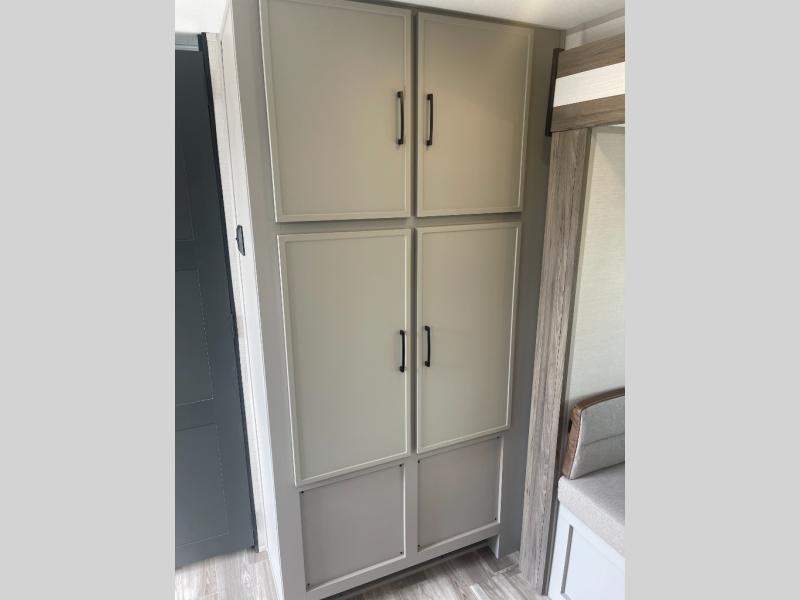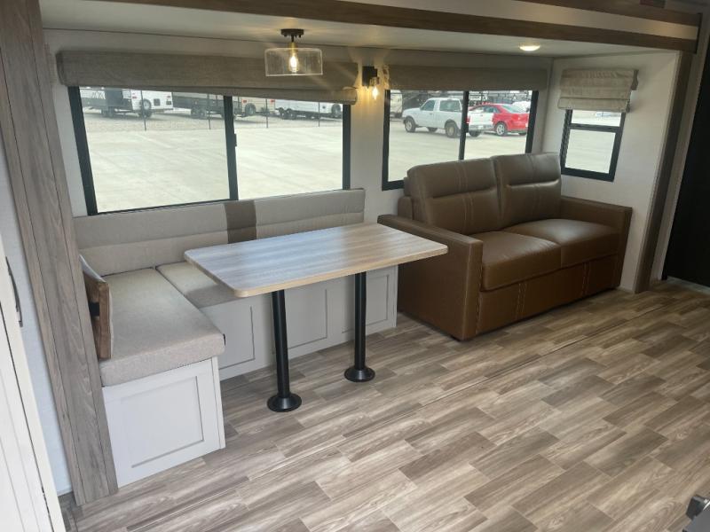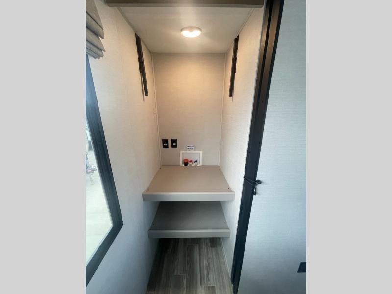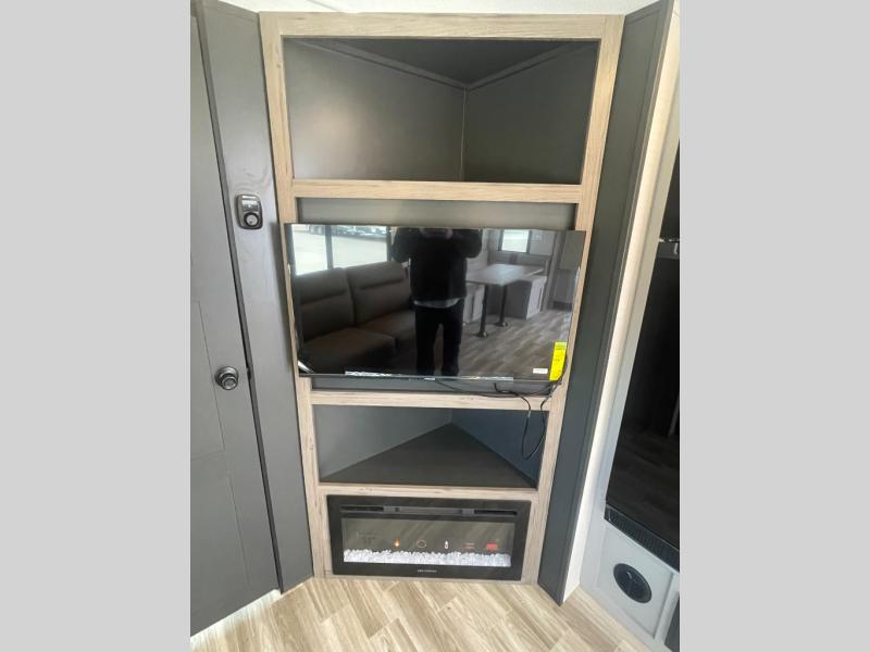 You will love camping every other weekend in this spacious travel trailer. There is a full rear bath with a spacious shower and linen closet for towels and toiletries. Your crew can get comfortable on the theater seating across from the entertainment center, and it even swings open to reveal hidden pantry storage. Easily prepare your meals in the kitchen on the three burner cooktop, or in the oven. There is also a residential refrigerator, plus a microwave for meals on the go. When you're ready to call it a night, the front private bedroom is sure to provide comfort with its custom king bed, wardrobe, and underbed storage. This model also includes an outside sink and refrigerator, an 18' power awning, plus a roof mounted solar panel!
