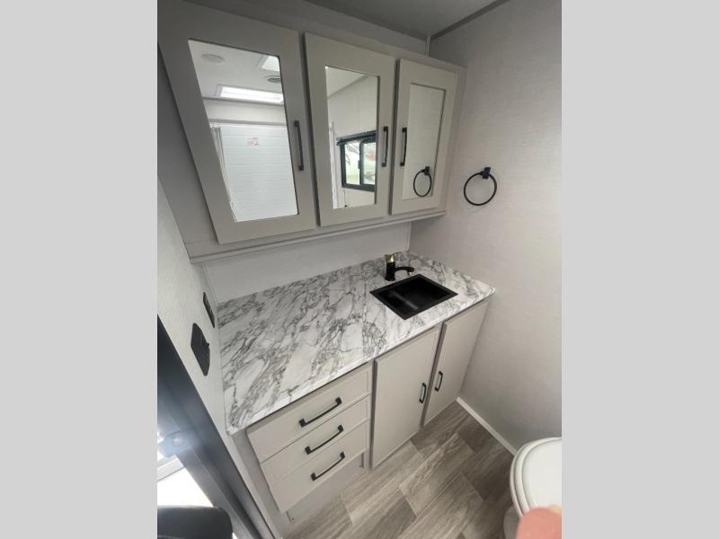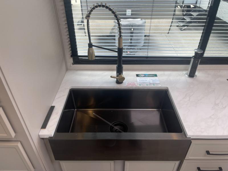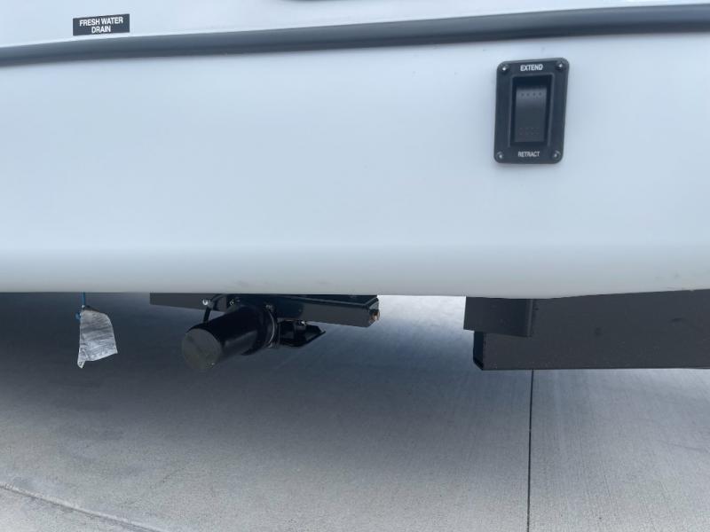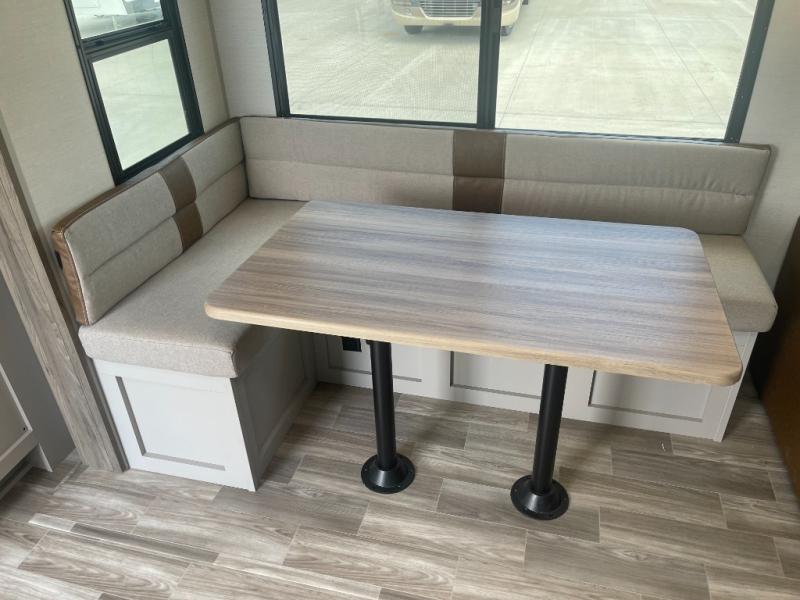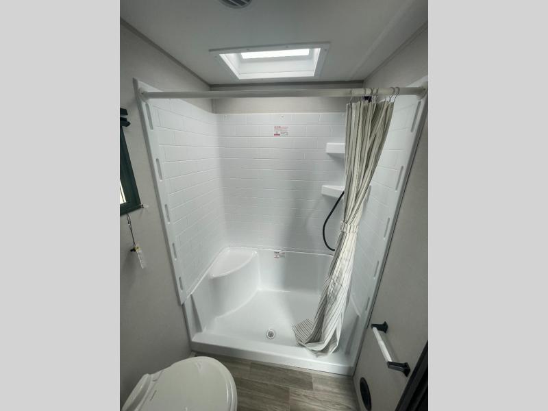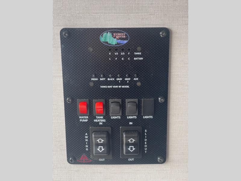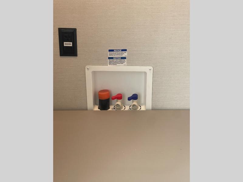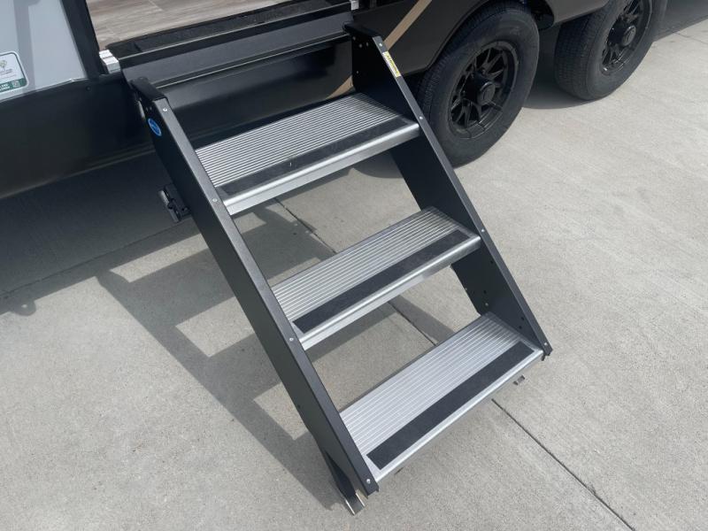 You will love camping every other weekend in this spacious travel trailer. There is a full rear bath with a spacious shower and linen closet for towels and toiletries. Your crew can get comfortable on the theater seating across from the entertainment center, and it even swings open to reveal hidden pantry storage. Easily prepare your meals in the kitchen on the three burner cooktop, or in the oven. There is also a residential refrigerator, plus a microwave for meals on the go. When you're ready to call it a night, the front private bedroom is sure to provide comfort with its custom king bed, wardrobe, and underbed storage. This model also includes an outside sink and refrigerator, an 18' power awning, plus a roof mounted solar panel!