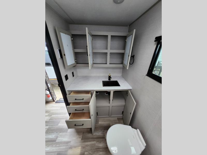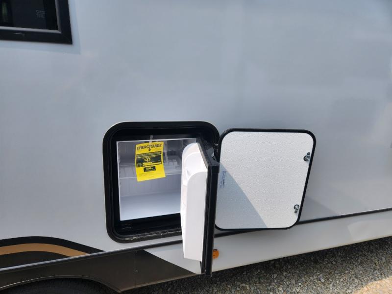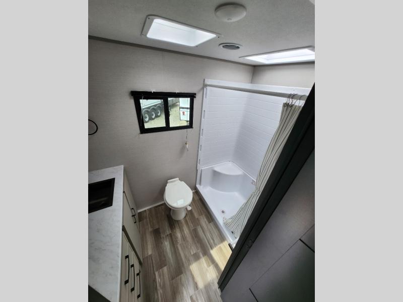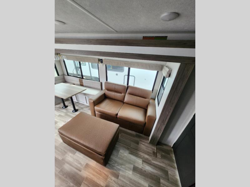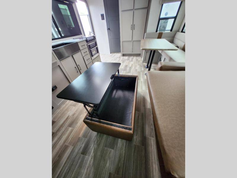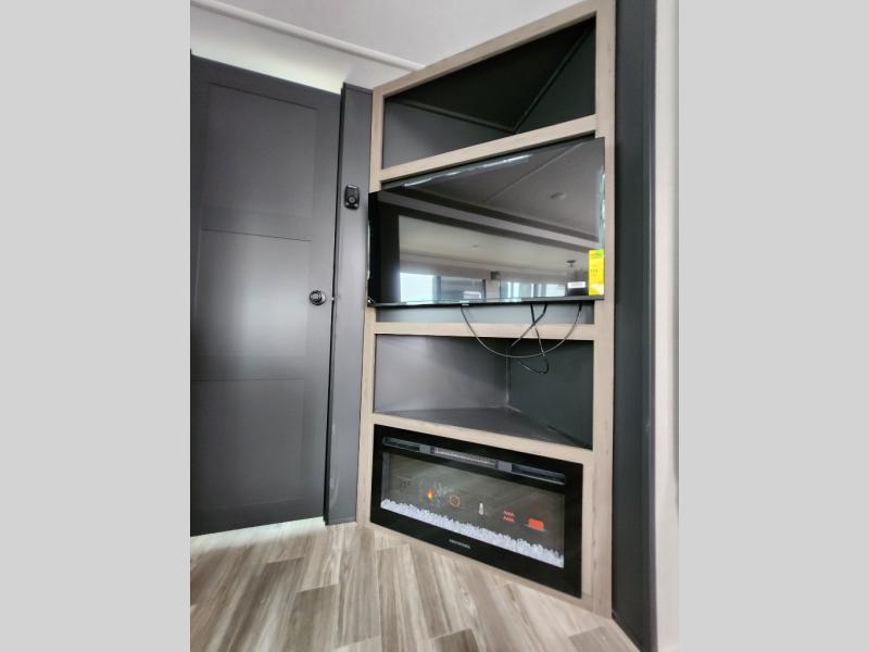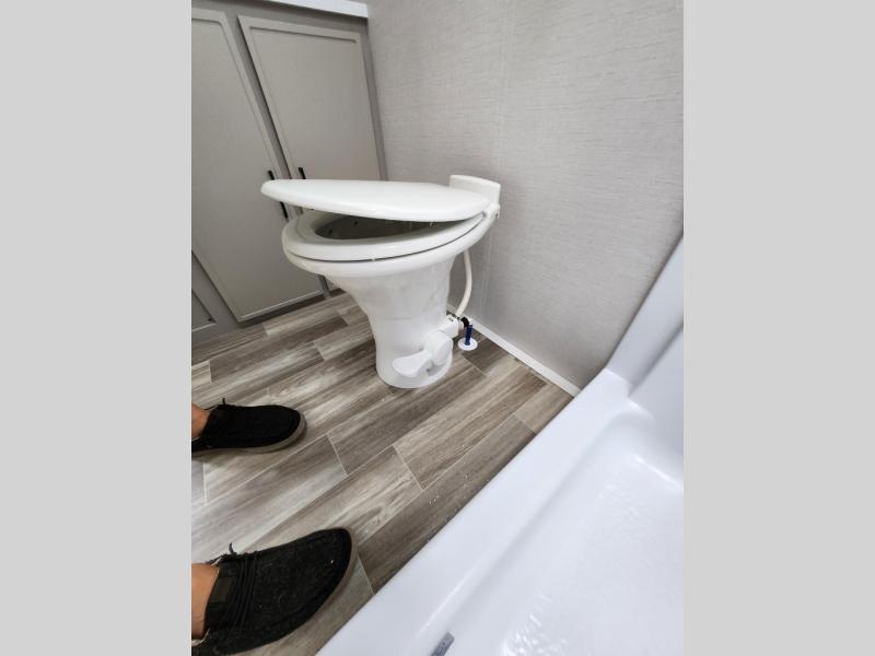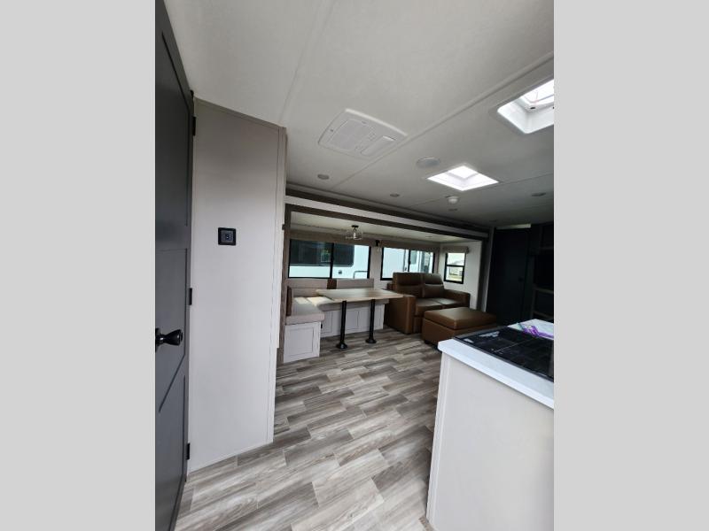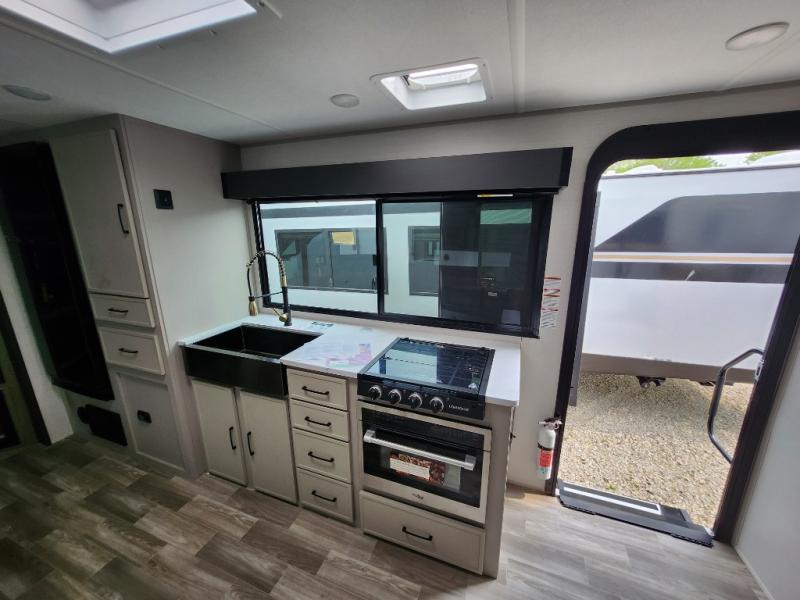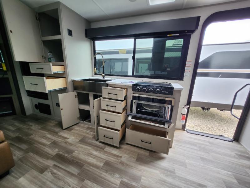 You will love camping every other weekend in this spacious travel trailer. There is a full rear bath with a spacious shower and linen closet for towels and toiletries. Your crew can get comfortable on the theater seating across from the entertainment center, and it even swings open to reveal hidden pantry storage. Easily prepare your meals in the kitchen on the three burner cooktop, or in the oven. There is also a 12V refrigerator, plus a microwave for meals on the go. When you're ready to call it a night, the front private bedroom is sure to provide comfort with its custom king bed, wardrobe, and underbed storage.
