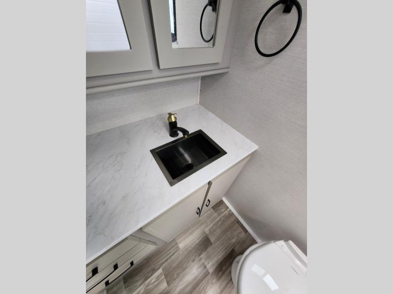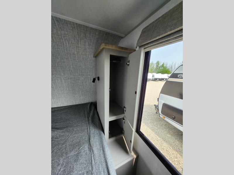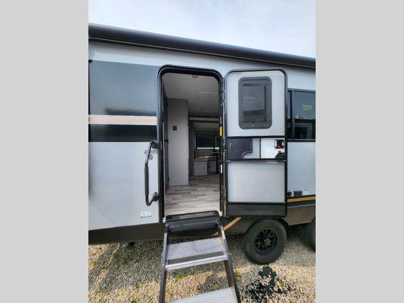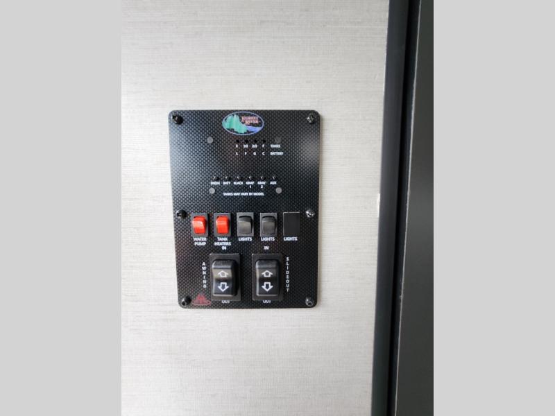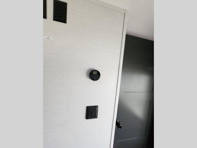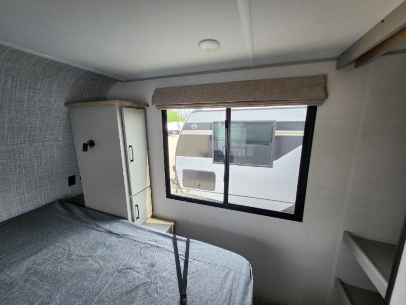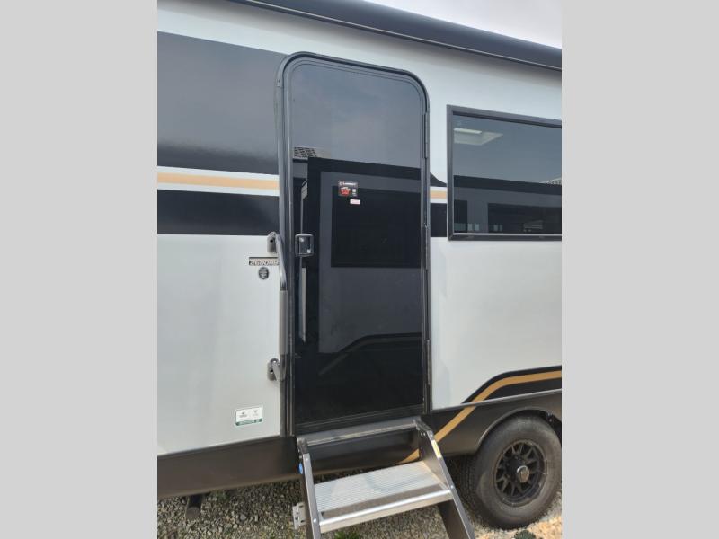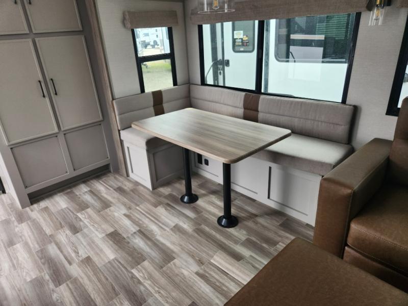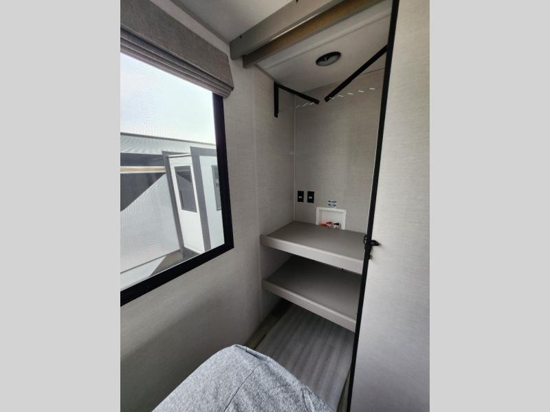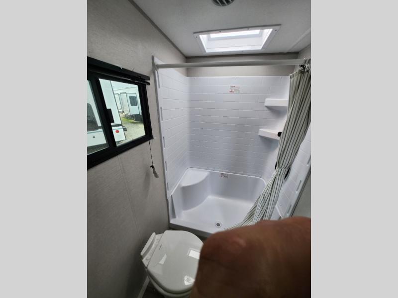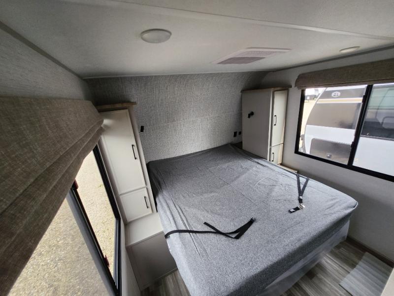 You will love camping every other weekend in this spacious travel trailer. There is a full rear bath with a spacious shower and linen closet for towels and toiletries. Your crew can get comfortable on the theater seating across from the entertainment center, and it even swings open to reveal hidden pantry storage. Easily prepare your meals in the kitchen on the three burner cooktop, or in the oven. There is also a 12V refrigerator, plus a microwave for meals on the go. When you're ready to call it a night, the front private bedroom is sure to provide comfort with its custom king bed, wardrobe, and underbed storage.