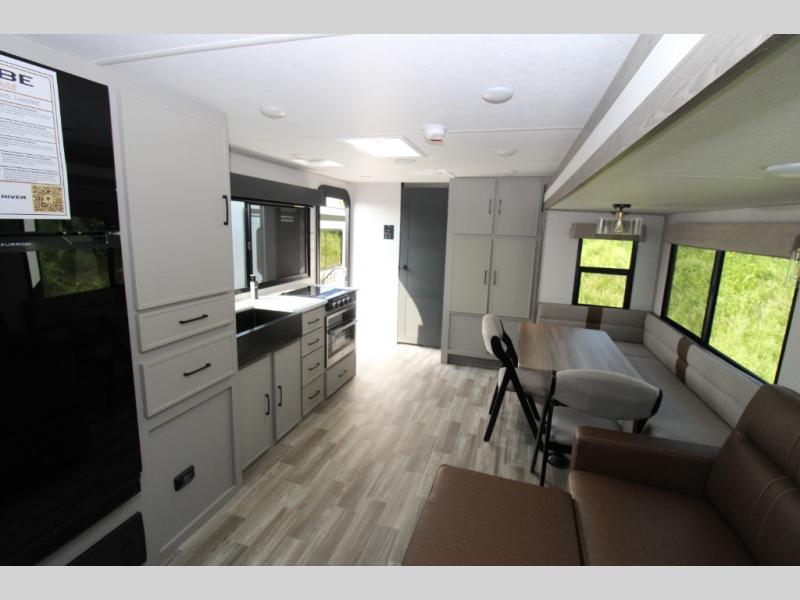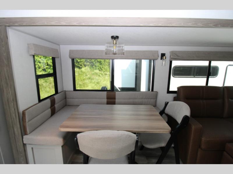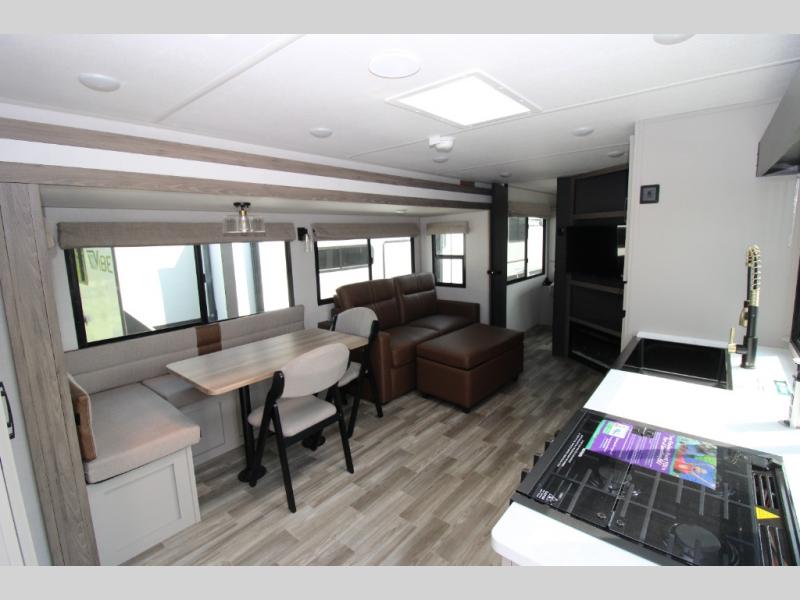 You will love camping every other weekend in this spacious travel trailer. There is a full rear bath with a spacious shower and linen closet for towels and toiletries. Your crew can get comfortable on the theater seating across from the entertainment center, and it even swings open to reveal hidden pantry storage. Easily prepare your meals in the kitchen on the three burner cooktop, or in the oven. There is also a 12V refrigerator, plus a microwave for meals on the go. When you're ready to call it a night, the front private bedroom is sure to provide comfort with its custom king bed, wardrobe, and underbed storage.