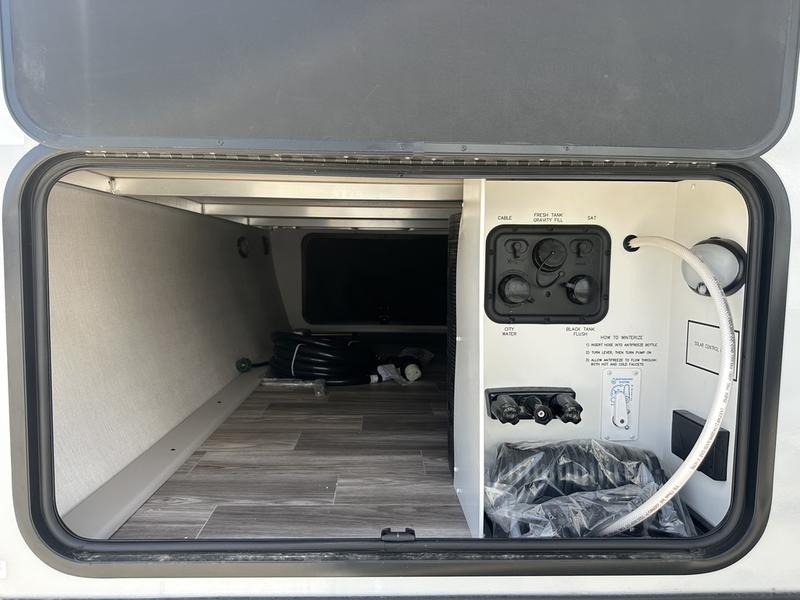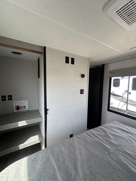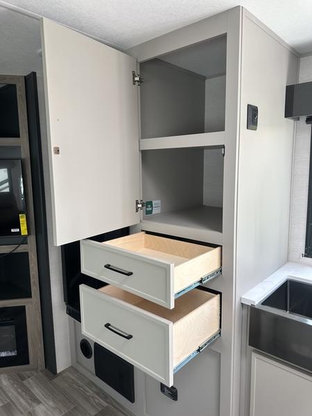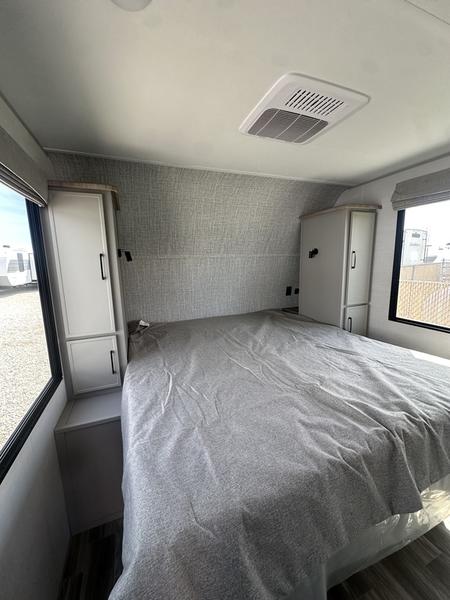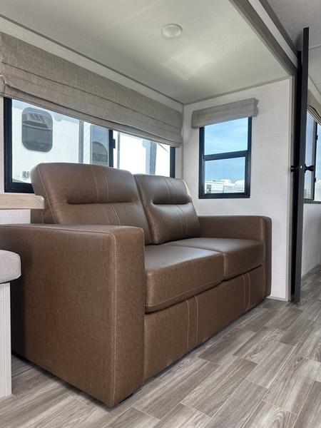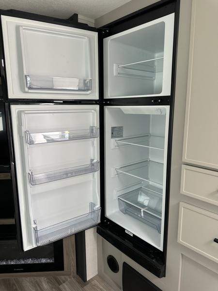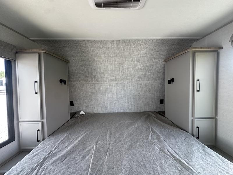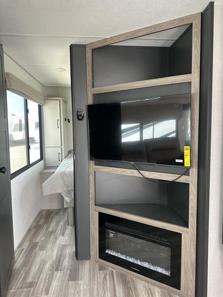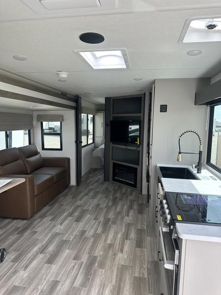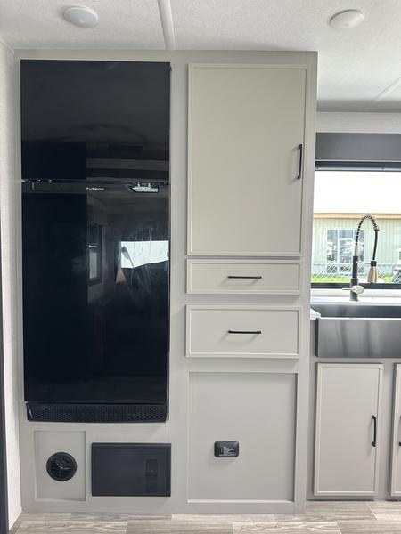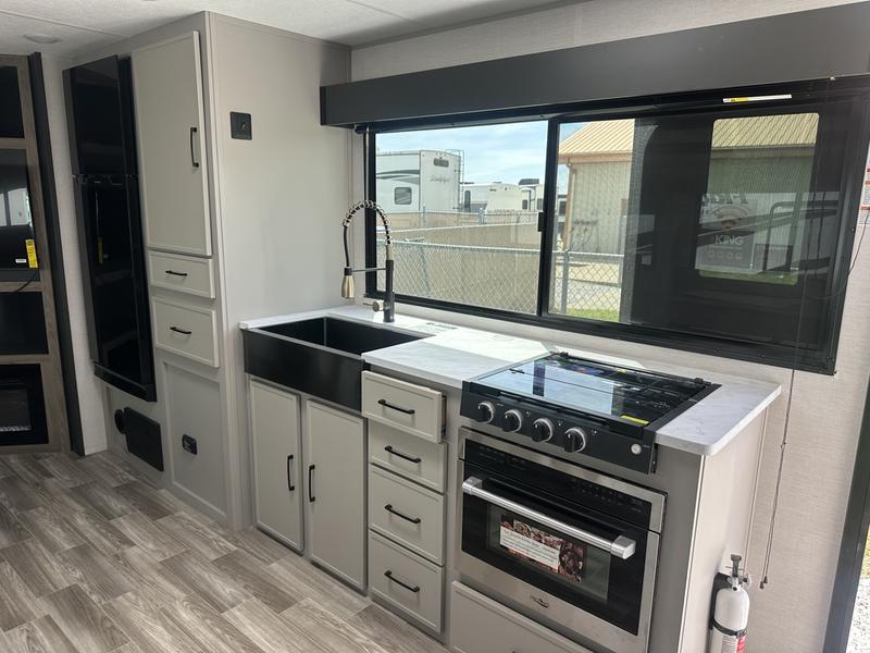 You will love camping every other weekend in this spacious travel trailer. There is a full rear bath with a spacious shower and linen closet for towels and toiletries. Your crew can get comfortable on the theater seating across from the entertainment center, and it even swings open to reveal hidden pantry storage. Easily prepare your meals in the kitchen on the three burner cooktop, or in the oven. There is also a 12V refrigerator, plus a microwave for meals on the go. When you're ready to call it a night, the front private bedroom is sure to provide comfort with its custom king bed, wardrobe, and underbed storage.