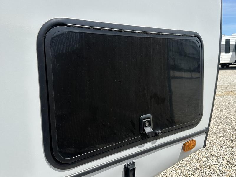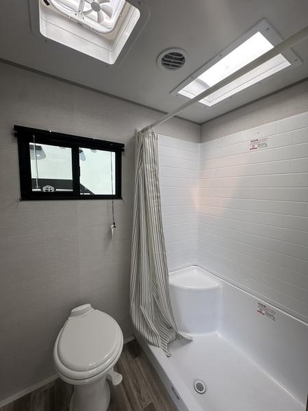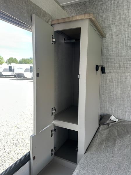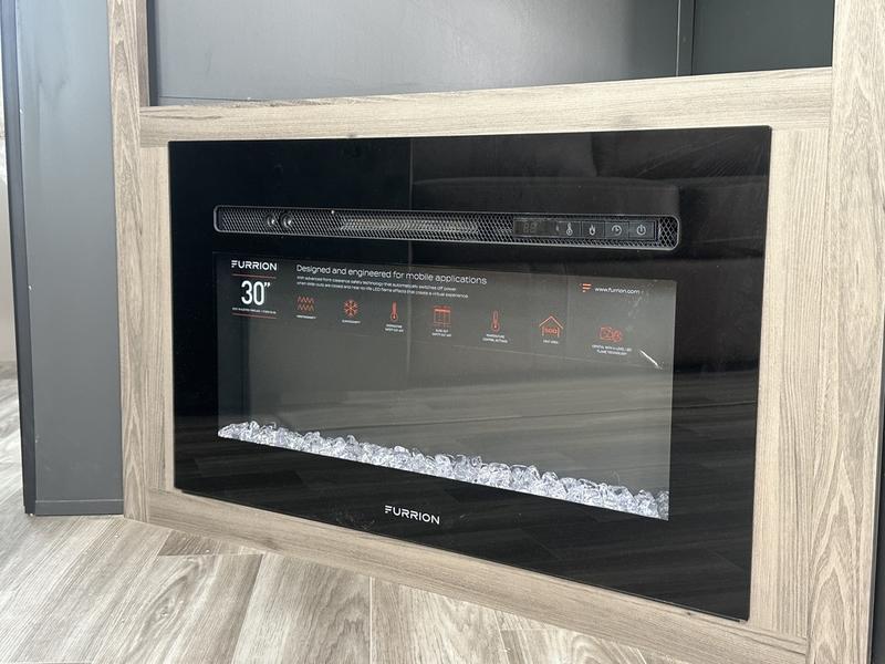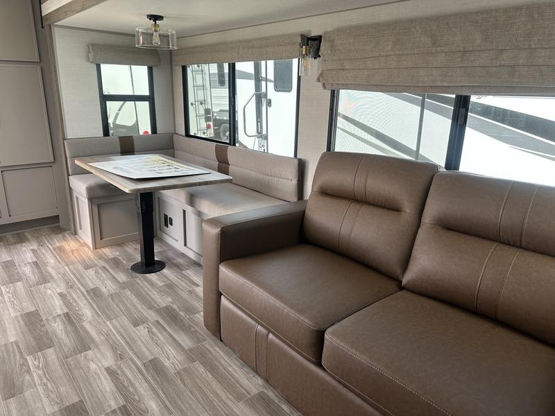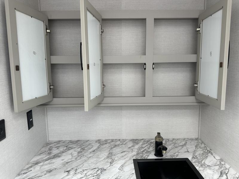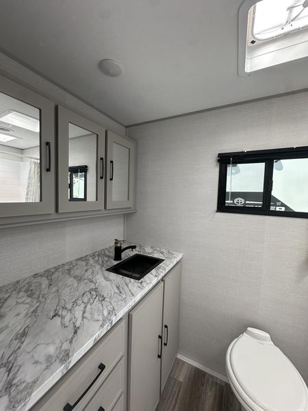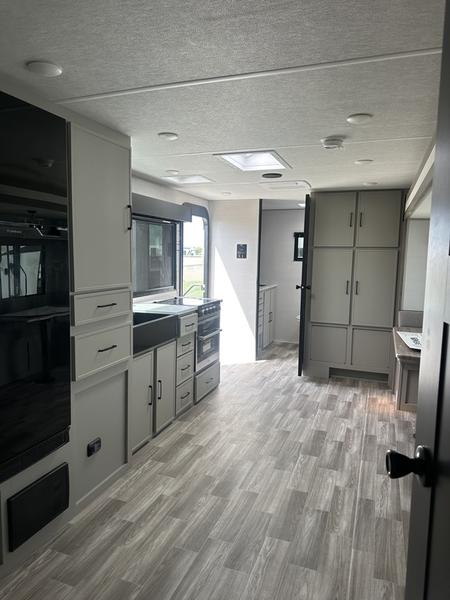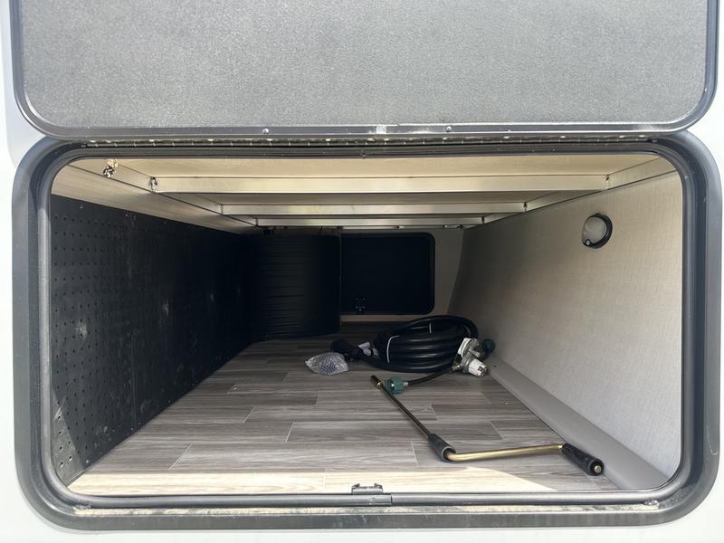 You will love camping every other weekend in this spacious travel trailer. There is a full rear bath with a spacious shower and linen closet for towels and toiletries. Your crew can get comfortable on the theater seating across from the entertainment center, and it even swings open to reveal hidden pantry storage. Easily prepare your meals in the kitchen on the three burner cooktop, or in the oven. There is also a 12V refrigerator, plus a microwave for meals on the go. When you're ready to call it a night, the front private bedroom is sure to provide comfort with its custom king bed, wardrobe, and underbed storage.