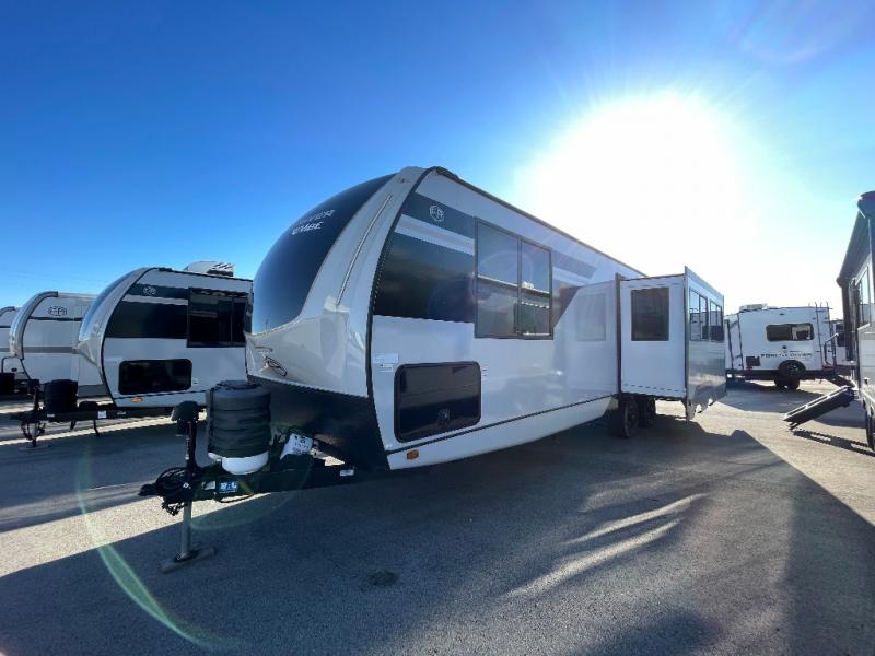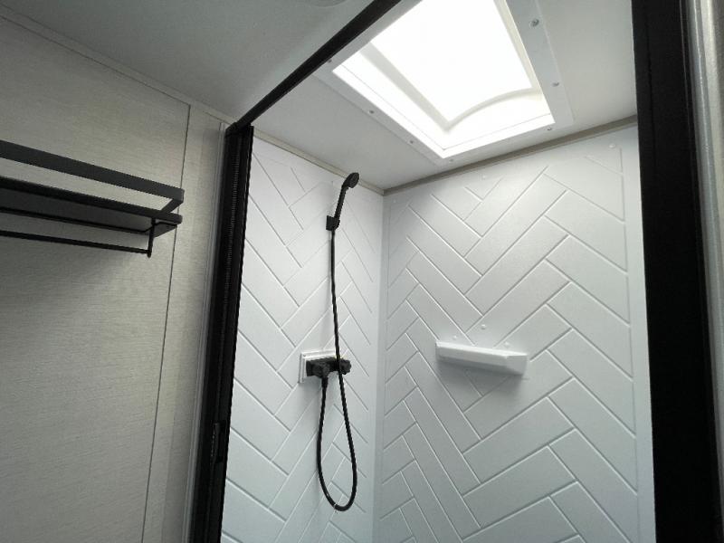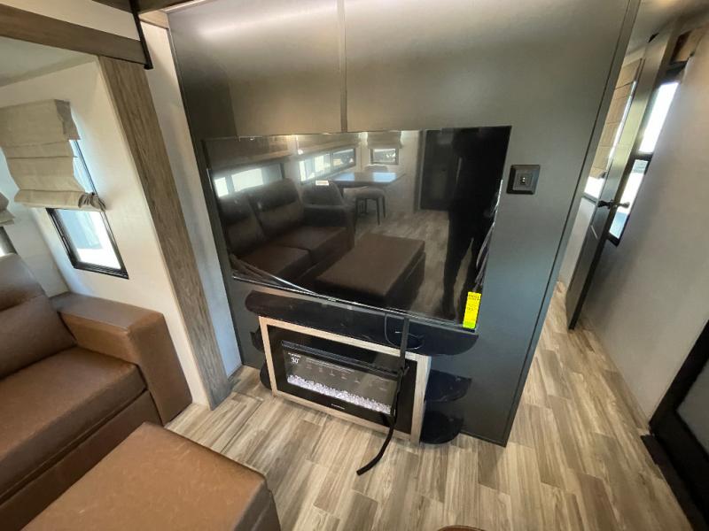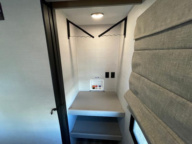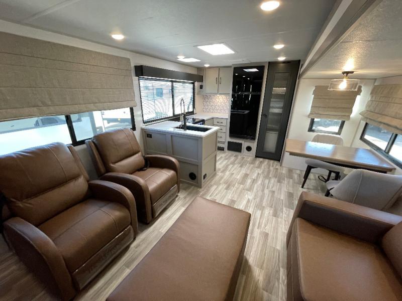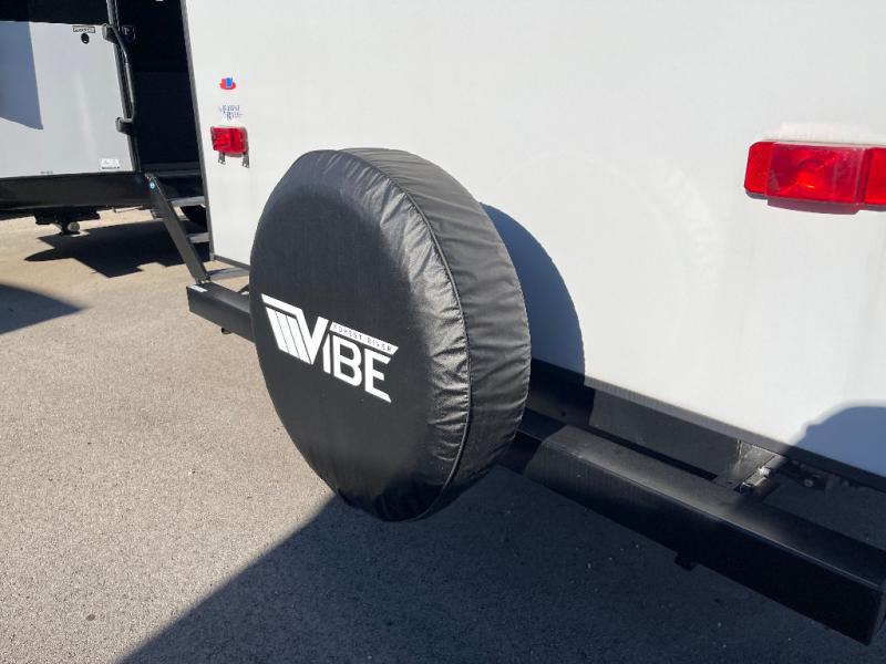 Escape to the great outdoors in this Vibe travel trailer. Once you arrive at your campsite, set up the 20' electric awning with LED lights, then grab the fishing poles from the large pass-through storage. You may want to make a quick lunch on the universal outside kitchen before heading out. If the weather isn't cooperating, you can cook on the three burner cooktop or the oven, and there is even a residential refrigerator to hold all your ingredients. The spacious full bath includes a 36" x 30" walk-in shower to clean up every day, and there is a linen closet to store clean towels and necessities.