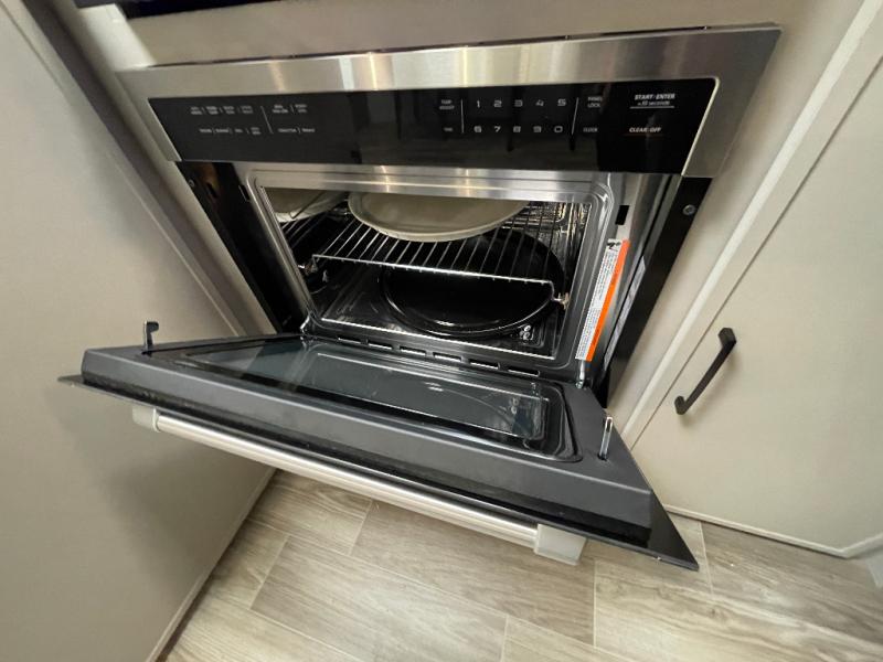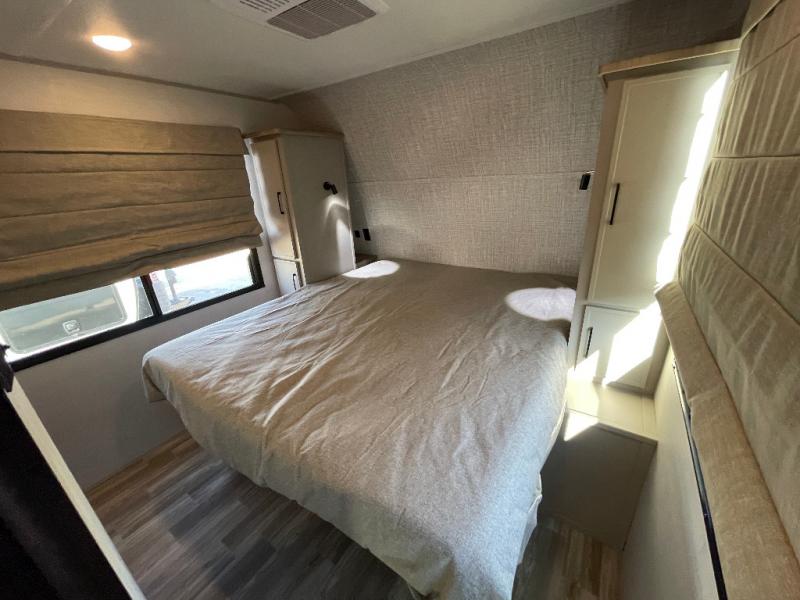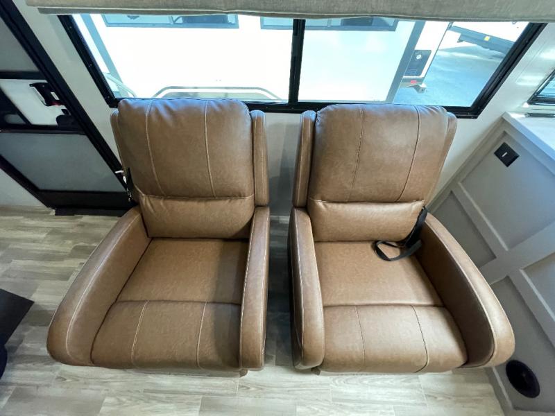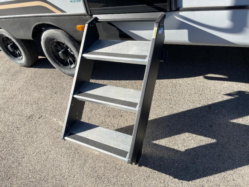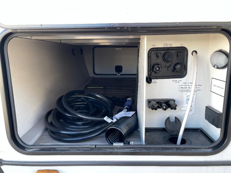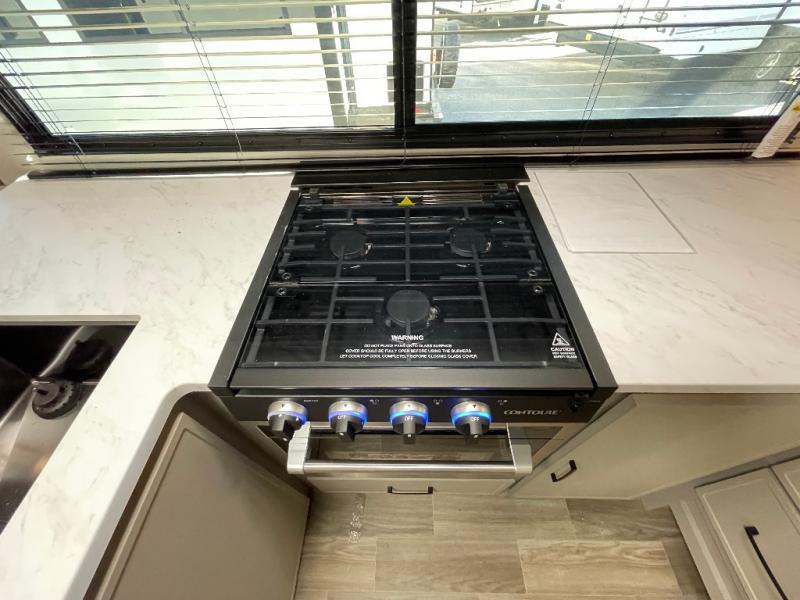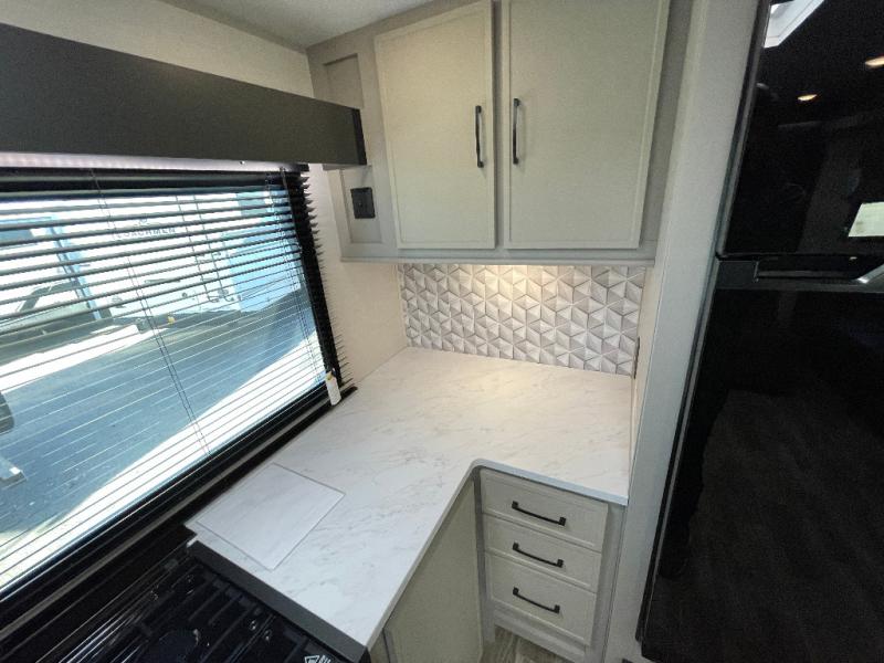Escape to the great outdoors in this Vibe travel trailer. Once you arrive at your campsite, set up the 20' electric awning with LED lights, then grab the fishing poles from the large pass-through storage. You may want to make a quick lunch on the universal outside kitchen before heading out. If the weather isn't cooperating, you can cook on the three burner cooktop or the oven, and there is even a residential refrigerator to hold all your ingredients. The spacious full bath includes a 36" x 30" walk-in shower to clean up every day, and there is a linen closet to store clean towels and necessities.