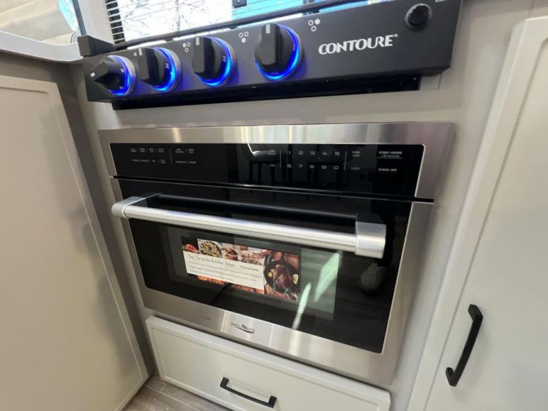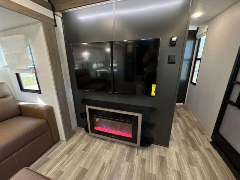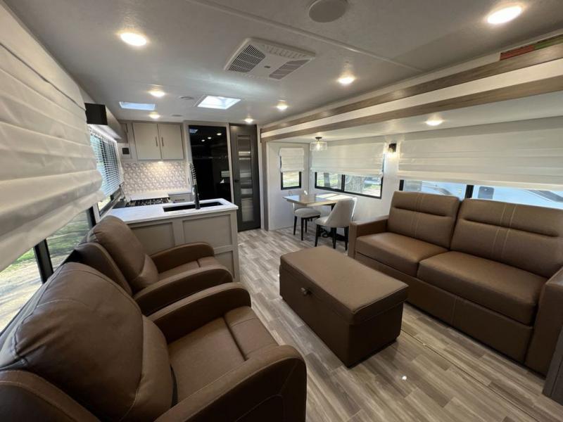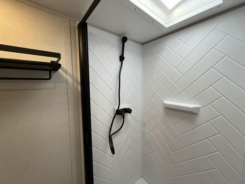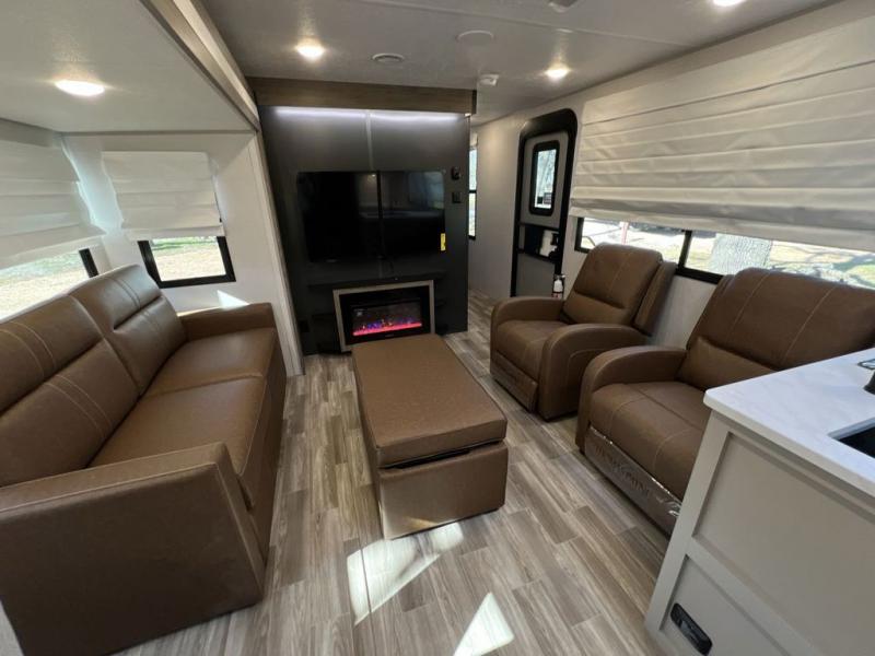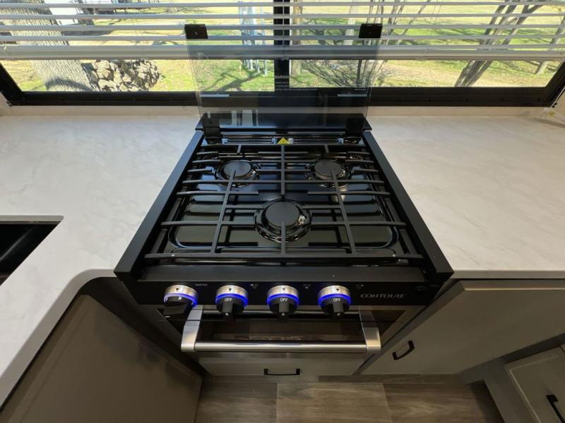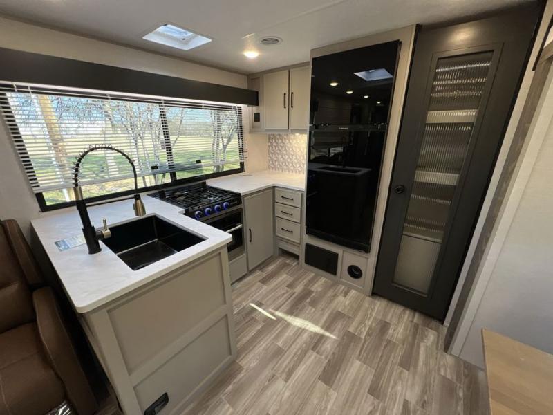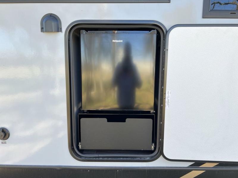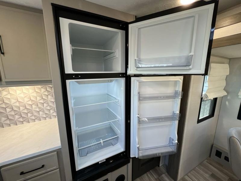 Escape to the great outdoors in this Vibe travel trailer. Once you arrive at your campsite, set up the 20' electric awning with LED lights, then grab the fishing poles from the large pass-through storage. You may want to make a quick lunch on the universal outside kitchen before heading out. If the weather isn't cooperating, you can cook on the three burner cooktop or the oven, and there is even a residential refrigerator to hold all your ingredients. The spacious full bath includes a 36" x 30" walk-in shower to clean up every day, and there is a linen closet to store clean towels and necessities.