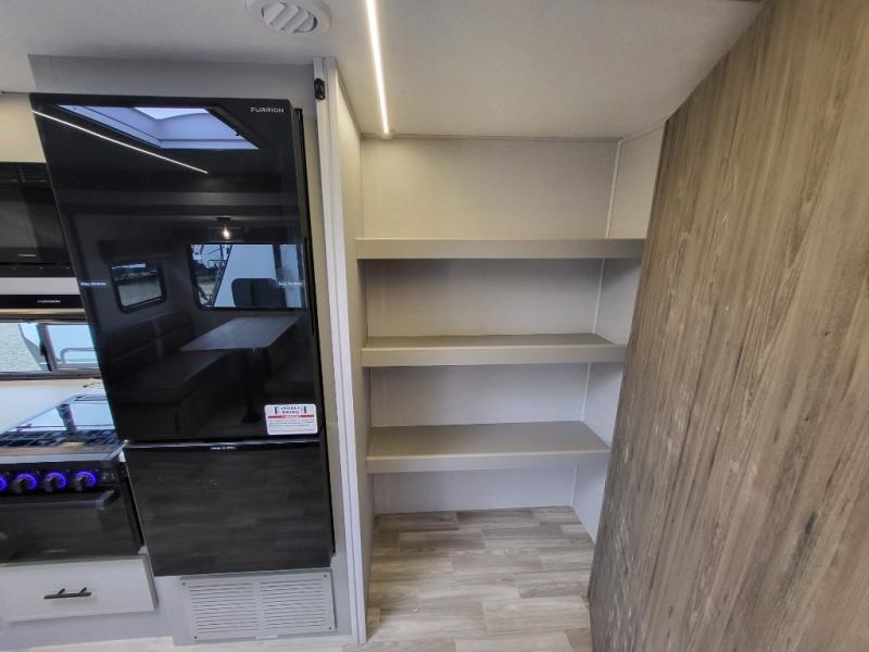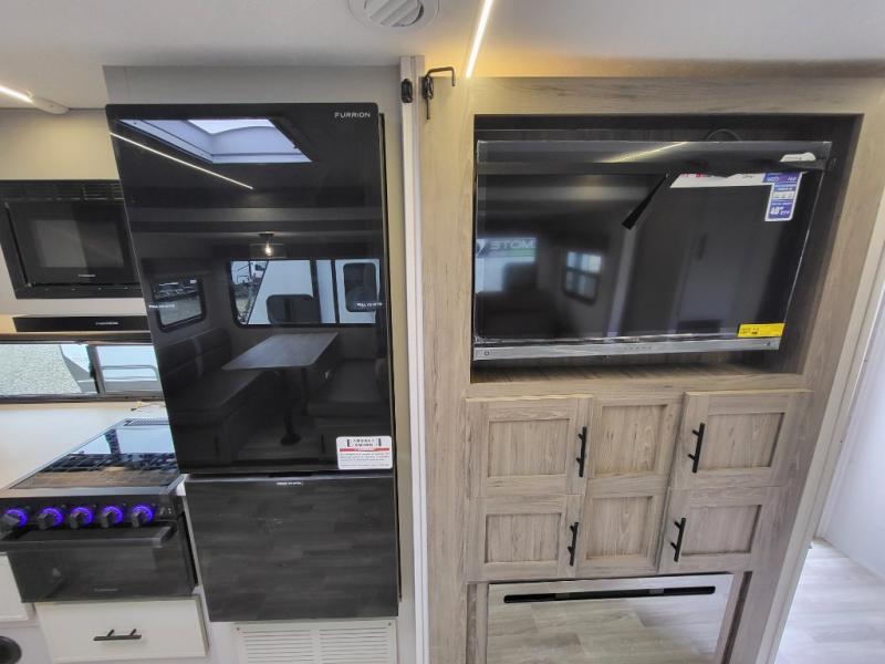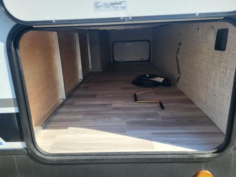 You'll love the amount of interior space you have in this travel trailer thanks to the large slide out in the main living area. There is also a skylight here so the chef will have natural light when cooking and an entertainment center that swings open to reveal the hidden storage with shelves. This model is also pet friendly thanks to the linoleum throughout. The full rear bath means you won't have to use the camp's facilities, and the front bedroom with a queen bed will have you feeling right at home. There is also underbed storage for your belongings, dual wardrobes, and an overhead cabinet for books. Head outdoors to enjoy the 20' power awning with LED lights and exterior grill!