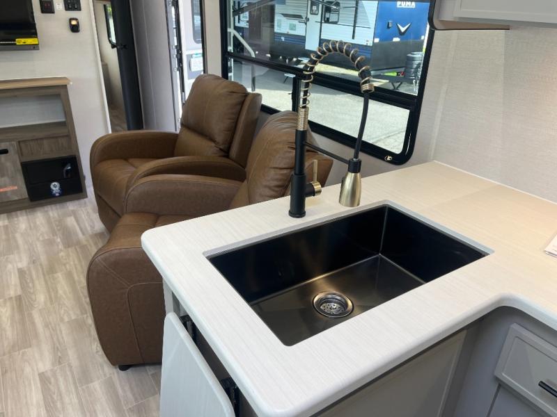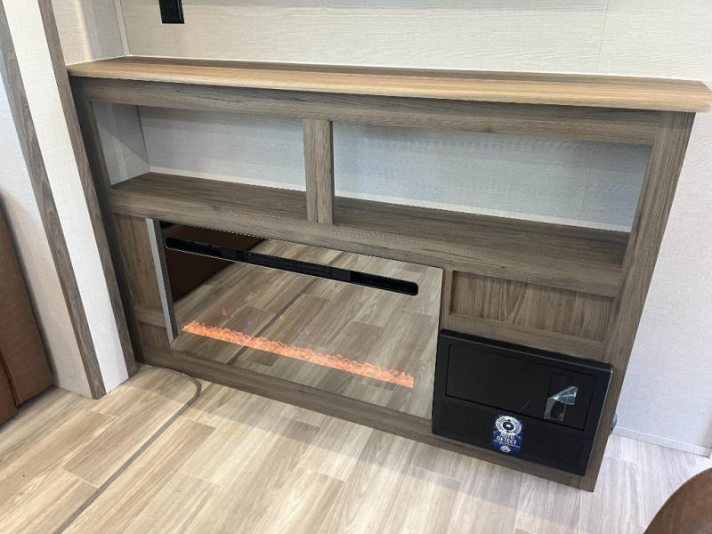 Escape to the great outdoors in this Vibe travel trailer. Once you arrive at your campsite, set up the 20' electric awning with LED lights, then grab the fishing poles from the large pass-through storage. You may want to make a quick lunch on the three burner cooktop before heading out. When you get home, relax on the sleeper sofa or the recliner chairs by the entertainment center with fireplace. The spacious full bath includes a 36" x 30" walk-in shower to clean up every day, and there is a linen closet to store clean towels and necessities.