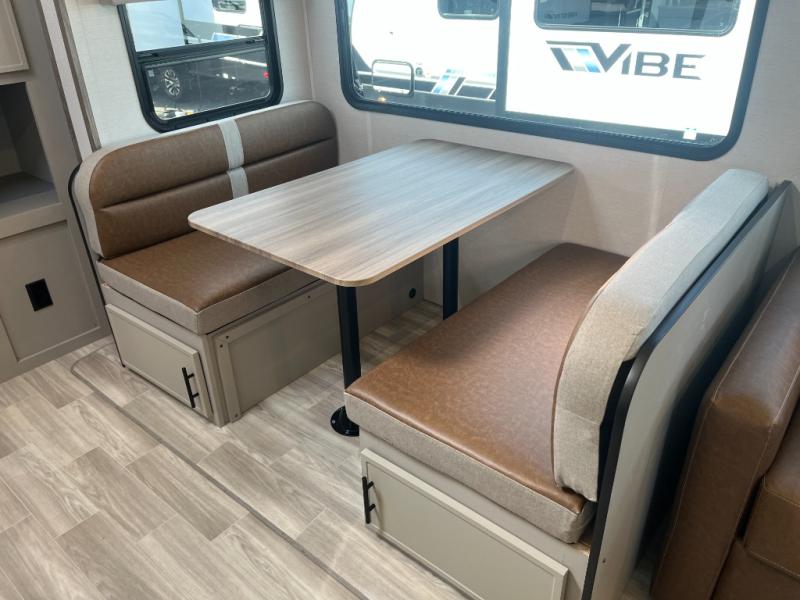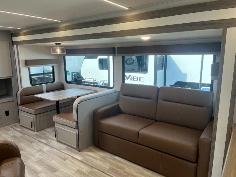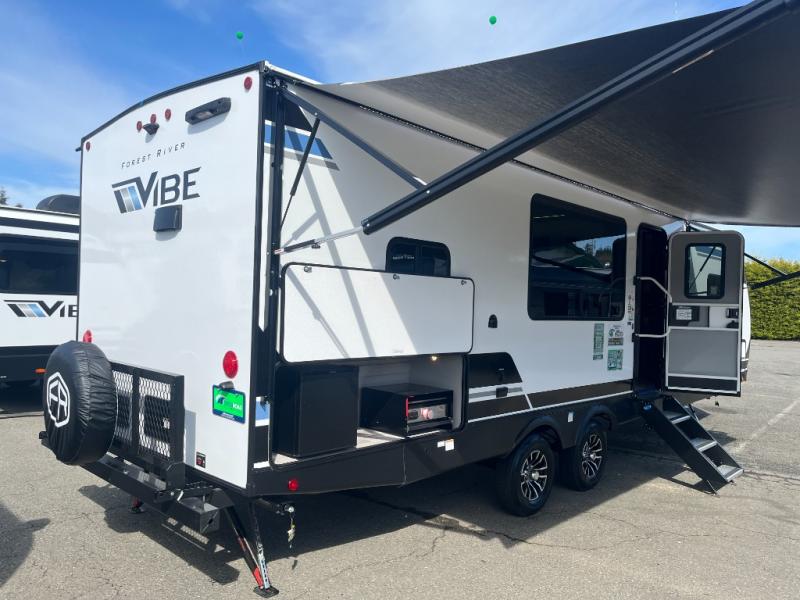 Each Vibe travel trailer by Forest River includes Hyper Lyte construction and a durable laminated "Aluma Frame" for years of use. The heated and enclosed underbelly allows you to extend your camping season, and the walk-on truss roof with XTRM PVC roofing will be easy to keep clean. Inside, you'll enjoy best-in-class panoramic windows, a 12V oversized refrigerator, plus screwed and glued cabinets with residential steel ball bearing drawer guides on all drawers. These models also include cable and satellite prep and a digital TV antenna with a booster so you can stay connected to the outside world if you choose. Make the easy choice and choose a Vibe travel trailer today!