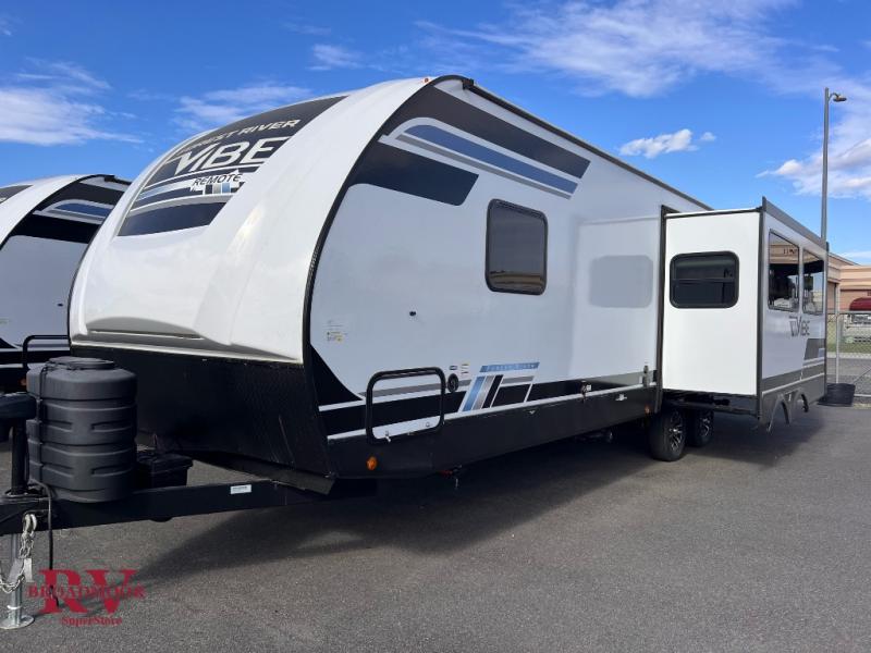 Each Vibe travel trailer by Forest River includes Hyper Lyte construction and a durable laminated "Aluma Frame" for years of use. The heated and enclosed underbelly allows you to extend your camping season, and the walk-on truss roof with XTRM PVC roofing will be easy to keep clean. Inside, you'll enjoy the custom built cabinetry, solid surface thermofoil wrapped kitchen countertops, and ultra bright LED lighting throughout. These models also include cable and satellite prep and a digital TV antenna with a booster so you can stay connected to the outside world if you choose. Make the easy choice and choose a Vibe travel trailer today!