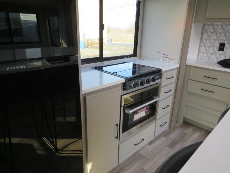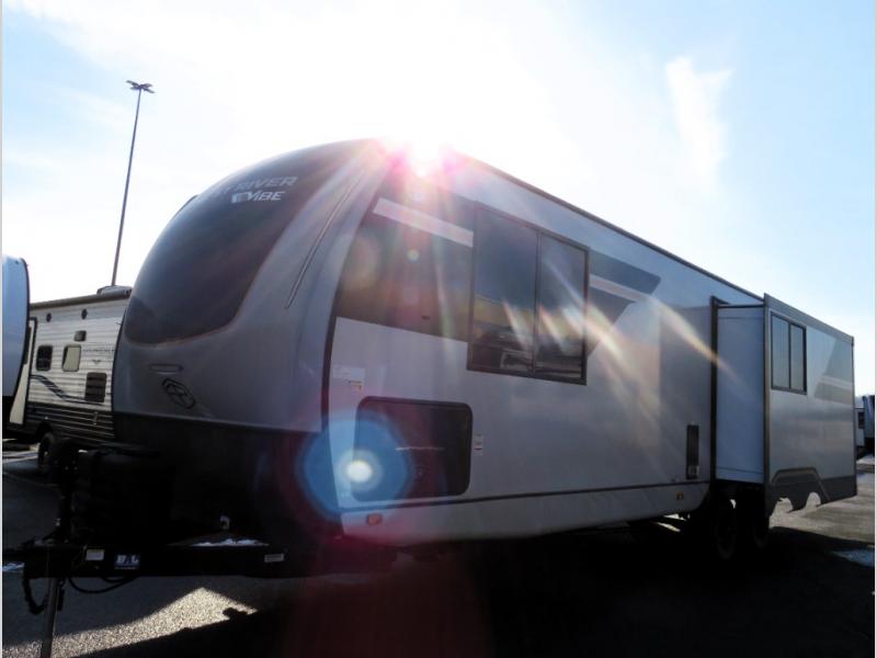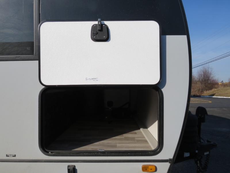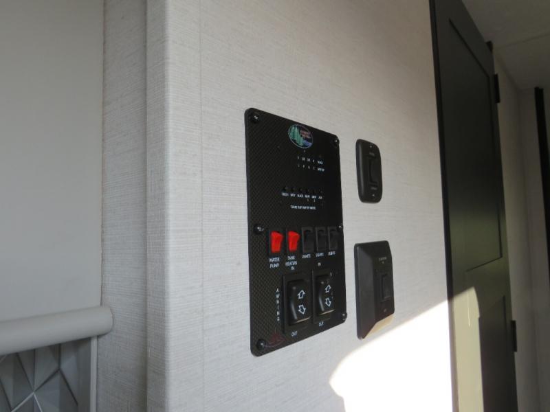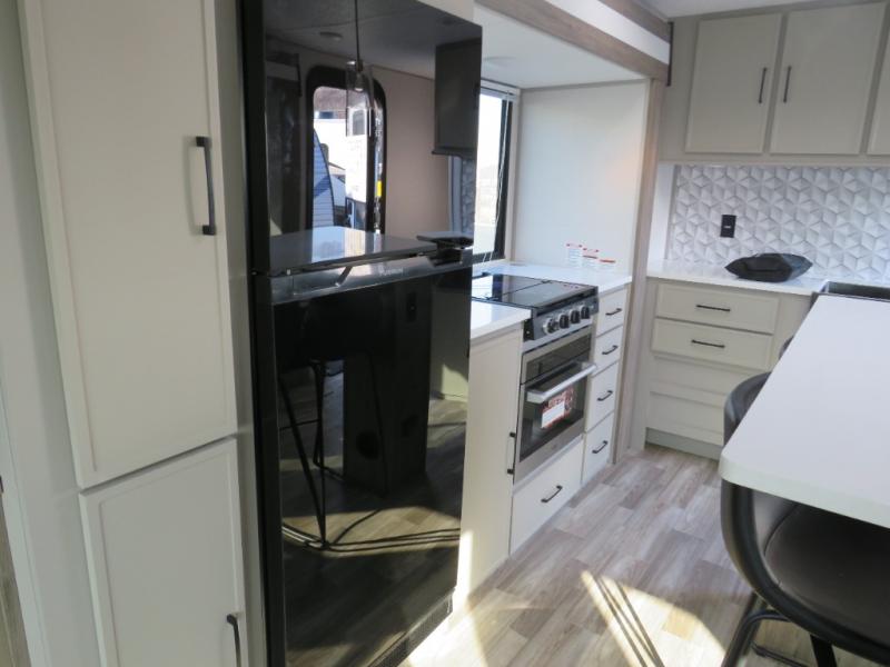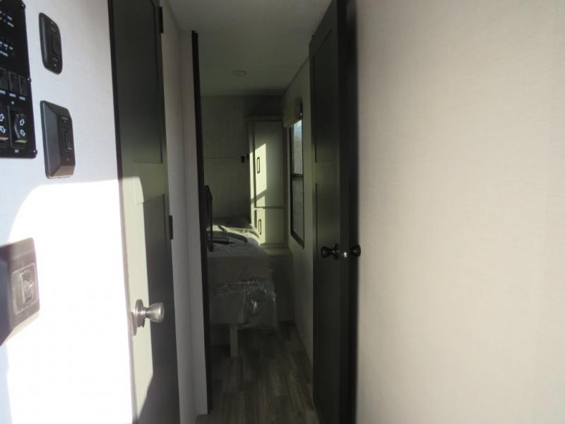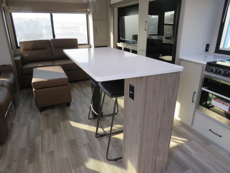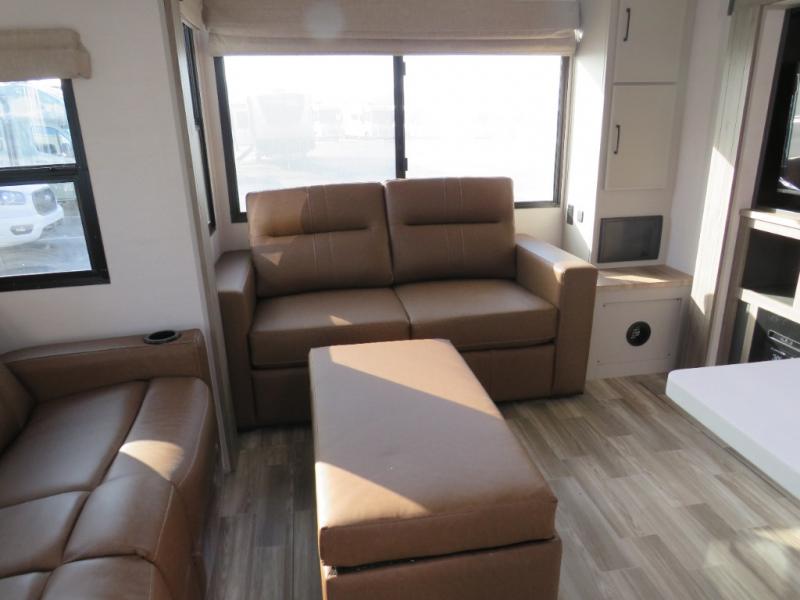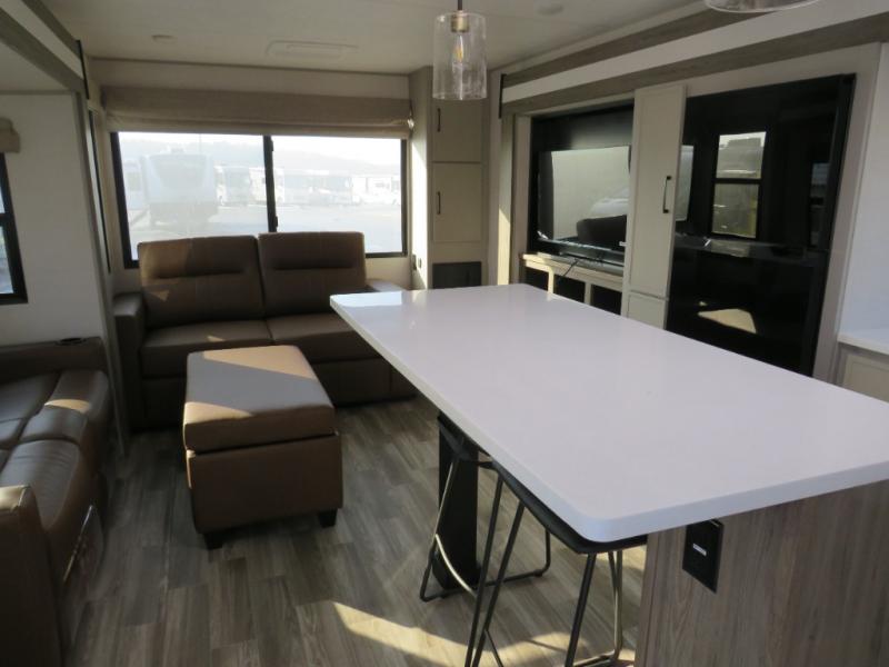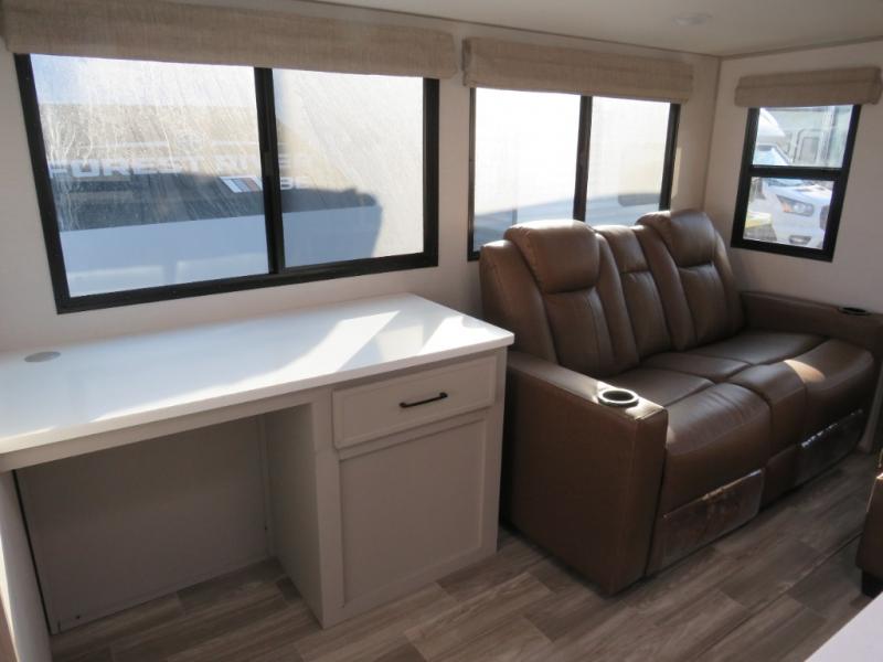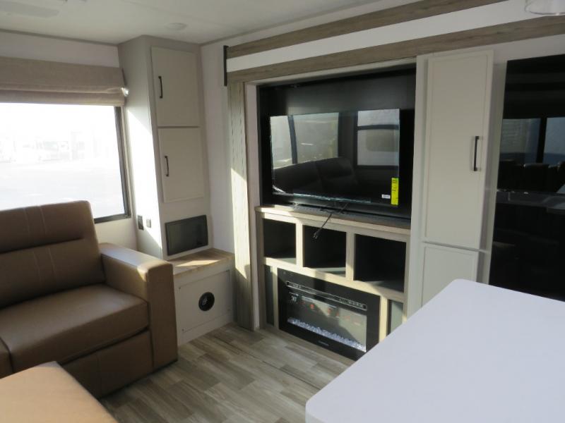 This travel trailer allows you to enjoy the great outdoors without having to give up your creature comforts. The dual opposing slides provide the chef space to work around the kitchen island, and there is plenty of seating space for your guests on the theater seating or the sleeper sofa, plus there's a desk area with chair so you can work on the go. The fireplace with TV above will be perfect for those rainy days, and there is even a large skylight to let natural light into the living room. This model also includes Sure-Step entry steps, pass-through storage, plus two power awnings with LED lights so you can spend more time outdoors with friends and family!