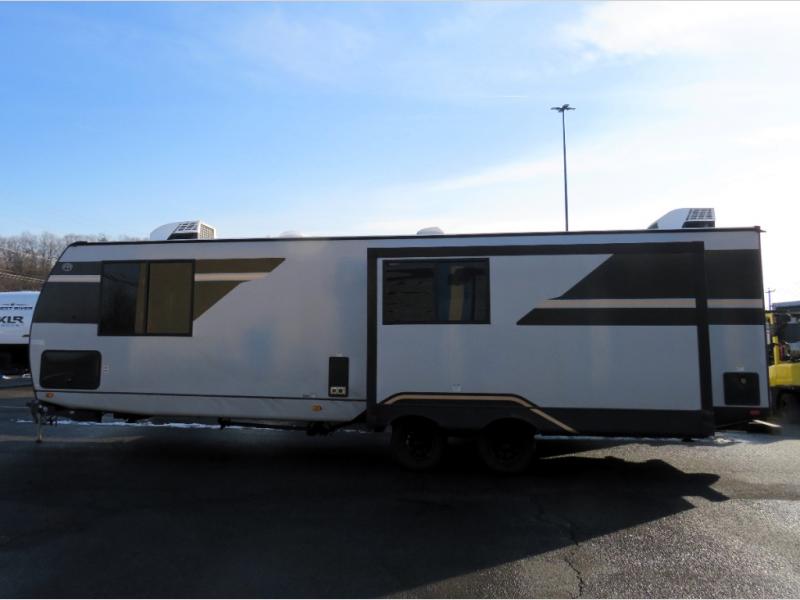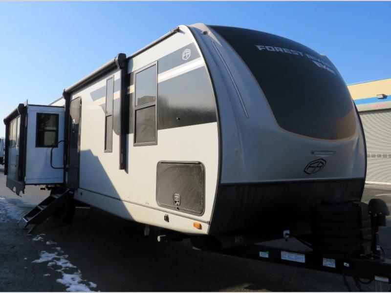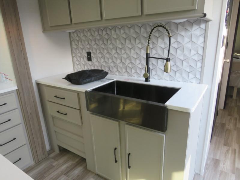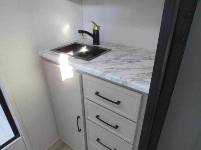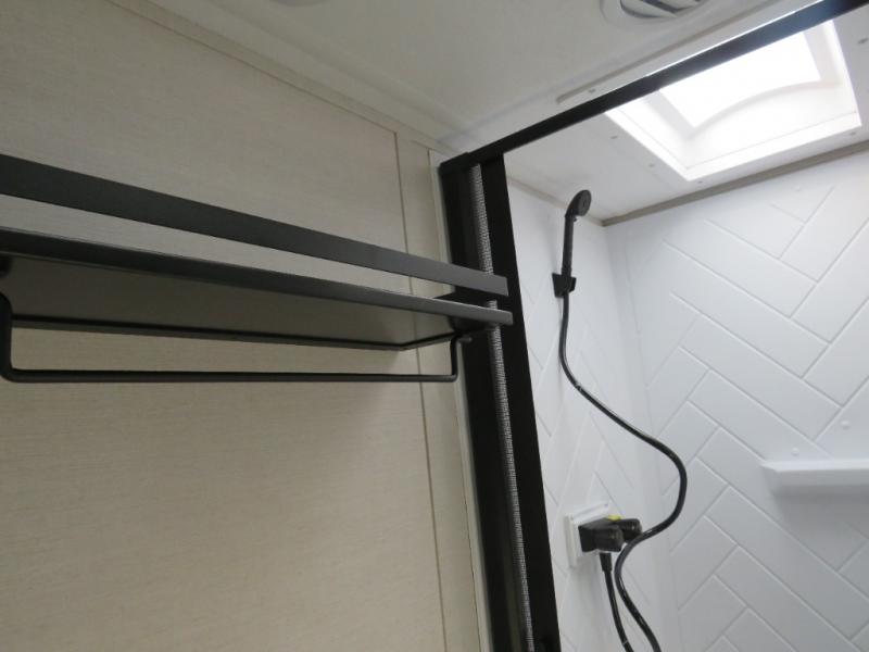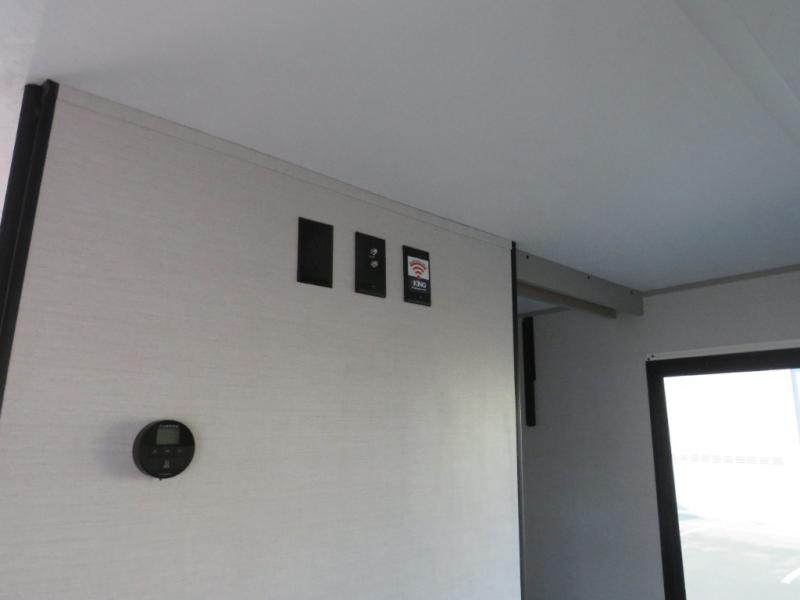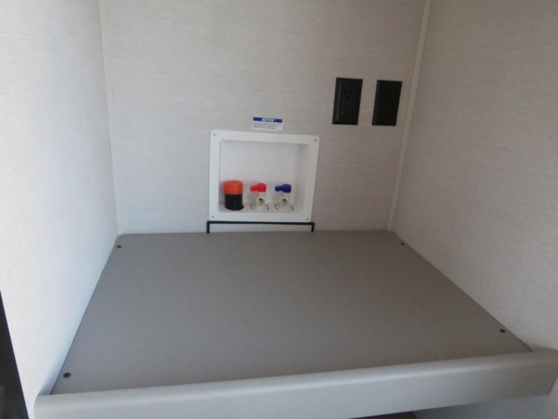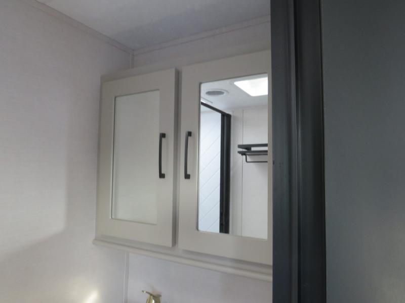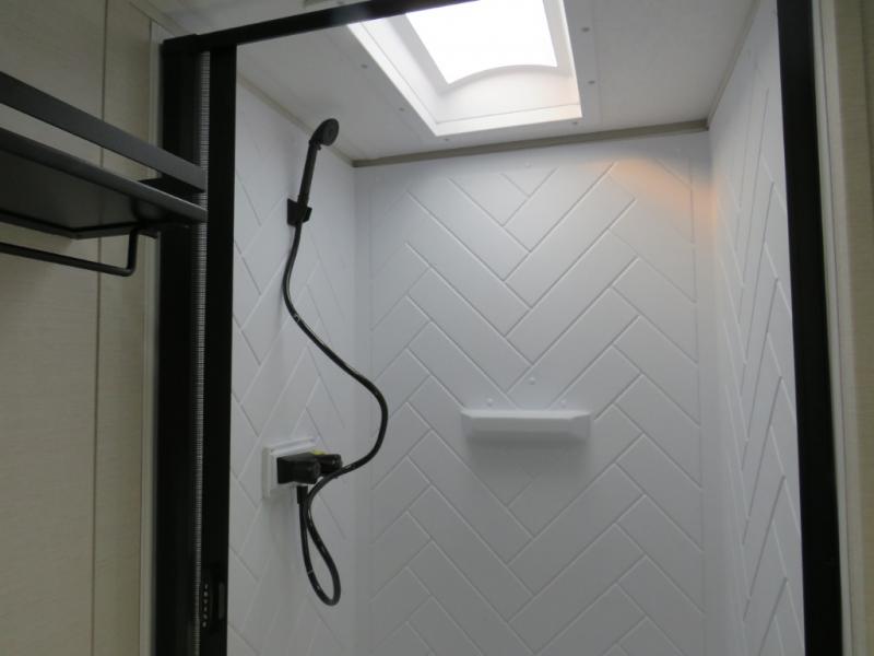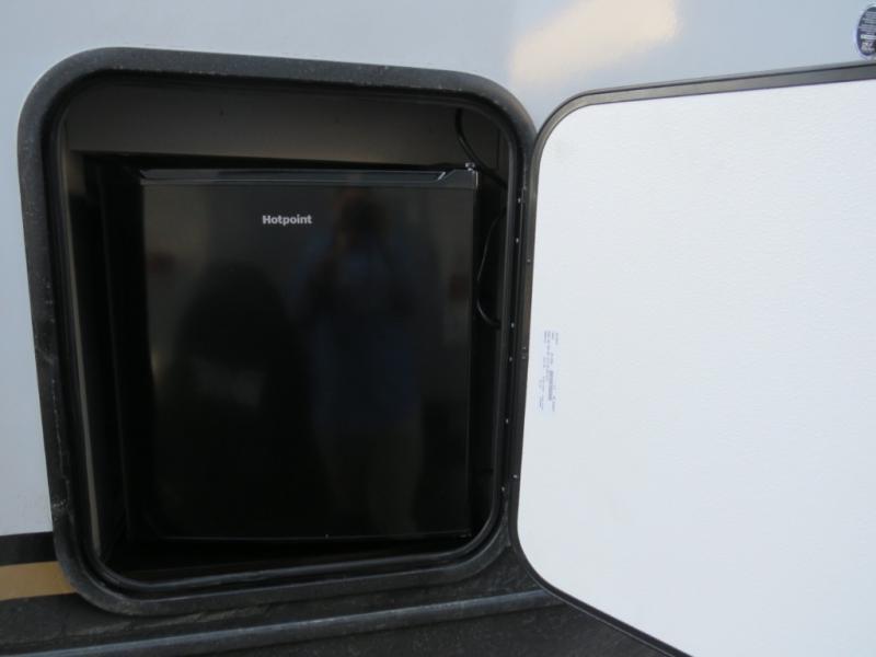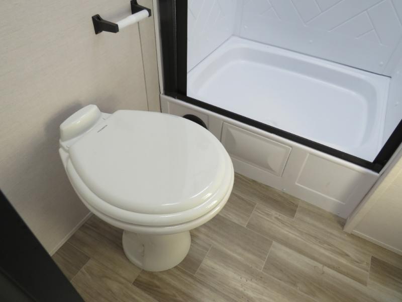 This travel trailer allows you to enjoy the great outdoors without having to give up your creature comforts. The dual opposing slides provide the chef space to work around the kitchen island, and there is plenty of seating space for your guests on the theater seating or the sleeper sofa, plus there's a desk area with chair so you can work on the go. The fireplace with TV above will be perfect for those rainy days, and there is even a large skylight to let natural light into the living room. This model also includes Sure-Step entry steps, pass-through storage, plus two power awnings with LED lights so you can spend more time outdoors with friends and family!