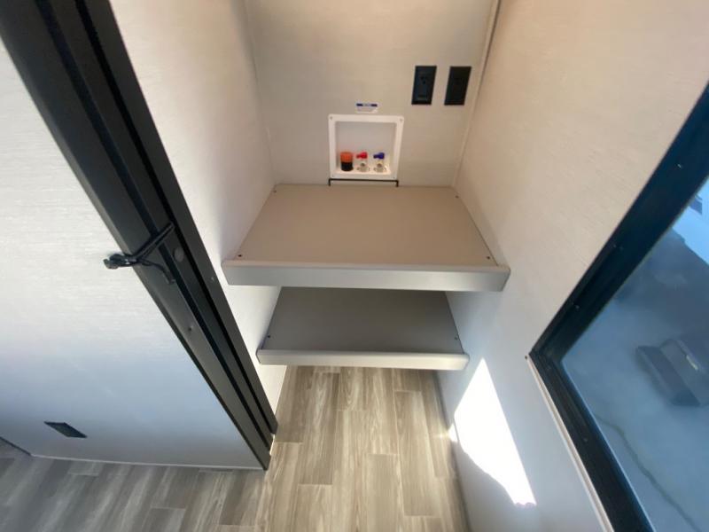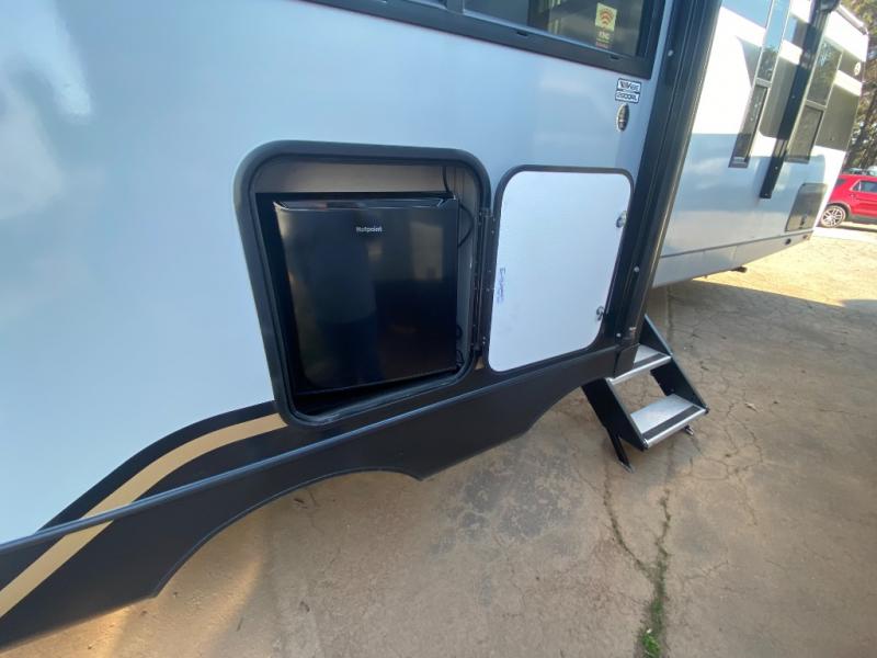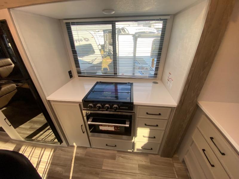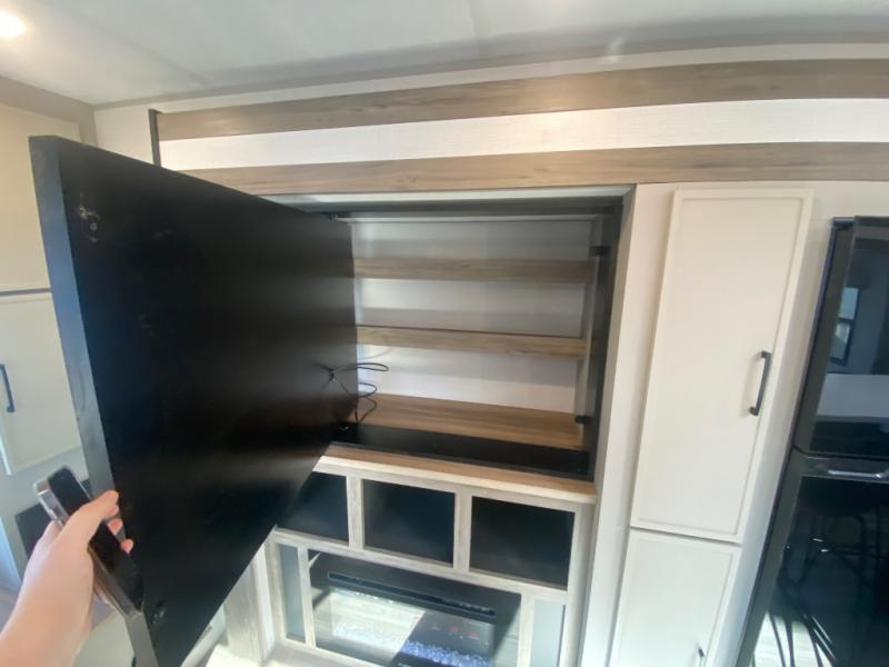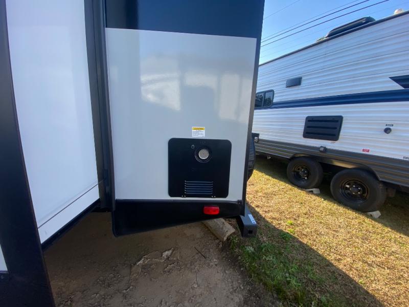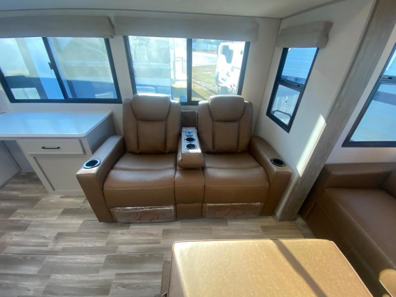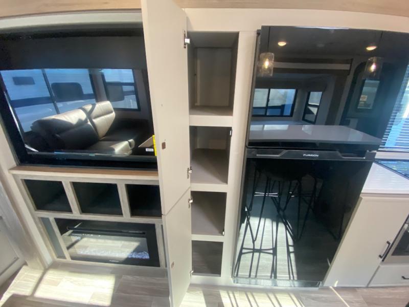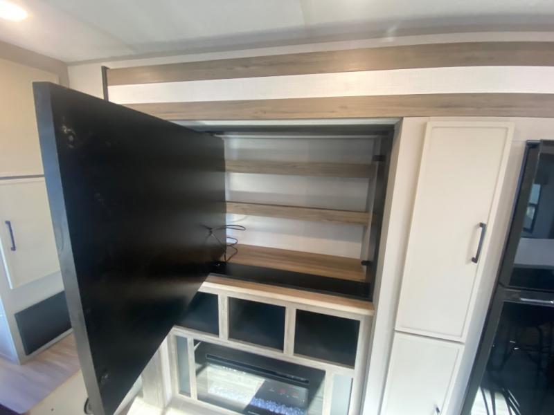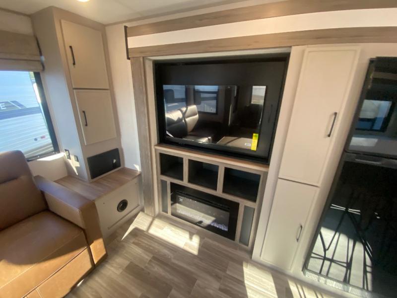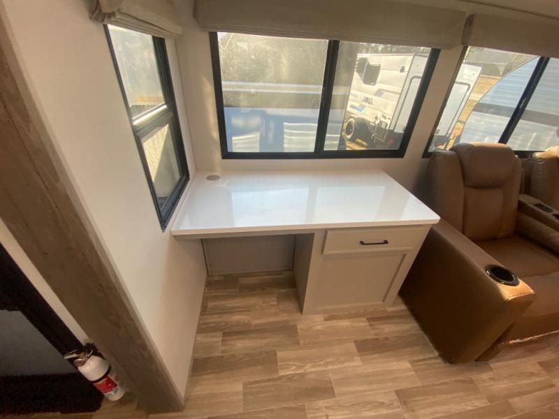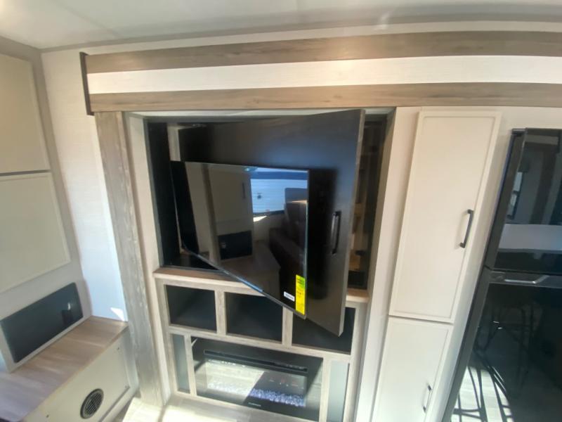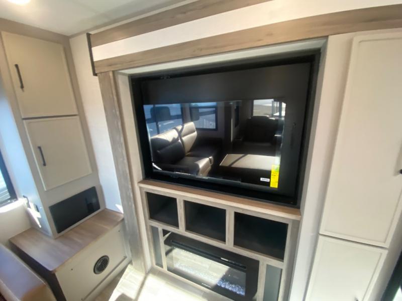This travel trailer allows you to enjoy the great outdoors without having to give up your creature comforts. The dual opposing slides provide the chef space to work around the kitchen island, and there is plenty of seating space for your guests on the theater seating or the sleeper sofa, plus there's a desk area with chair so you can work on the go. The fireplace with TV above will be perfect for those rainy days, and there is even a large skylight to let natural light into the living room. This model also includes Sure-Step entry steps, pass-through storage, plus two power awnings with LED lights so you can spend more time outdoors with friends and family!