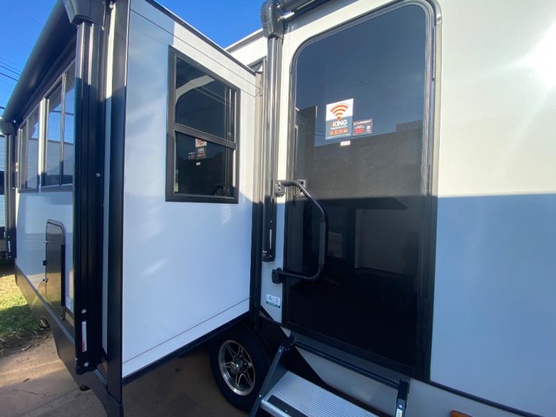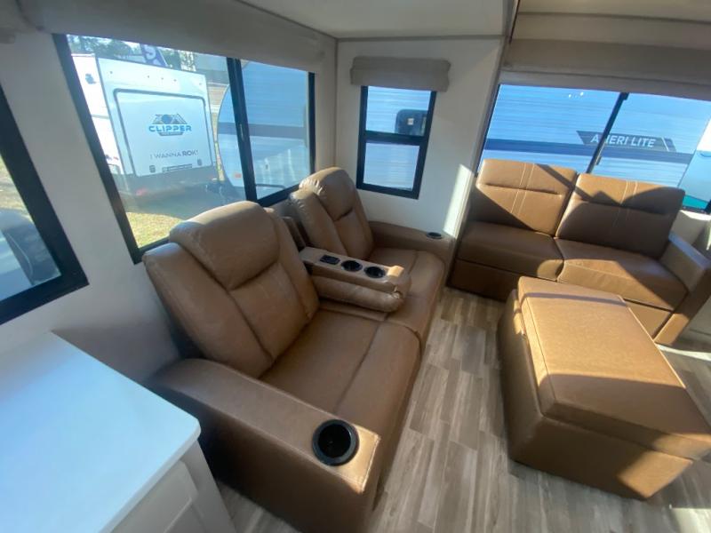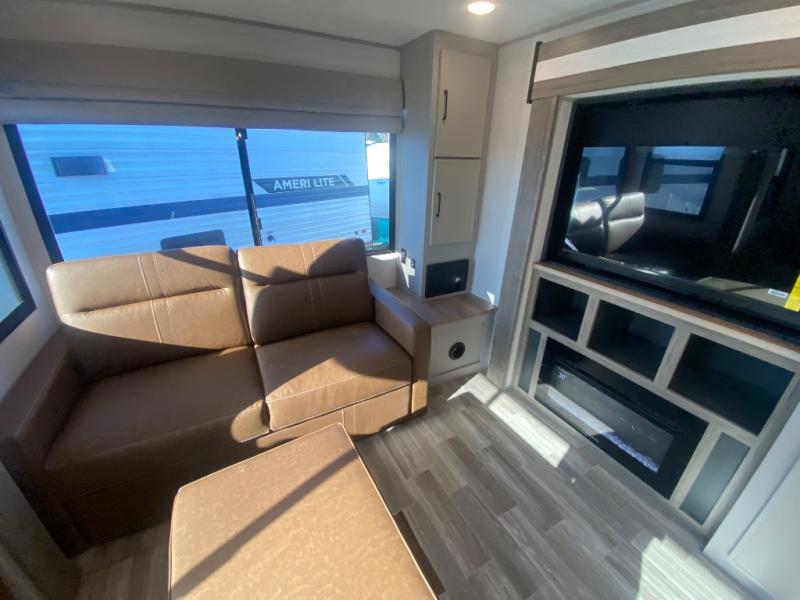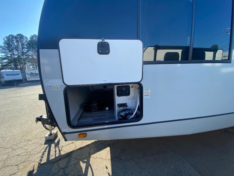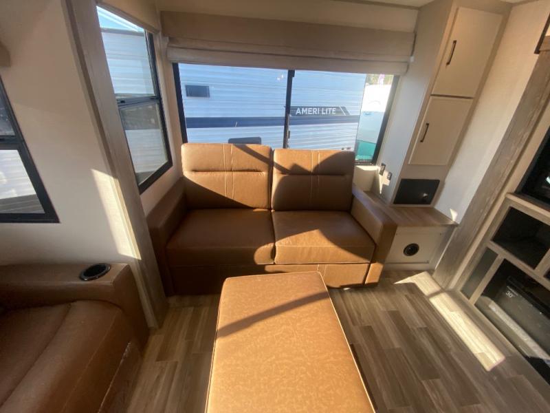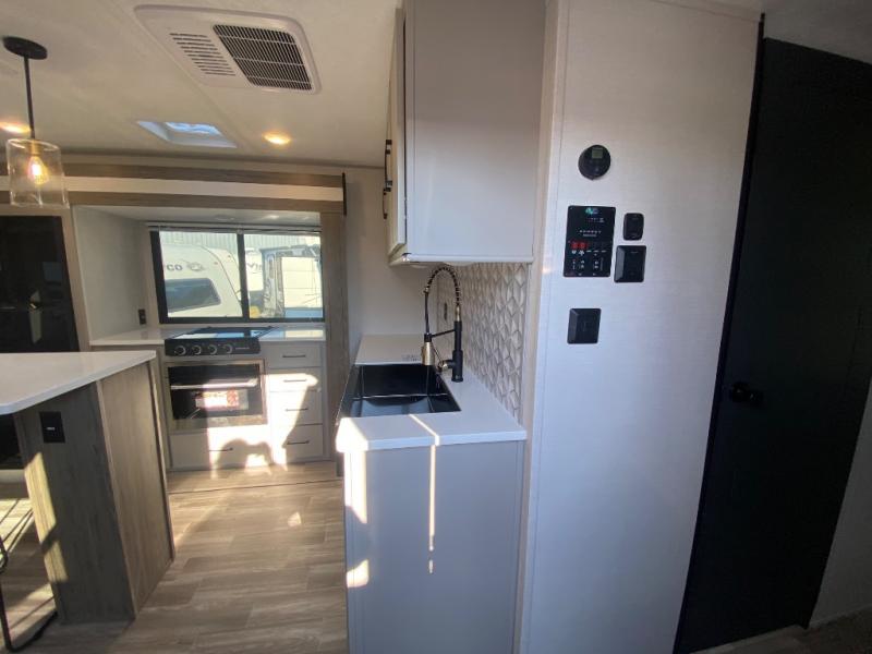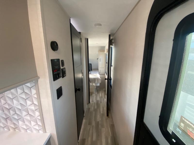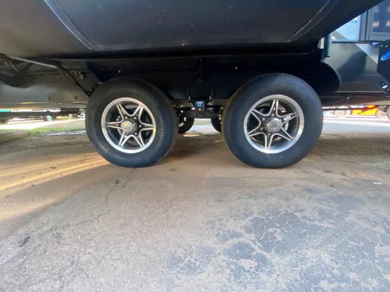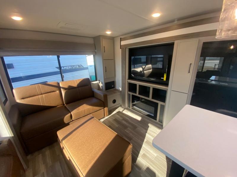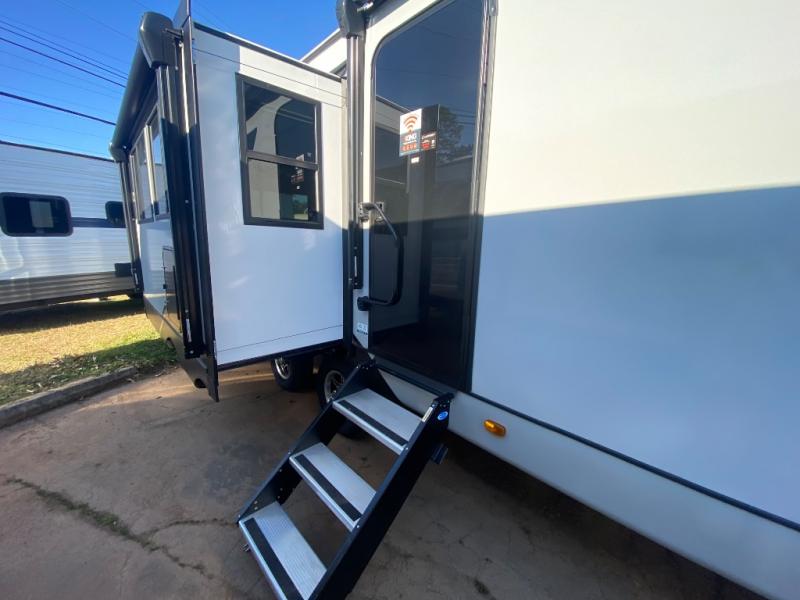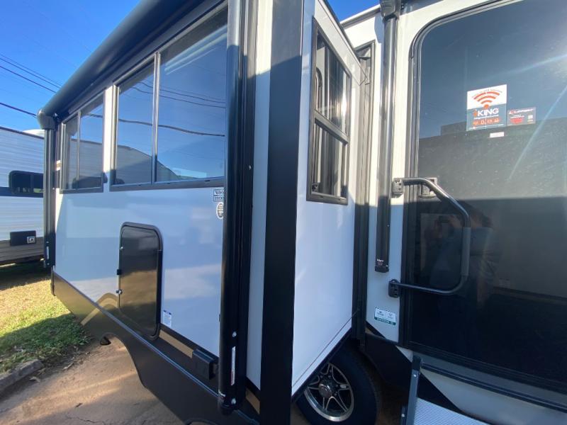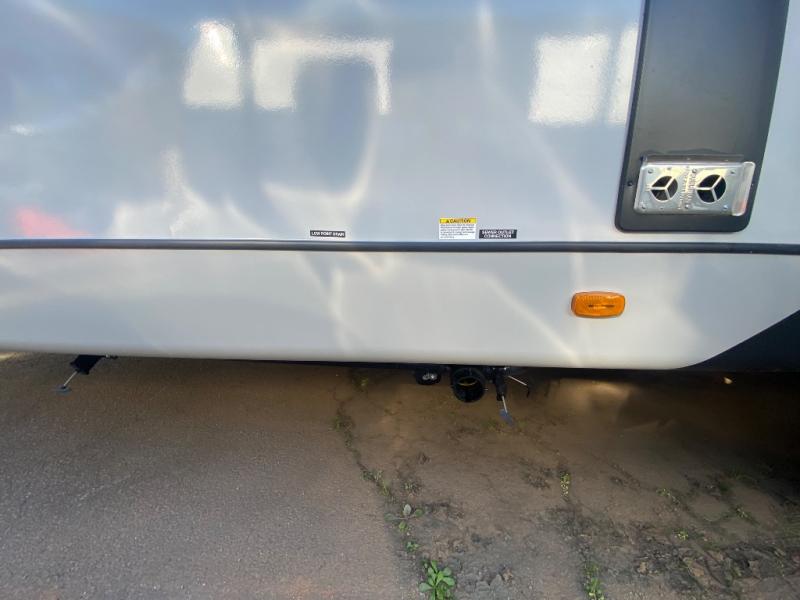 This travel trailer allows you to enjoy the great outdoors without having to give up your creature comforts. The dual opposing slides provide the chef space to work around the kitchen island, and there is plenty of seating space for your guests on the theater seating or the sleeper sofa, plus there's a desk area with chair so you can work on the go. The fireplace with TV above will be perfect for those rainy days, and there is even a large skylight to let natural light into the living room. This model also includes Sure-Step entry steps, pass-through storage, plus two power awnings with LED lights so you can spend more time outdoors with friends and family!